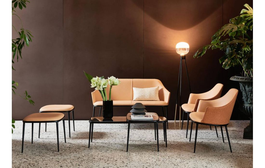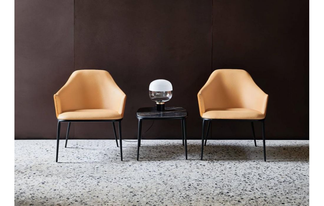 Cadeirão com base de quatro pés em metal, assento e encosto estofados em tecido.Destinatário :
