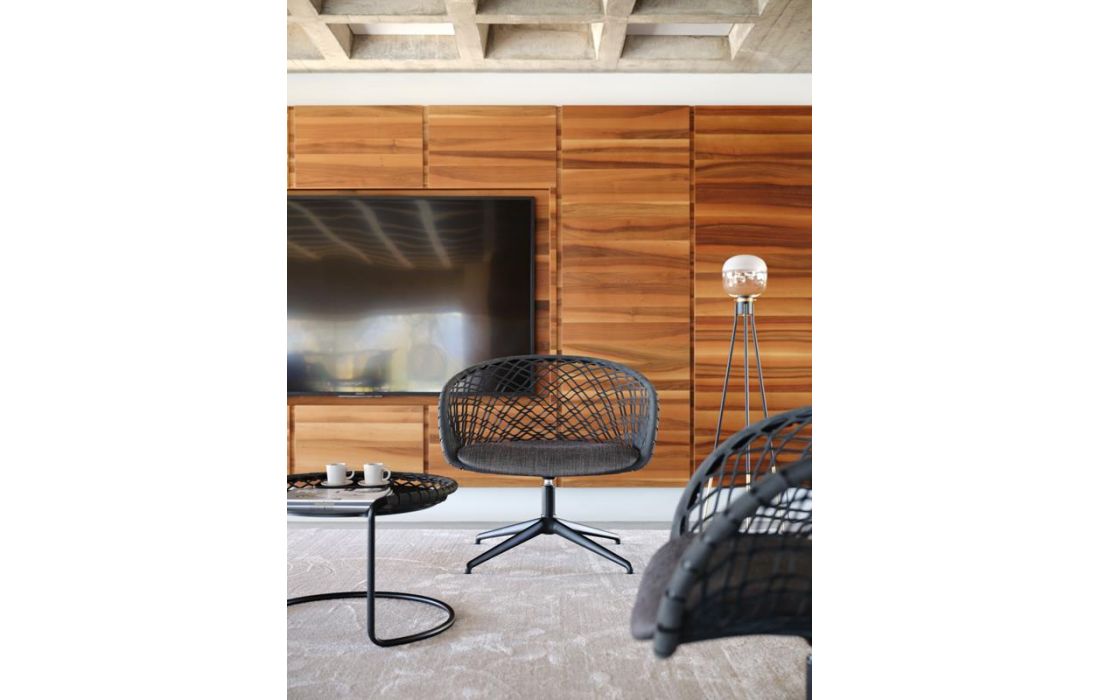 Poltrona giratória com base em cavalete em aço, encosto em pele e assento estofado a tecido.Destinatário :