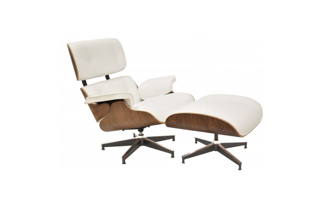 Poltrona com ottoman em pele branca com base de aluminio e estrutura em madeira de nogueiraDestinatário :