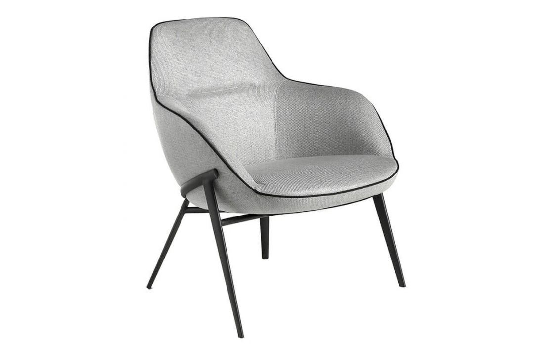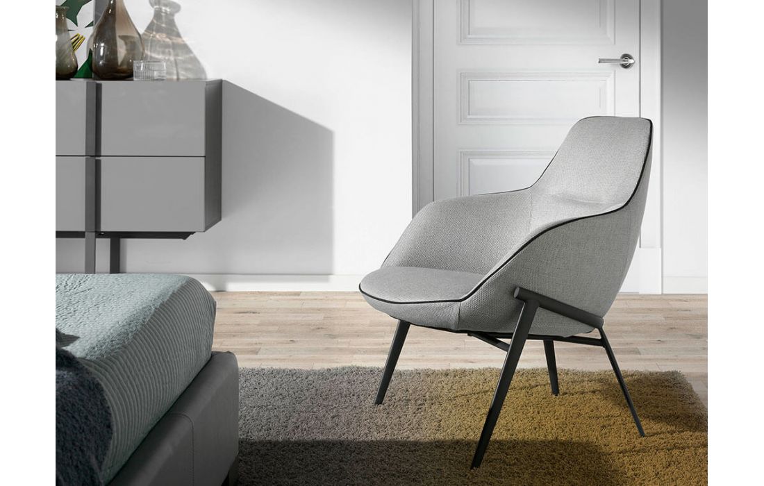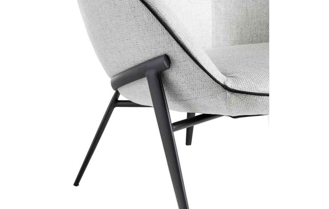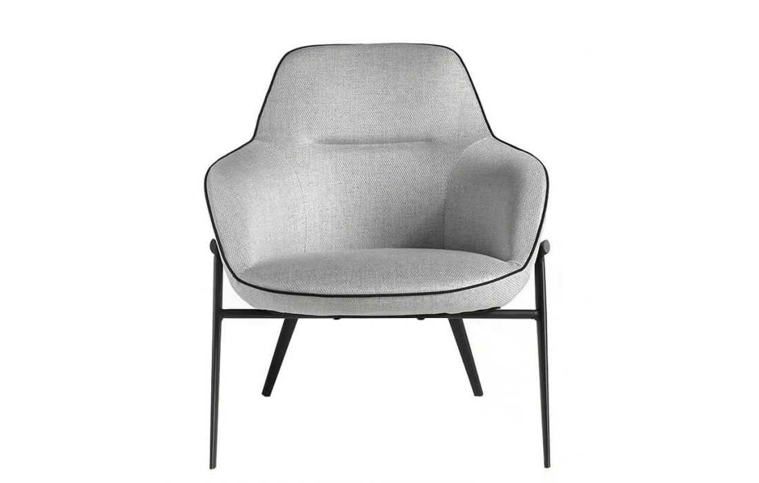 Cadeirão estofado em tecido cor cinza com pormenor preto e estrutura de aço cor preta
