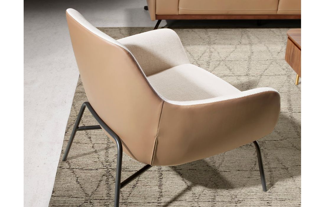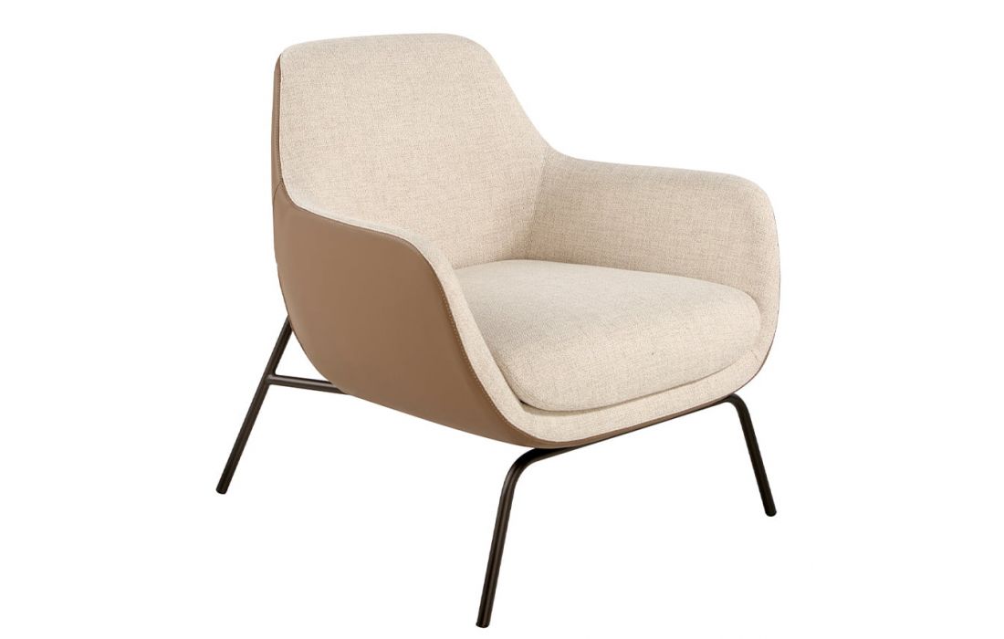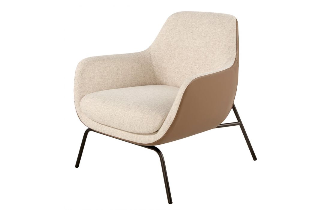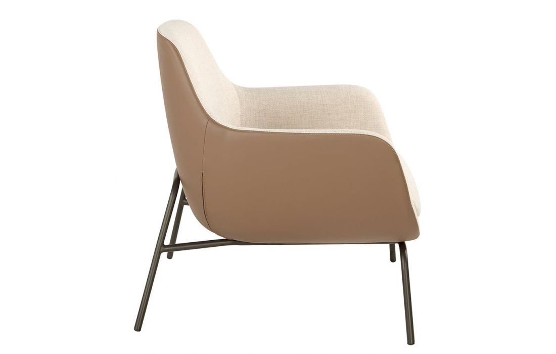 Cadeirão estofado em tecido de cor creme e pele sintética castanha com estrutura em aço inoxidável cor preta