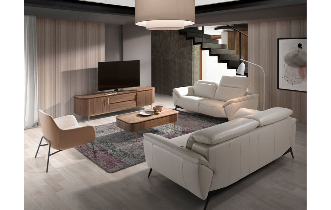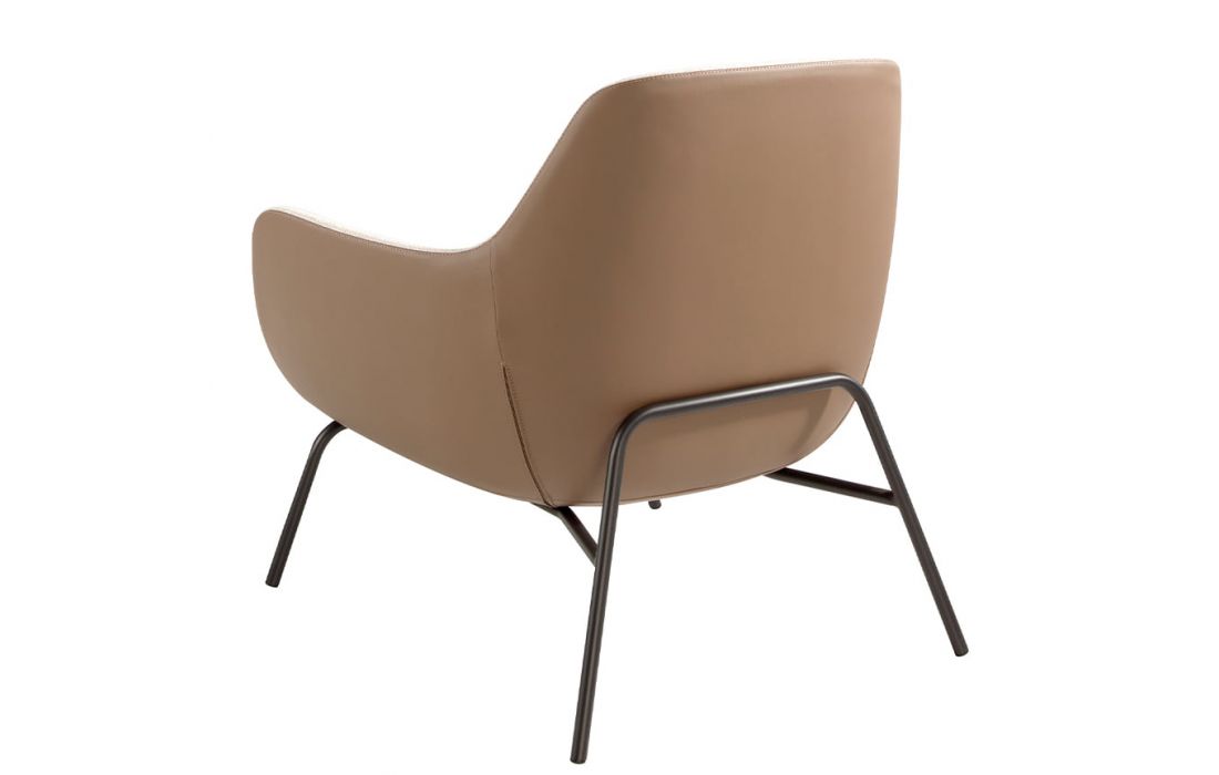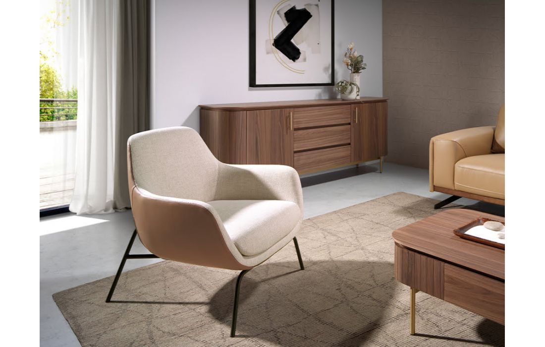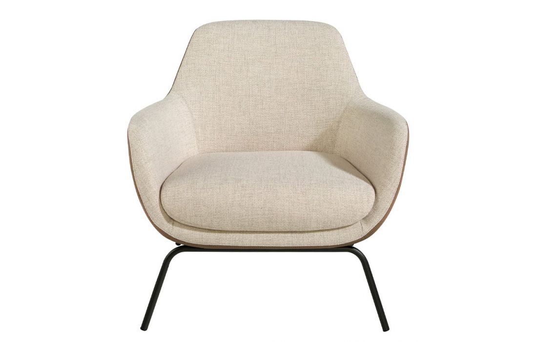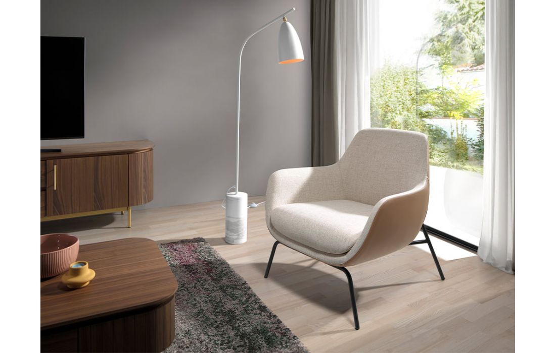 Cadeirão estofado em tecido de cor creme e pele sintética castanha com estrutura em aço inoxidável cor preta