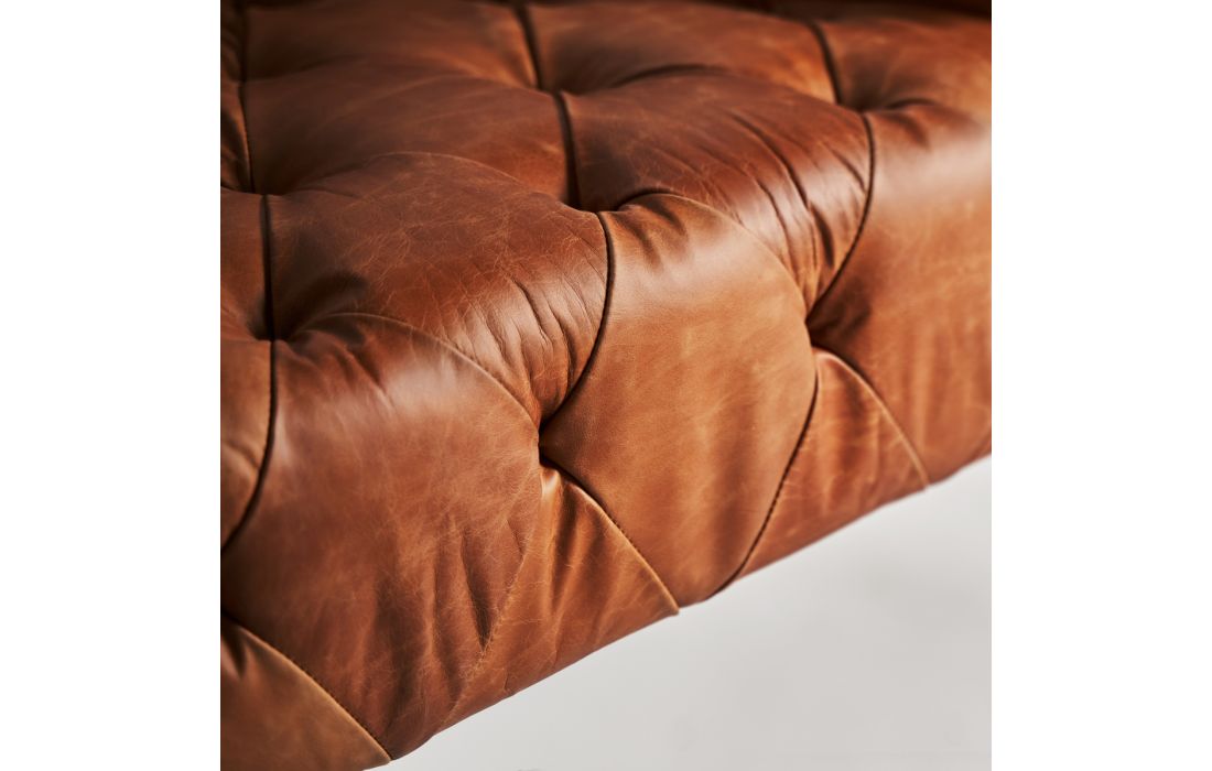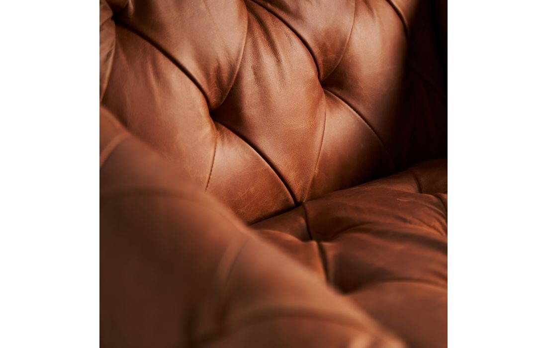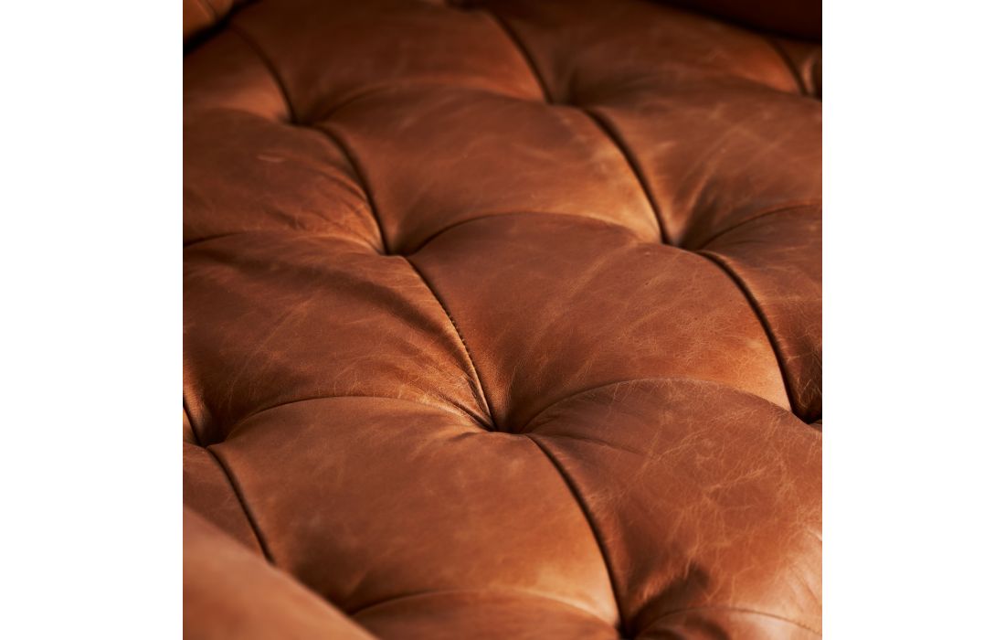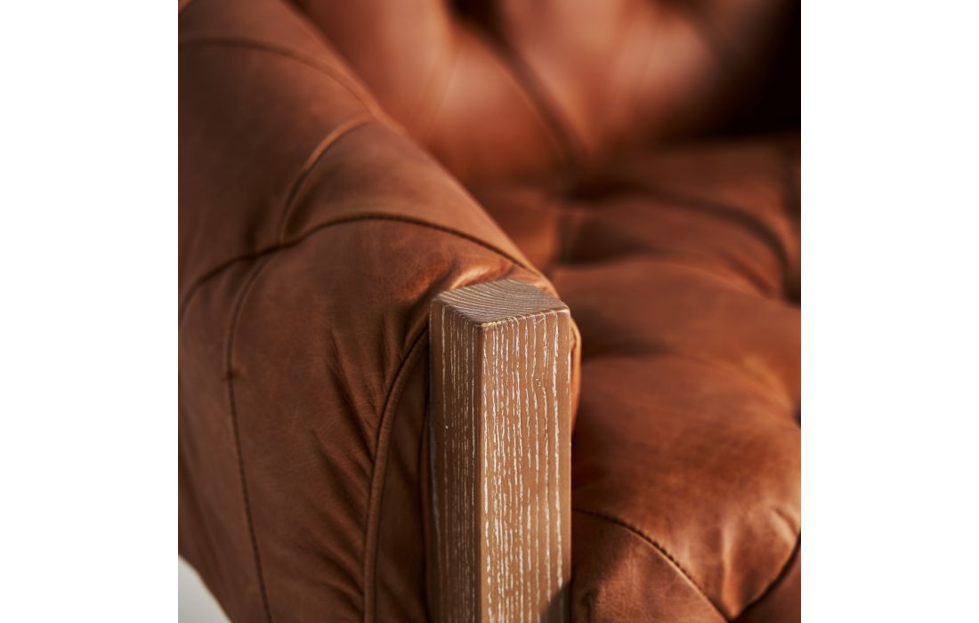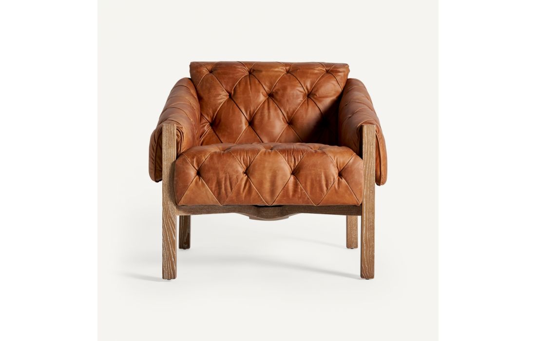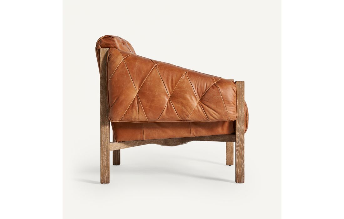 POLTRONA GLINSK, COR MARROM, ESTILO VINTAGE. FEITA EM MADEIRA DE VÉIDOA, COMBINADA COM COURO E ESPUMA.