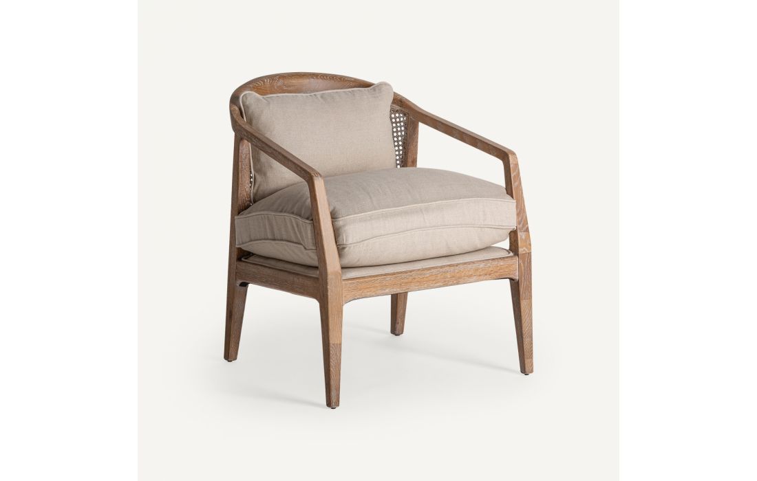 CADEIRA GISTEL, COR NATURAL, ESTILO COLONIAL. FEITA EM MADEIRA DE FRENIXO, COMBINADA COM LINHO. PRODUTO DESTACÁVEL, REMOVÍVEL.