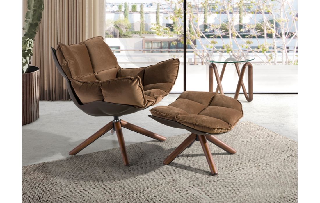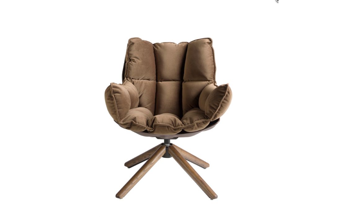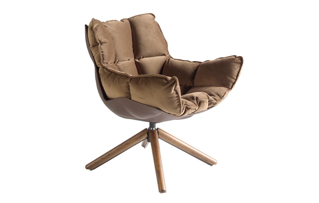 Poltrona giratória estofada em tecido de veludo marrom com estrutura de pernas em madeira na cor nogueira . Uma poltrona giratória com design moderno que, além de proporcionar elegância e caráter, é uma peça totalmente prática e funcional para o seu dia a dia.