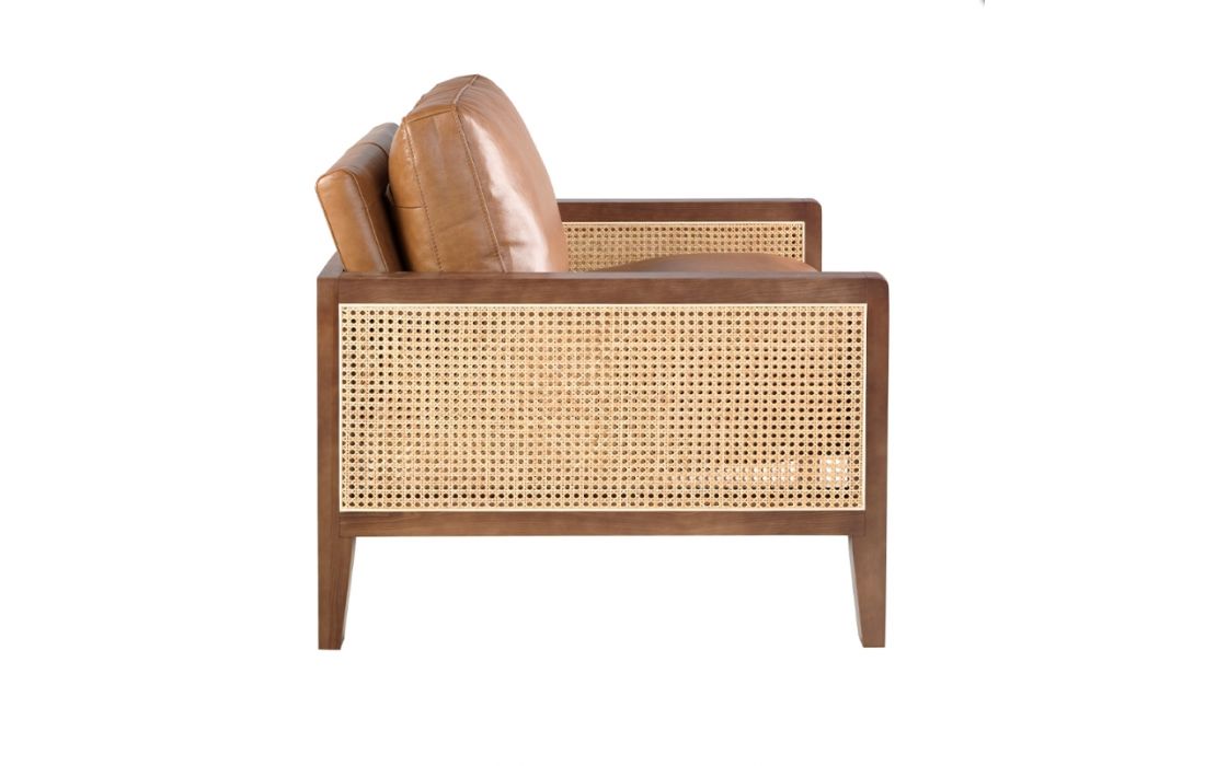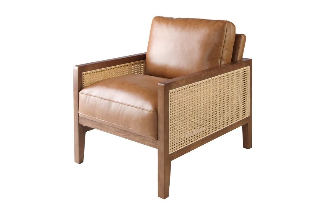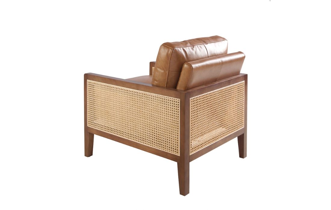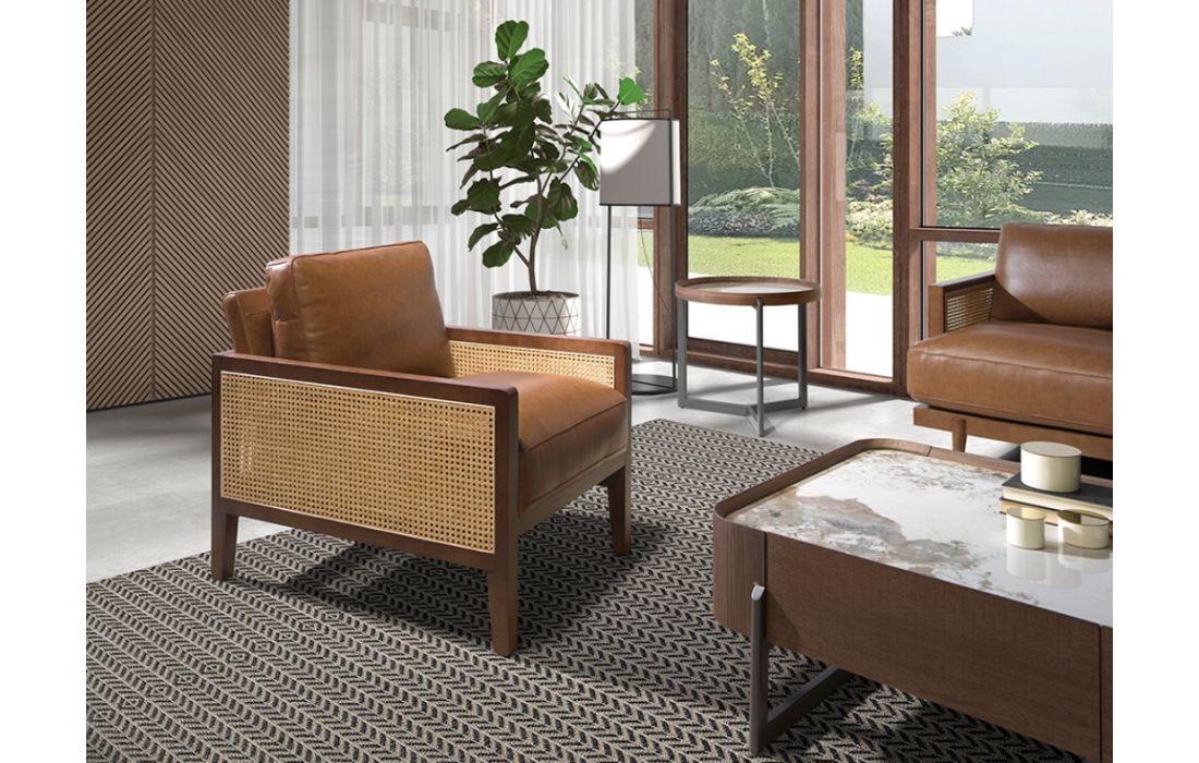Poltrona com braços e assento e encosto estofados em couro bovino marrom. Pés em madeira cor de nogueira.Destinatário :
