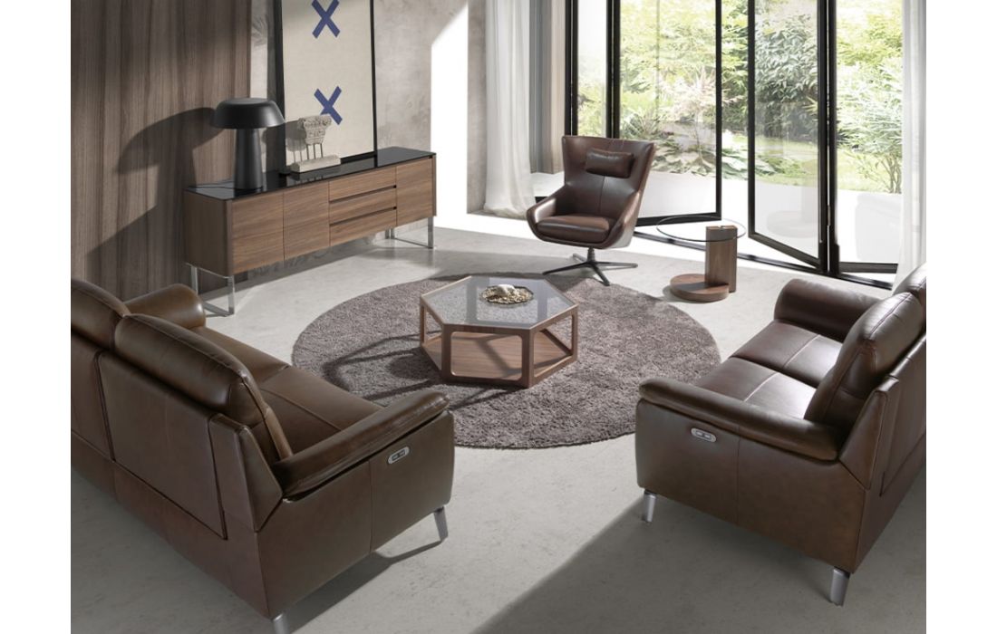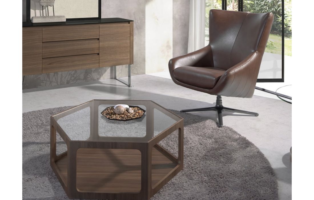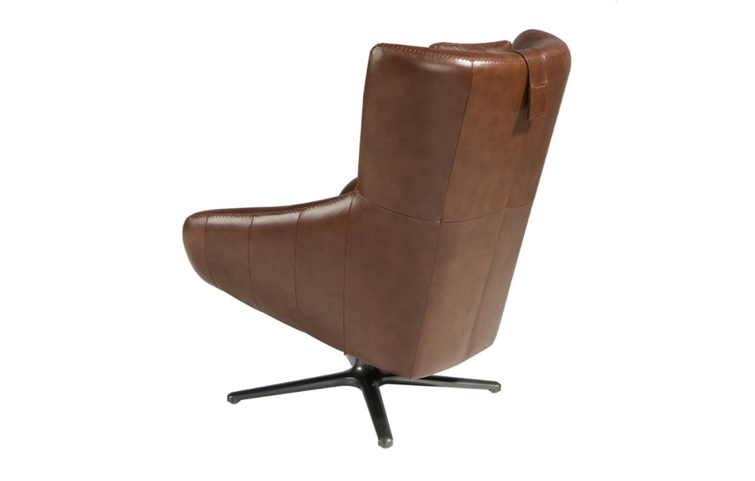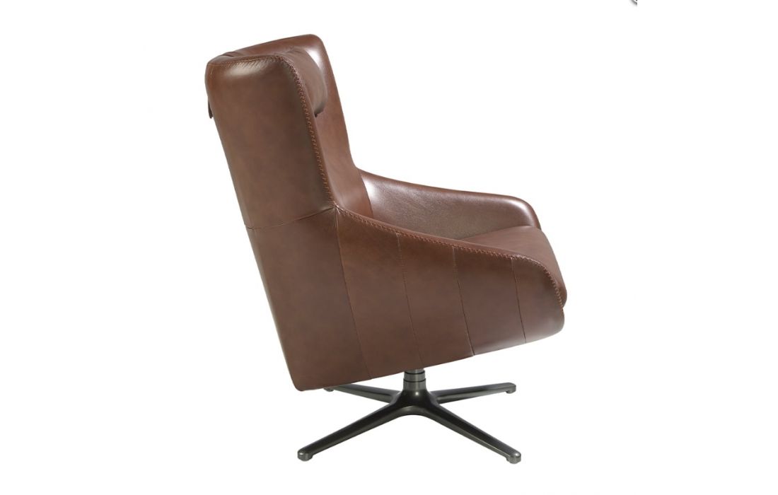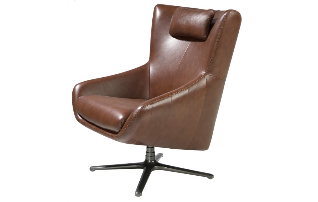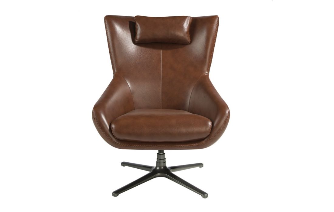 Poltrona giratória estofada em couro com almofada de encosto de cabeça removível incluída. Estrutura das pernas em aço inoxidável escurecido.Destinatário :