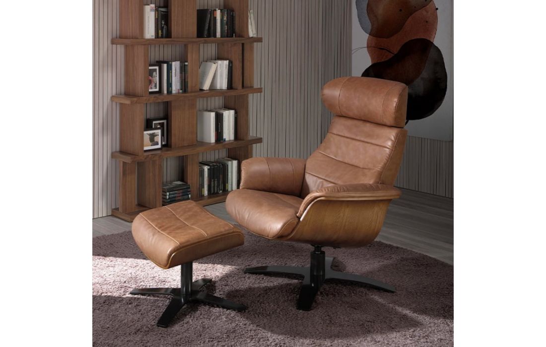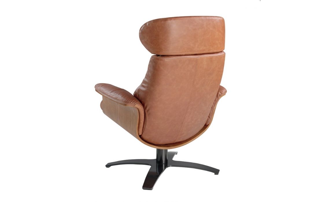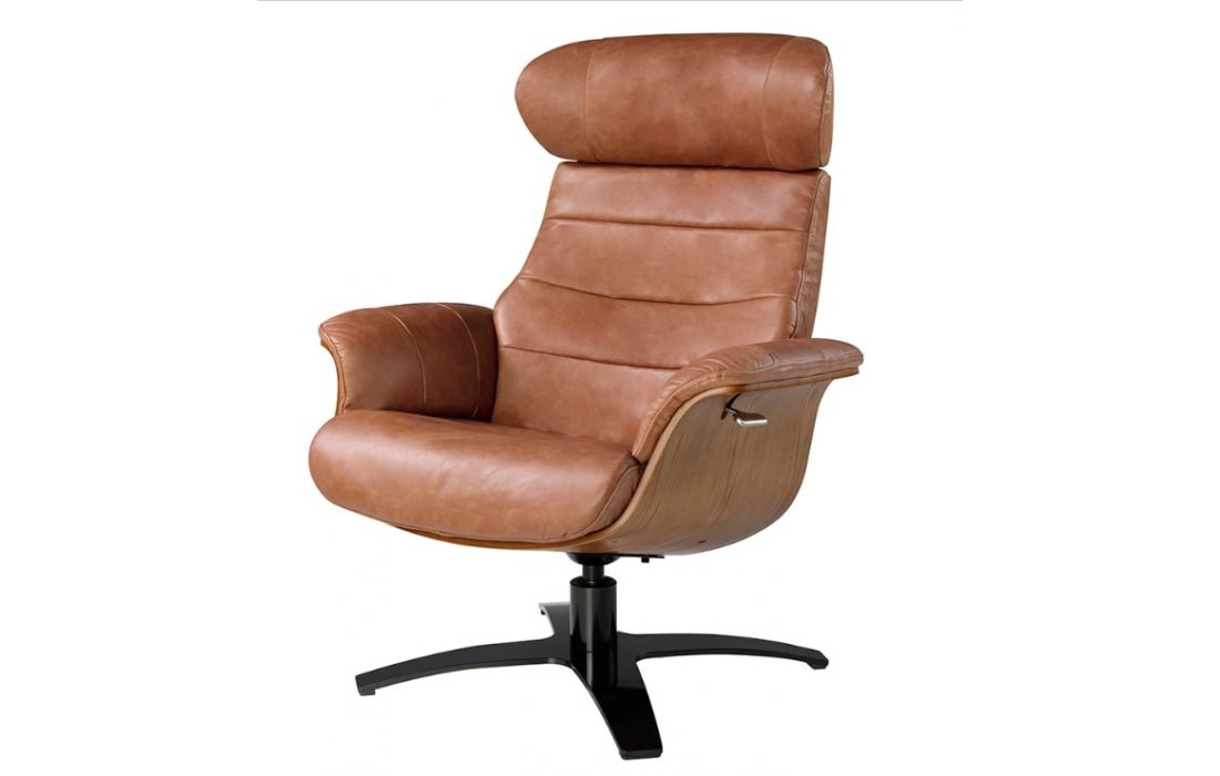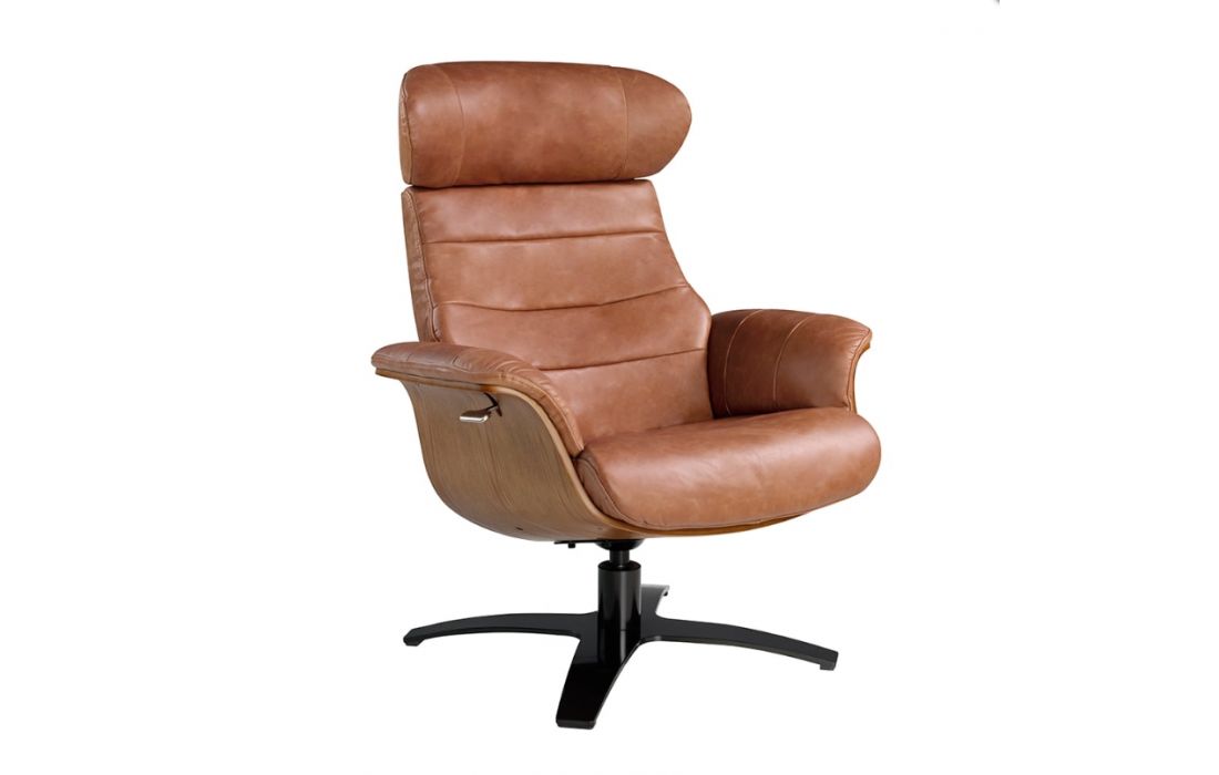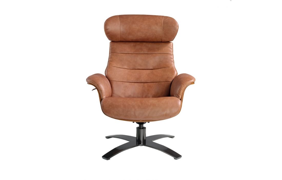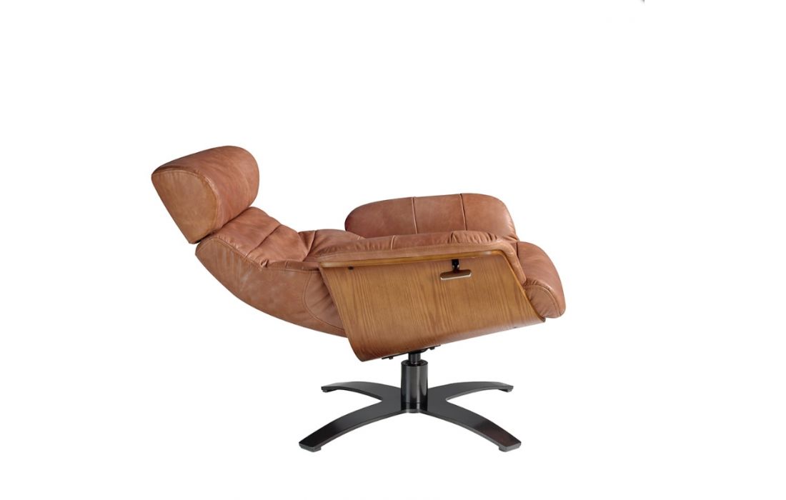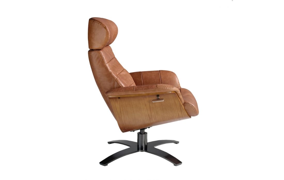Poltrona giratória relaxante estofada em couro bovino e base em aço maciço cinza antracite escurecido. Estrutura de suporte em madeira folheada a nogueira.
