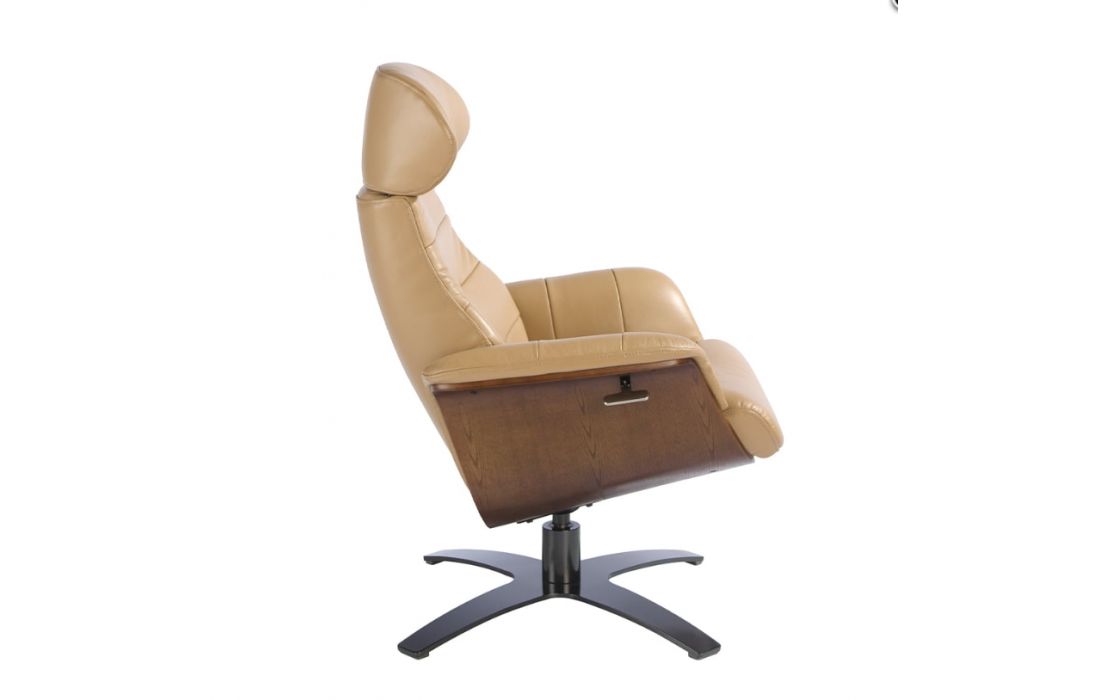 Poltrona giratória relaxante estofada em couro bovino e base em aço maciço cinza antracite escurecido. Estrutura de suporte em madeira folheada a nogueira.