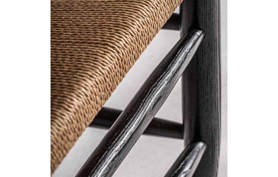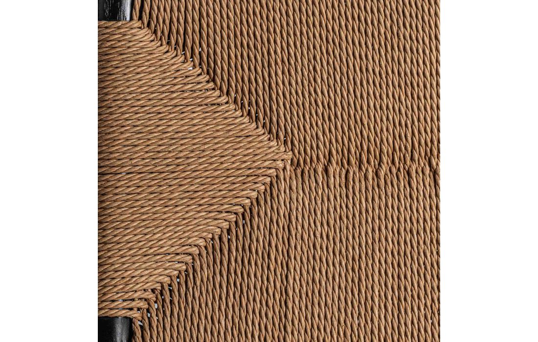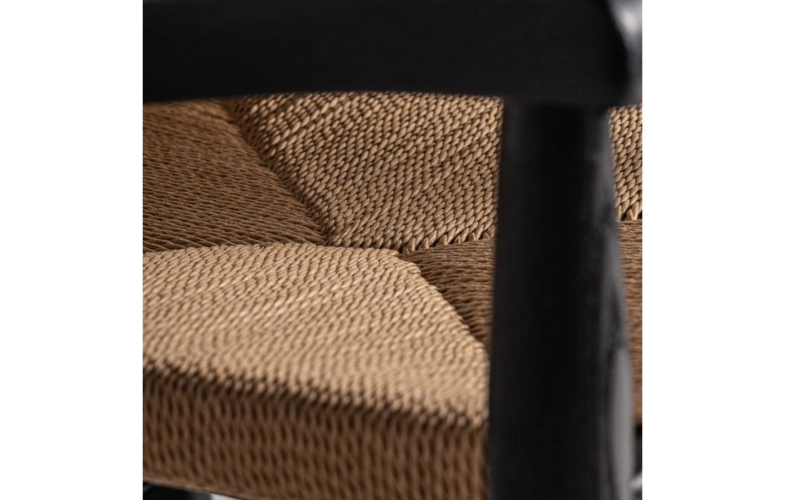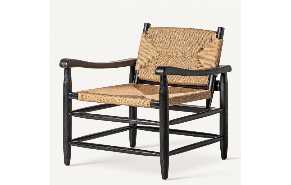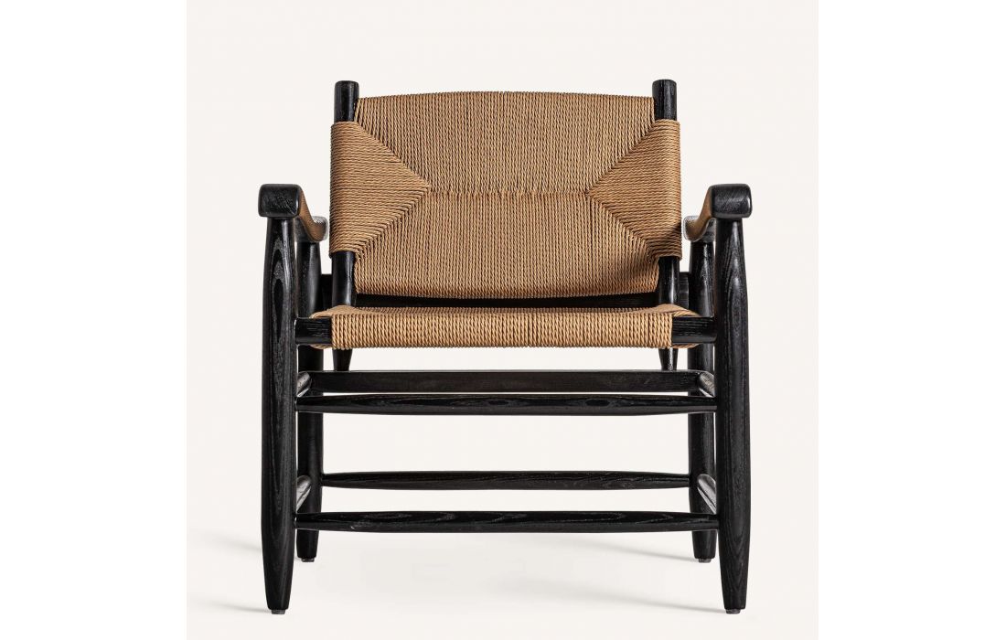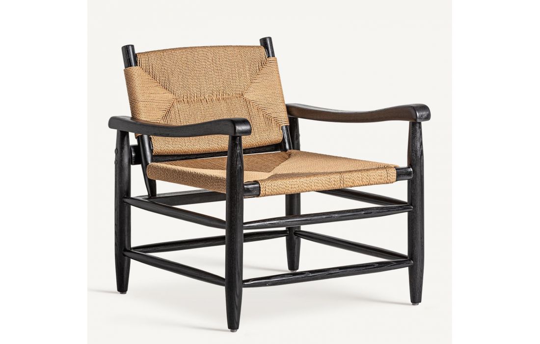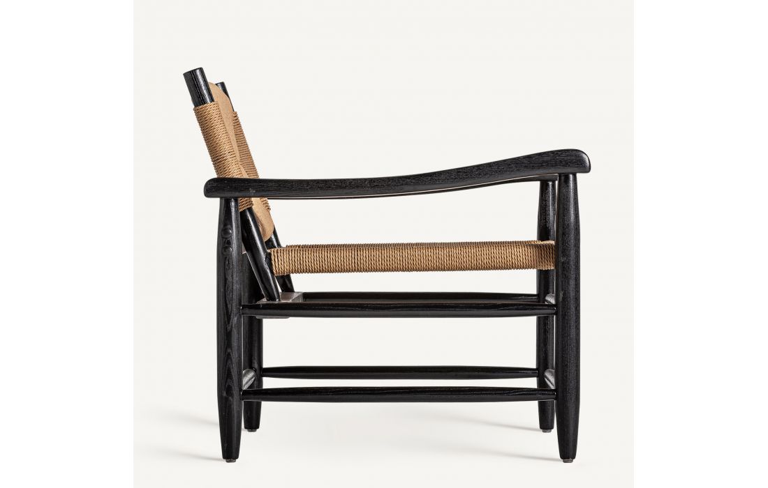 Poltrona com estrutura em madeira de caucho cor preta, assento e costa corda natural