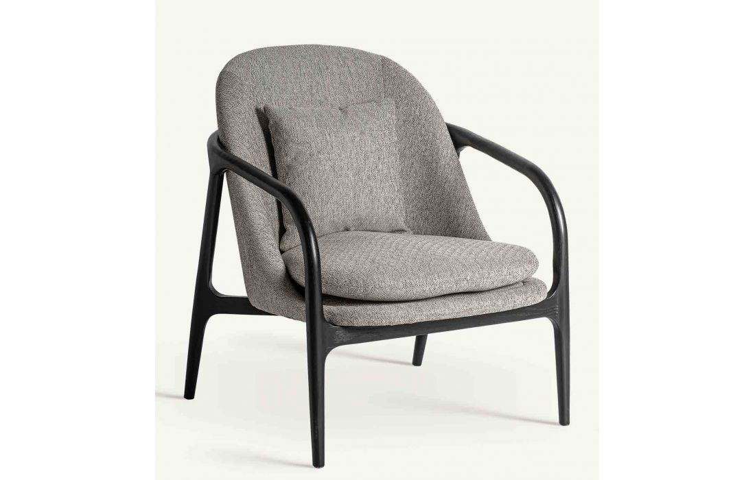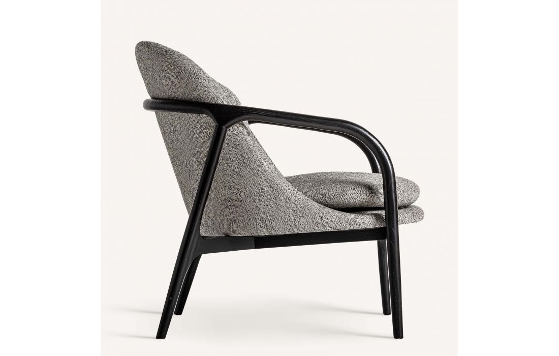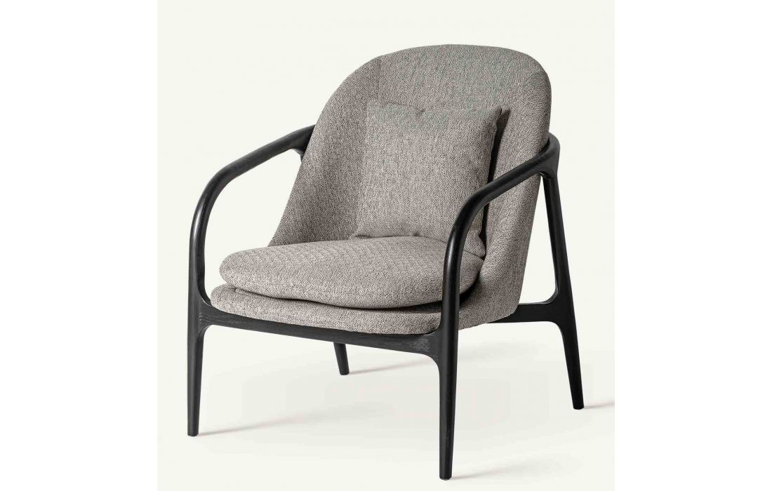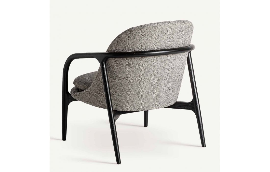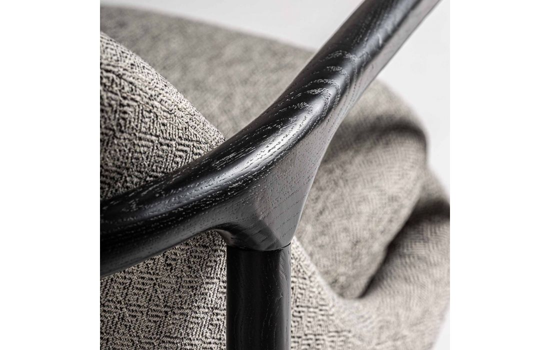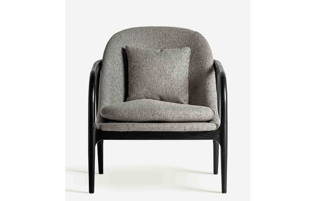Poltrona com estrutura em madeira de arce cor preta e estofada em tecido poliester cinza