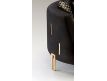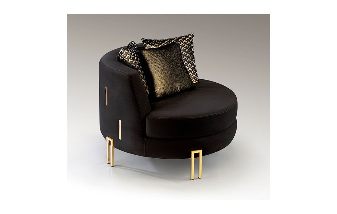 Poltrona, estofada em veludo de cor preta, almofadas combinadas. Pernas de metal e placas decorativas em acabamento dourado.Destinatário :