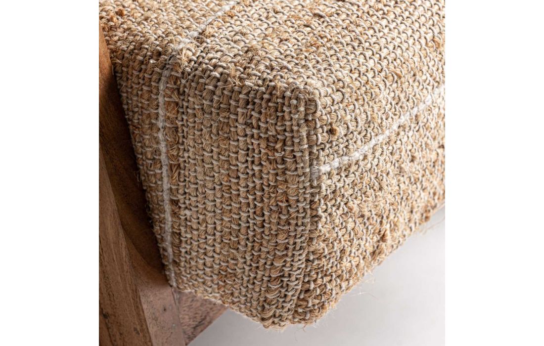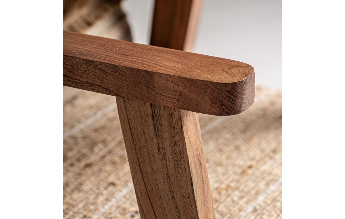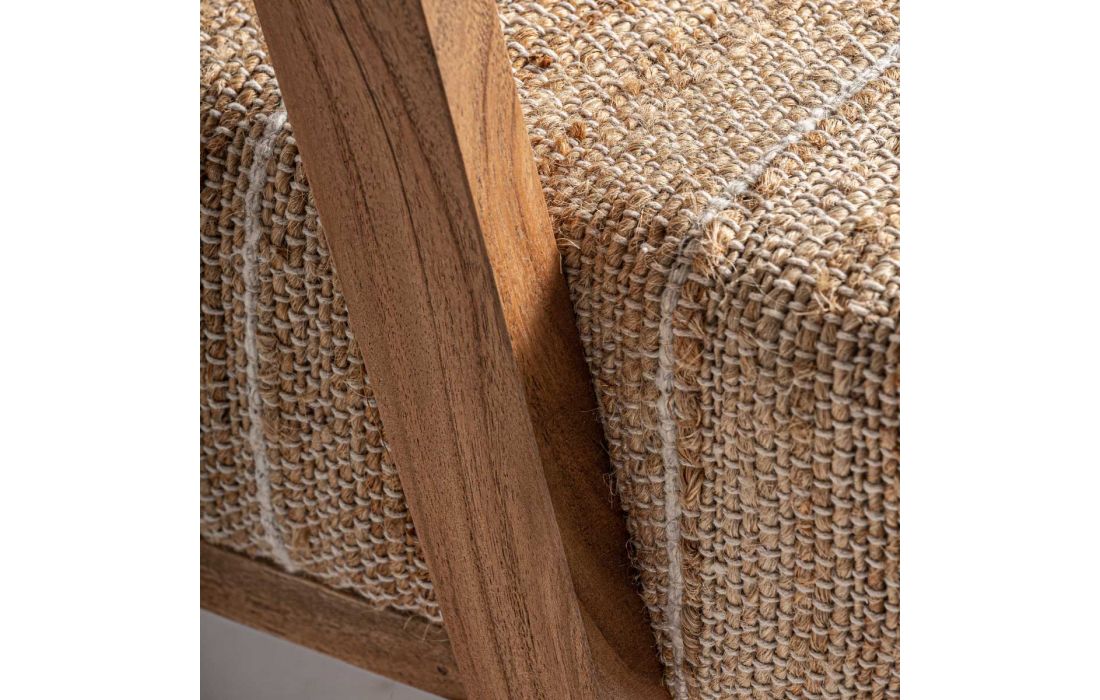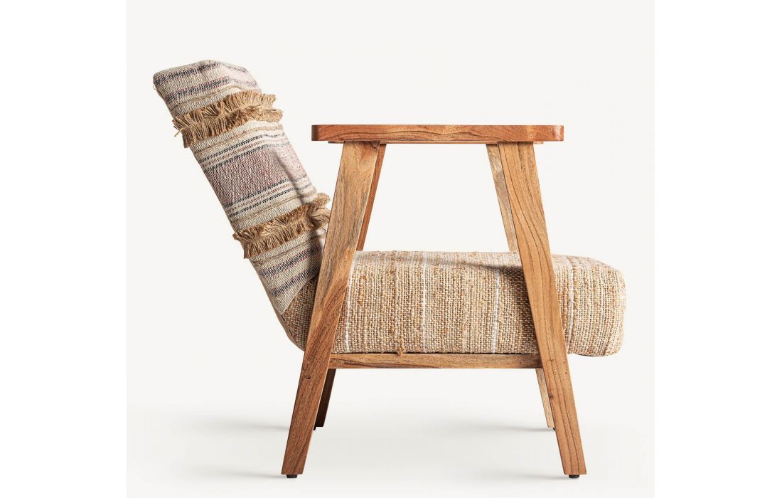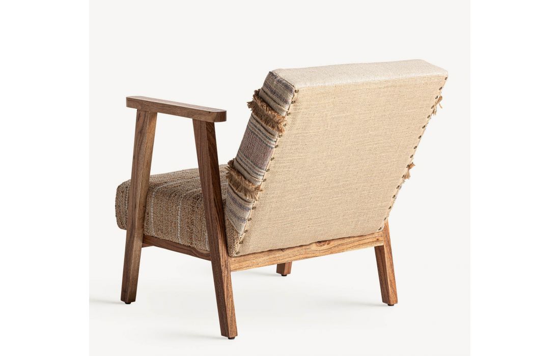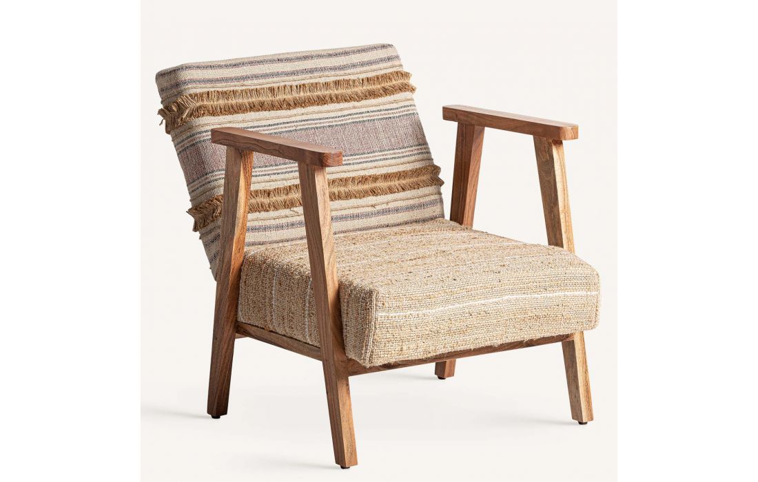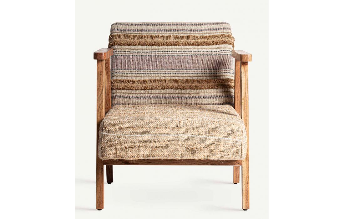 Poltrona com estrutura em madeira cor natural, estofada em tecido de algodão