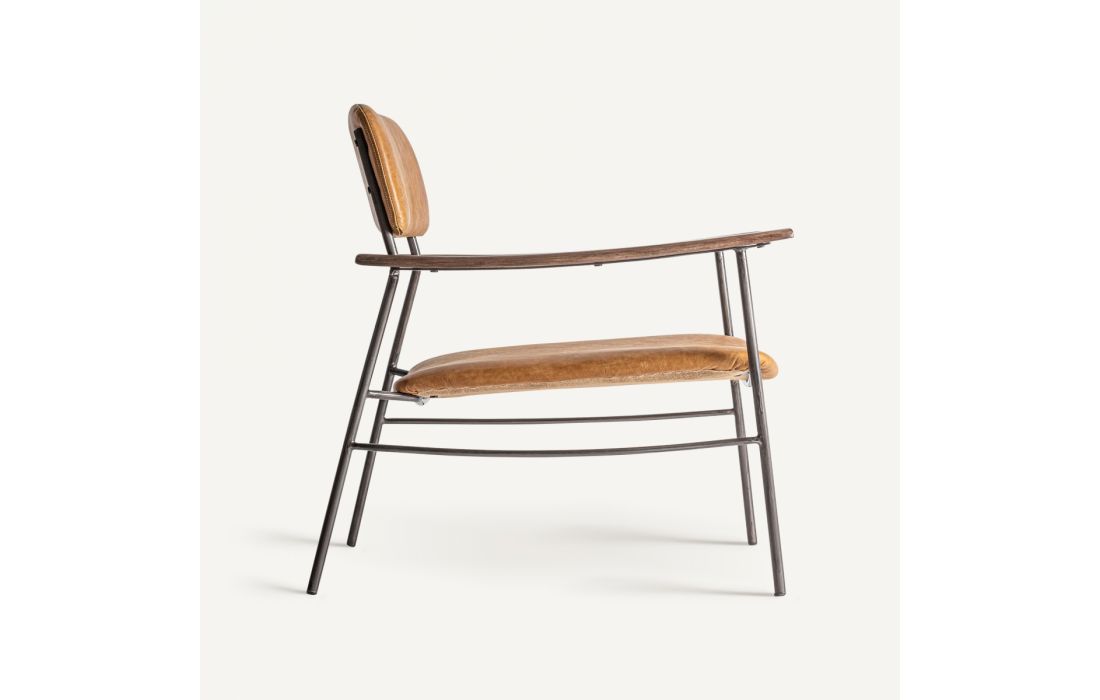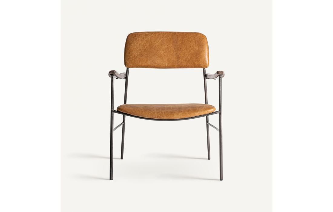 Poltrona revestída em couro de cor natural e estrutura em ferro.