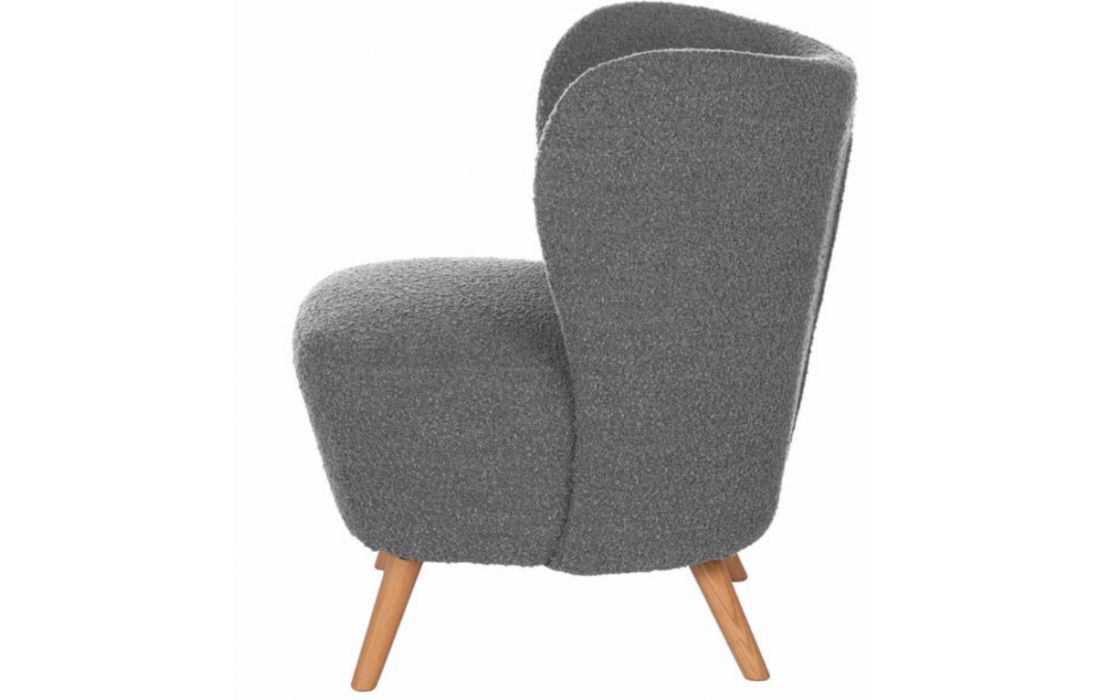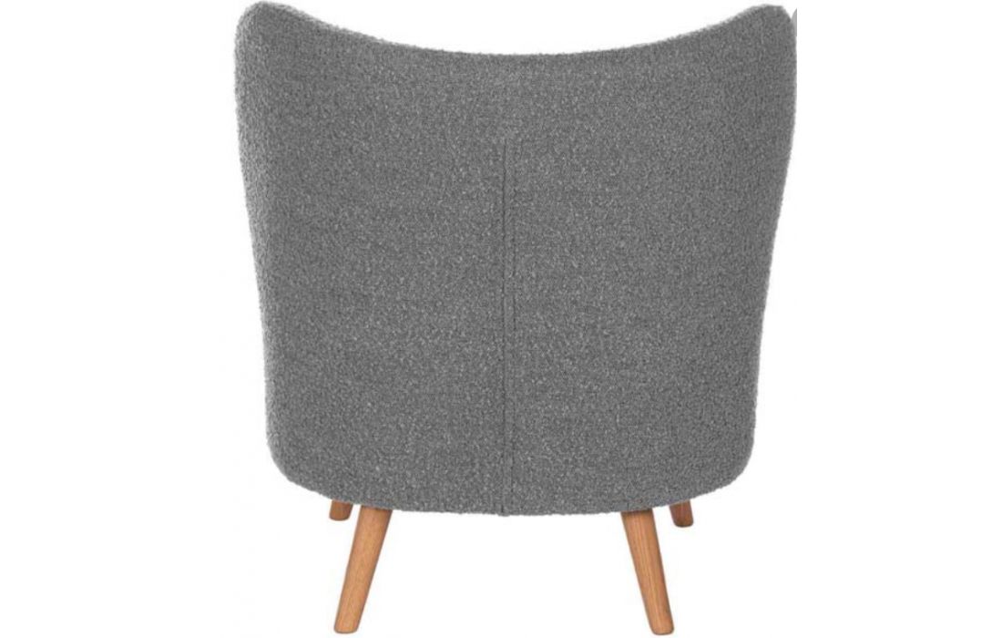 Poltrona estofada em tecido cinza claro e pés em madeira.