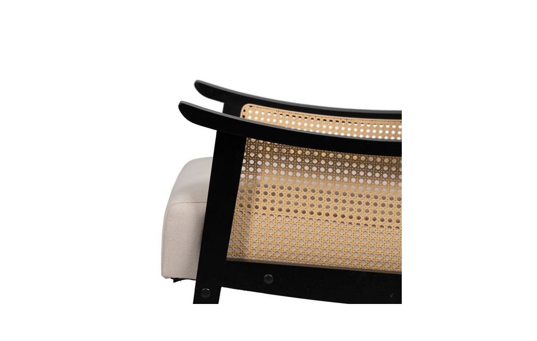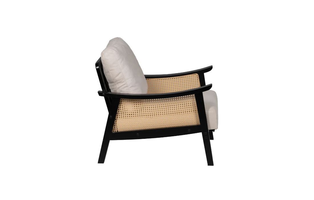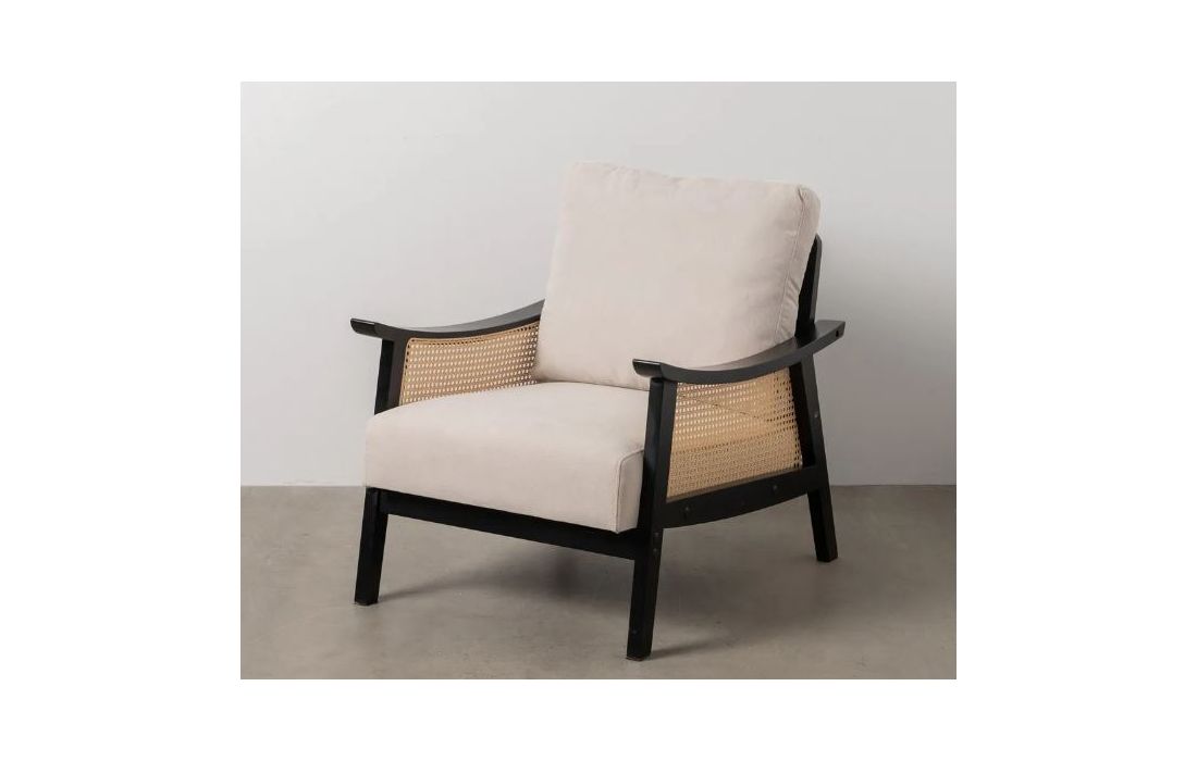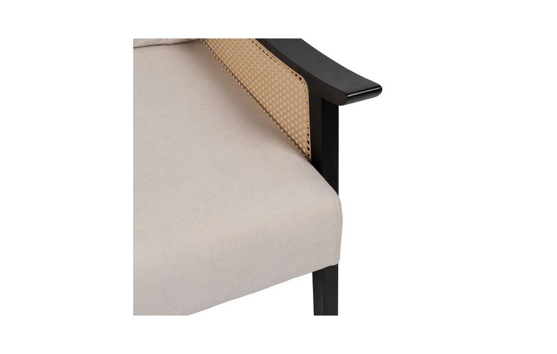 Poltrona com estrutura em madeira de caucho e palhinha, estofada em tecido 100% poliéster cor branca