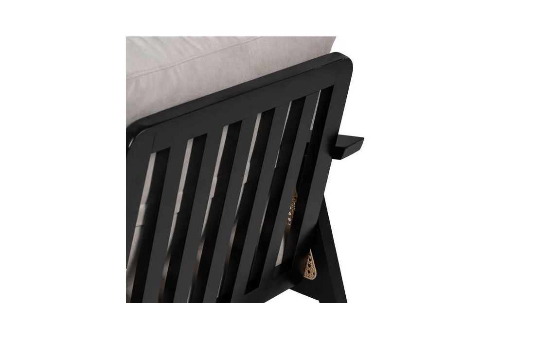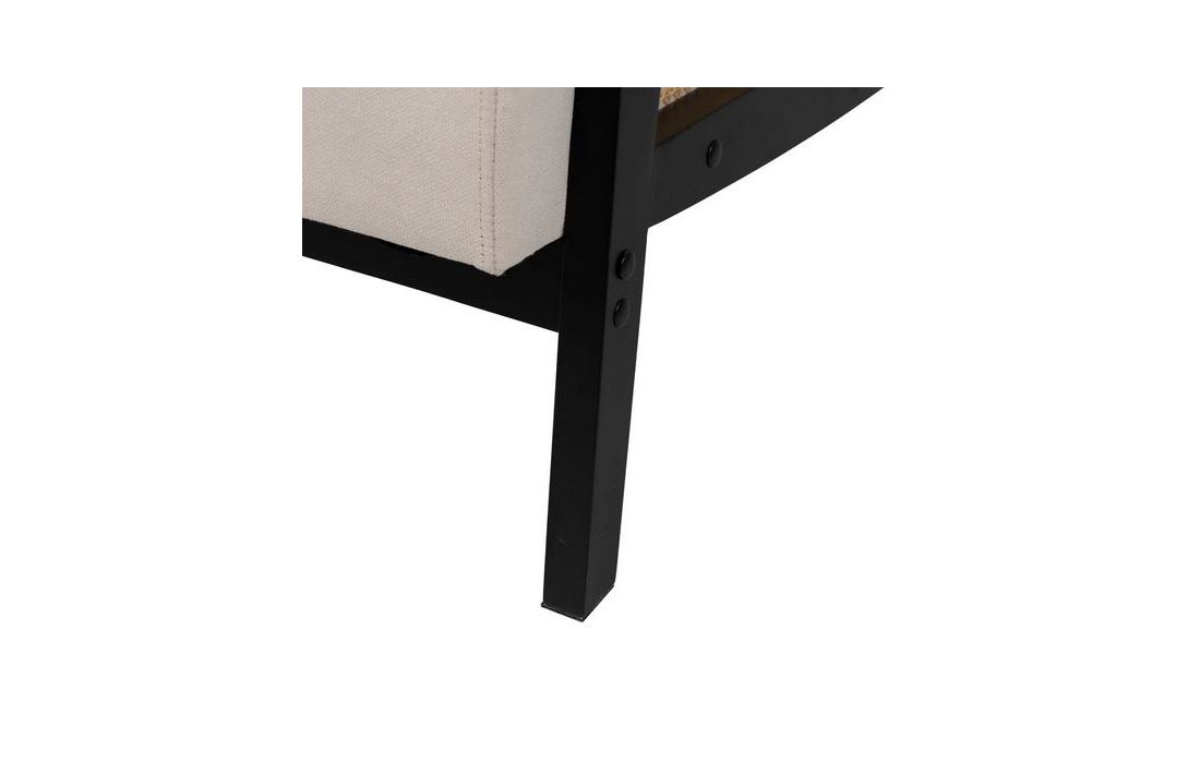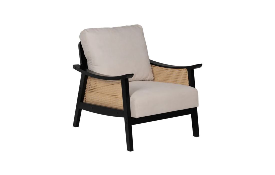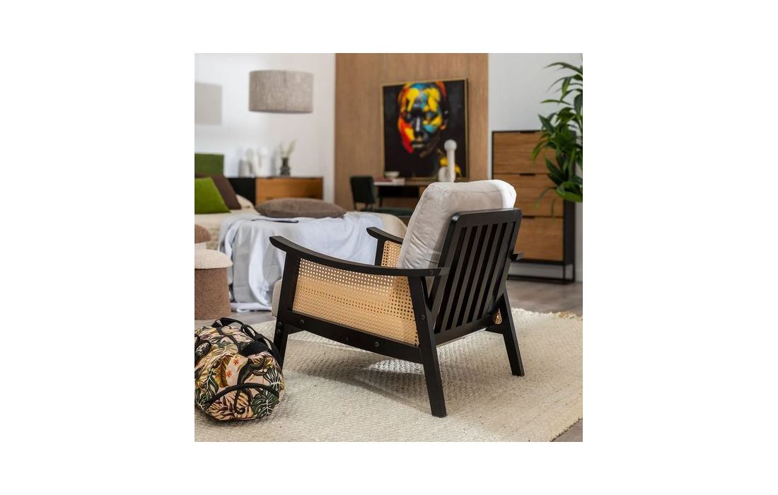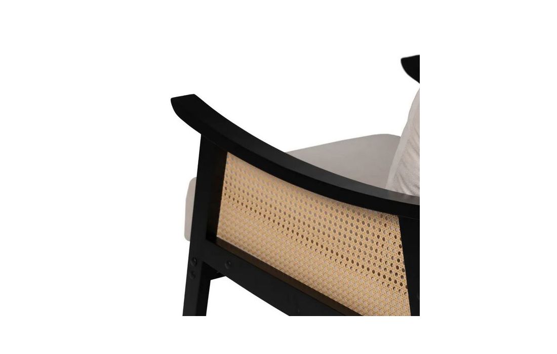 Poltrona com estrutura em madeira de caucho e palhinha, estofada em tecido 100% poliéster cor branca