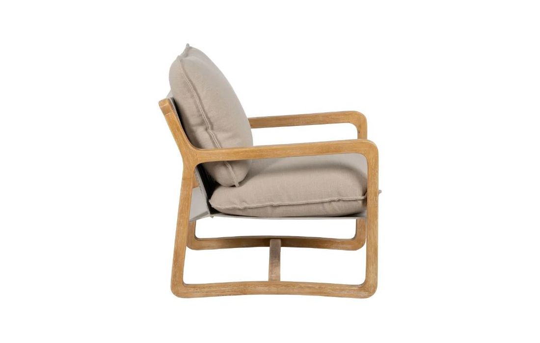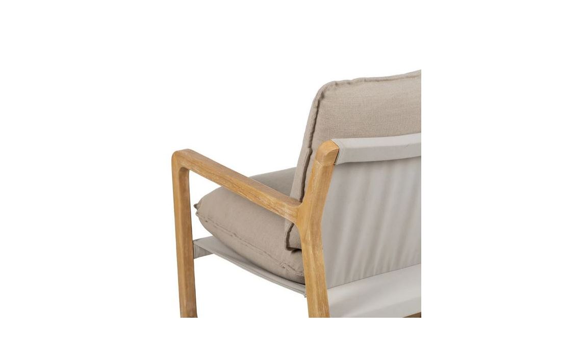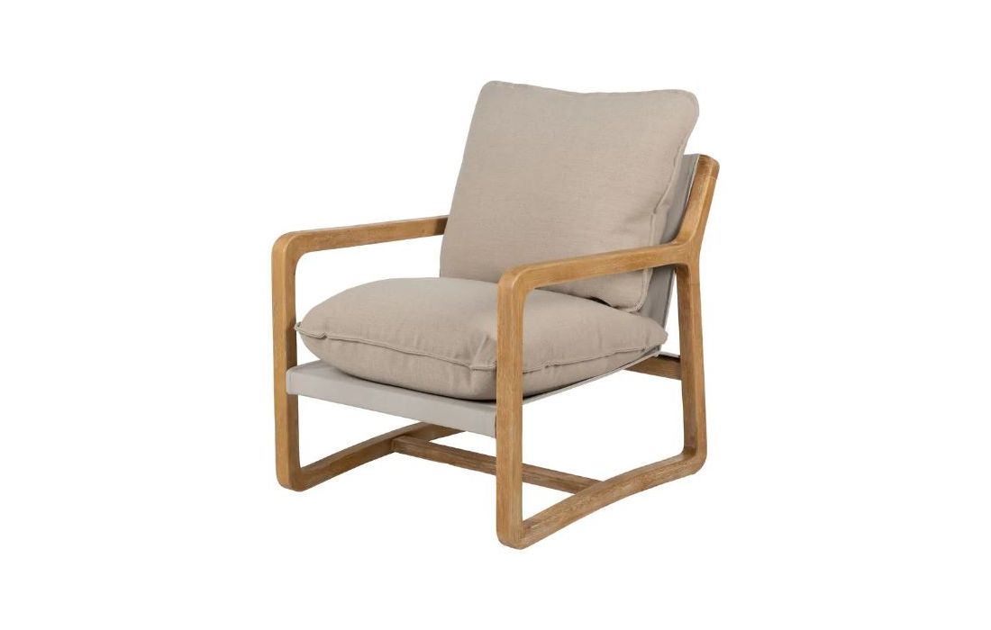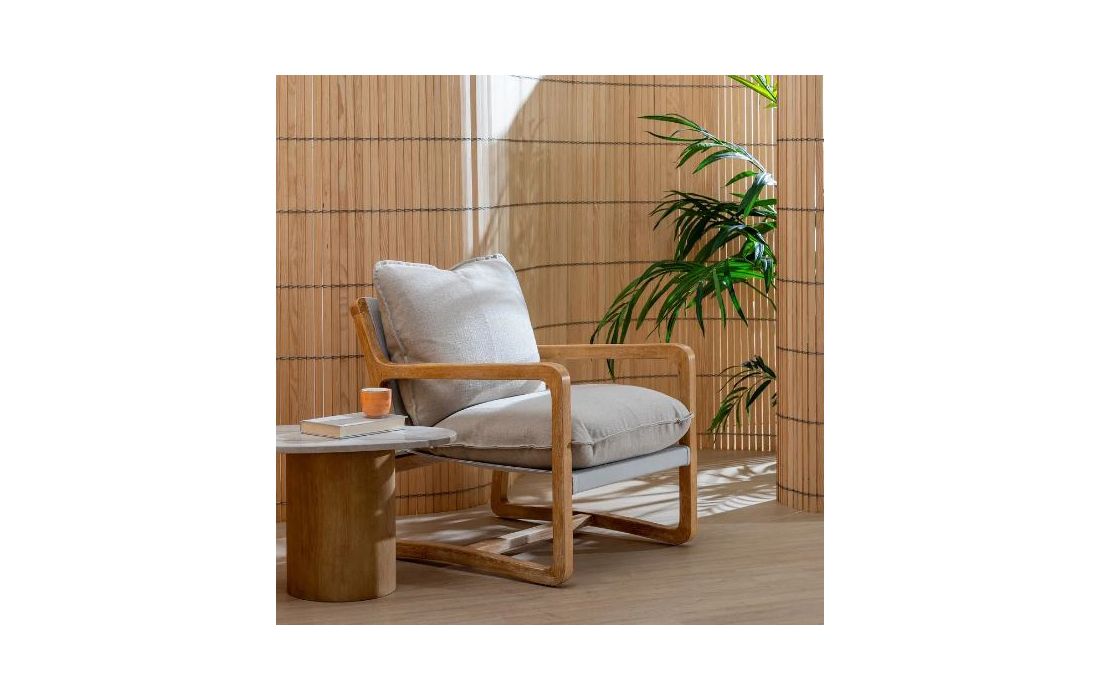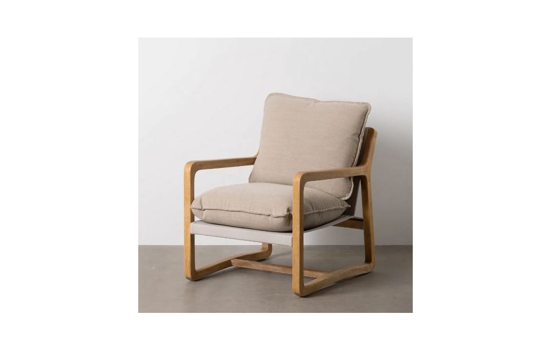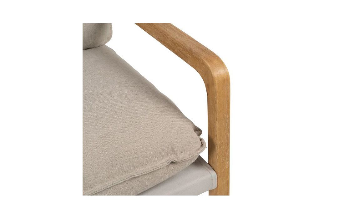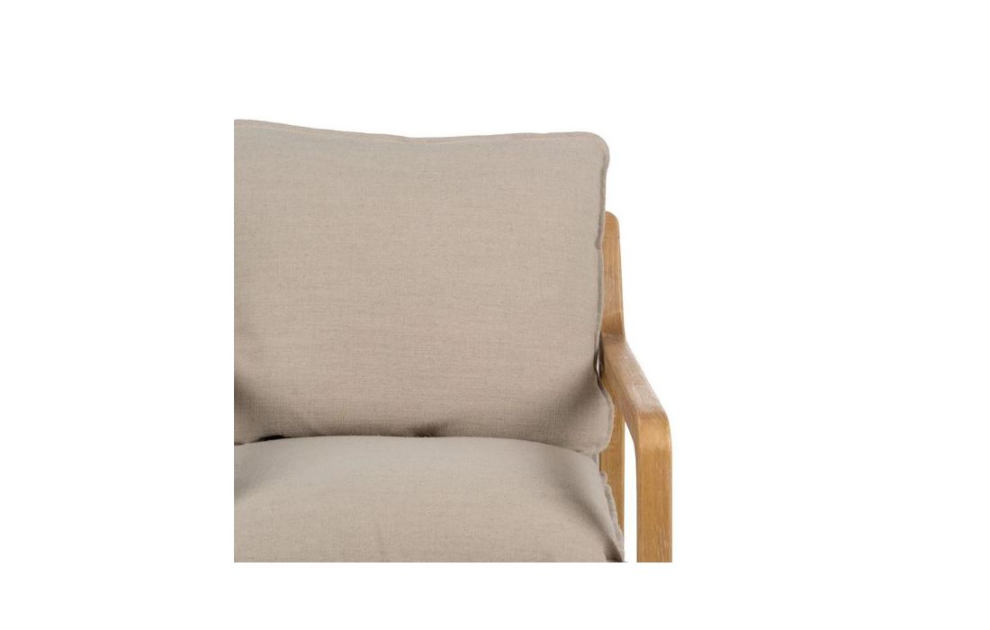 Poltrona com estrutura em madeira de caucho cor natural e estofo em tecido de linho