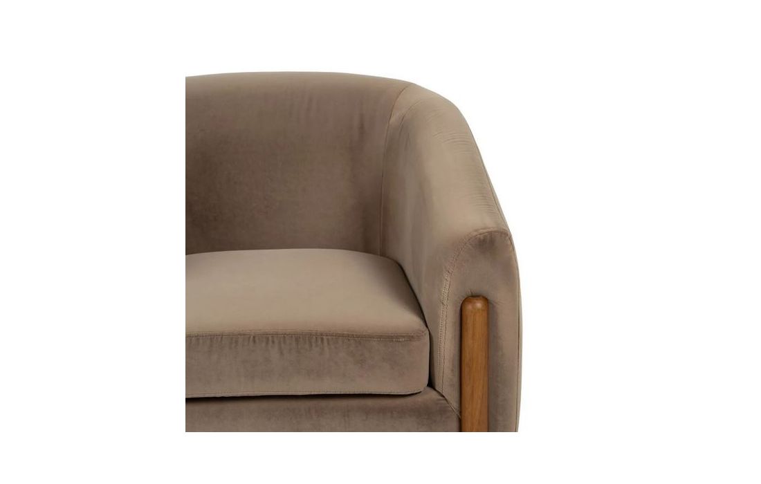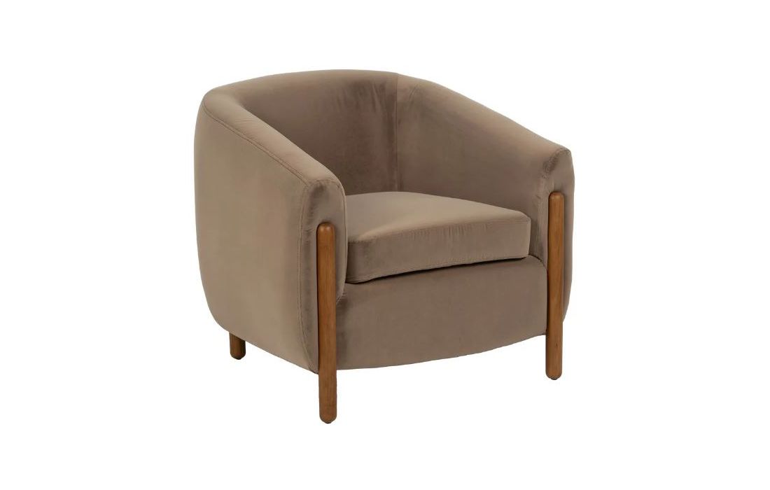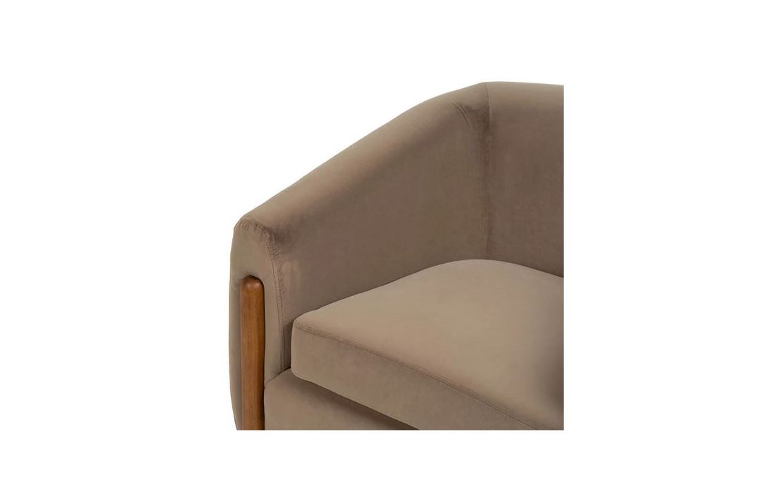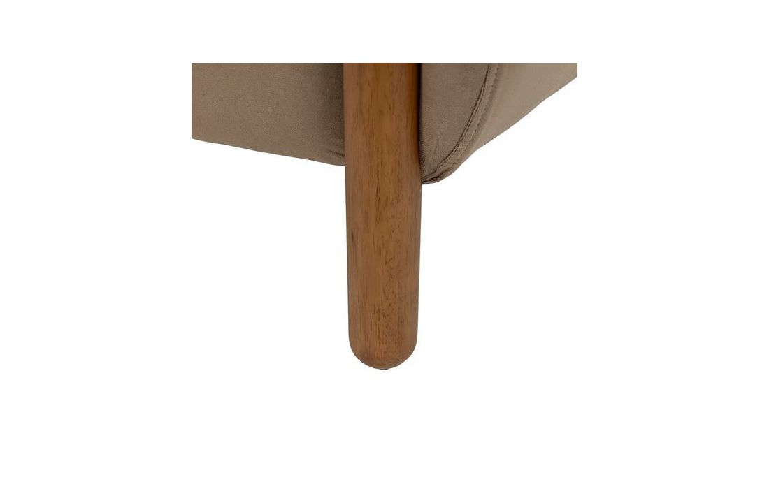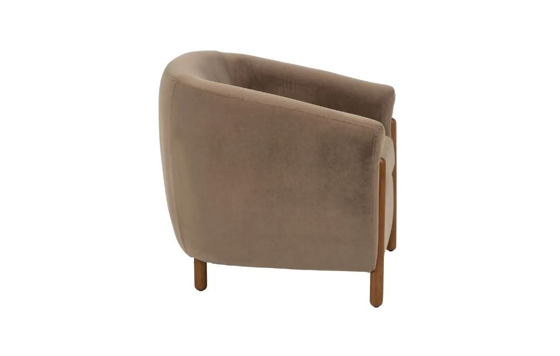 Poltrona com pés em madeira de caucho cor natural e estofo em tecido cor taupe