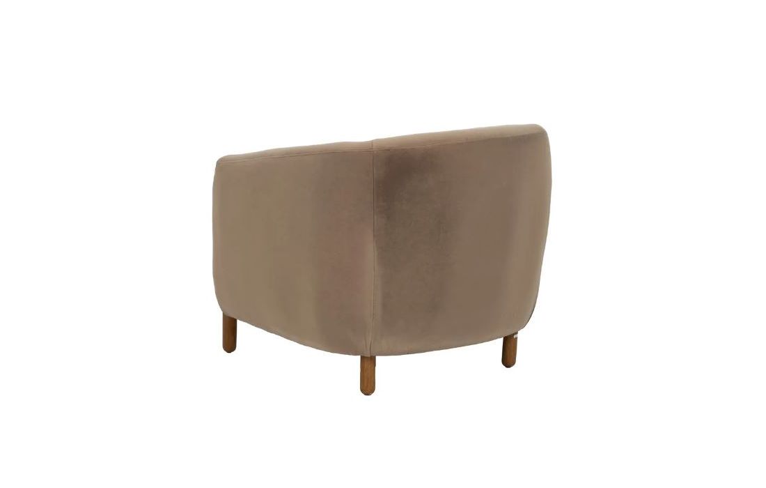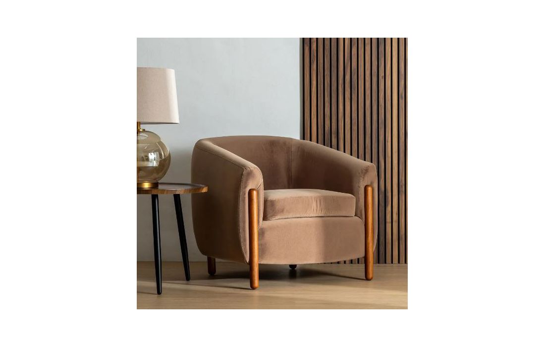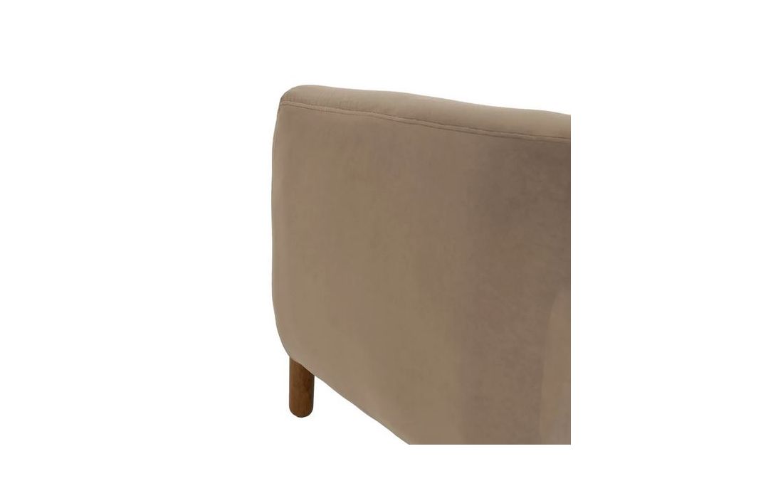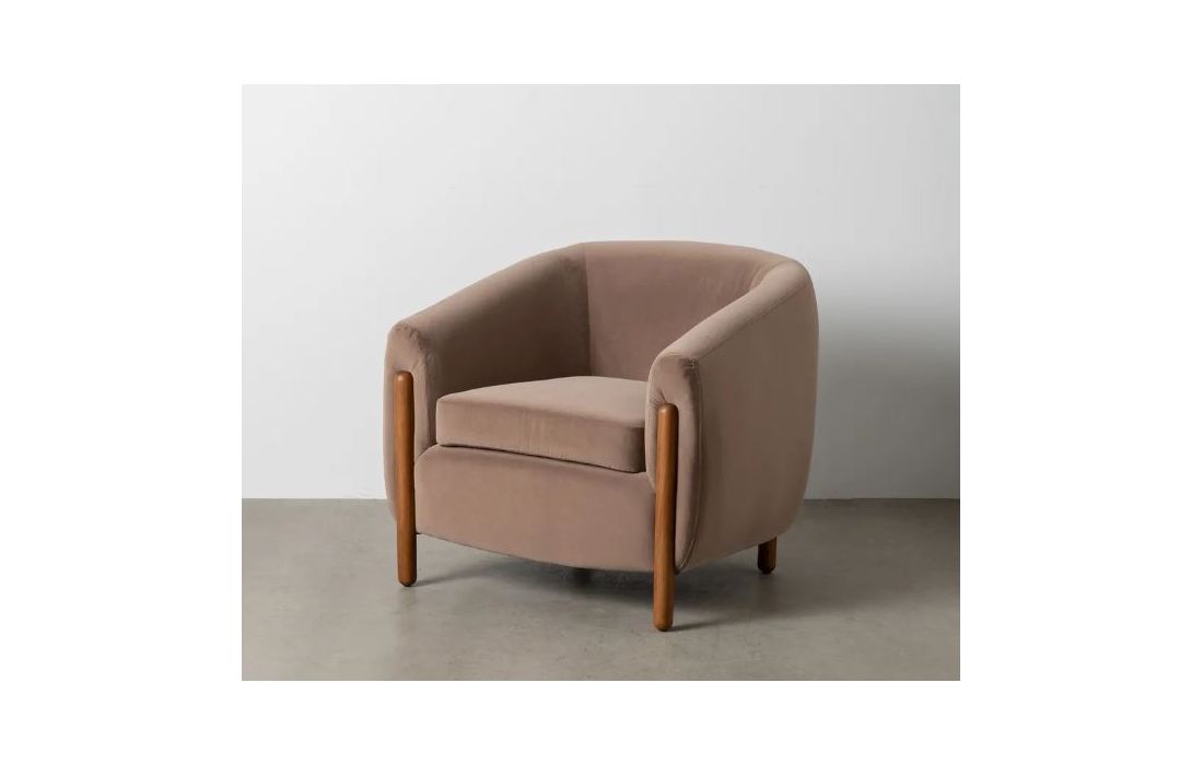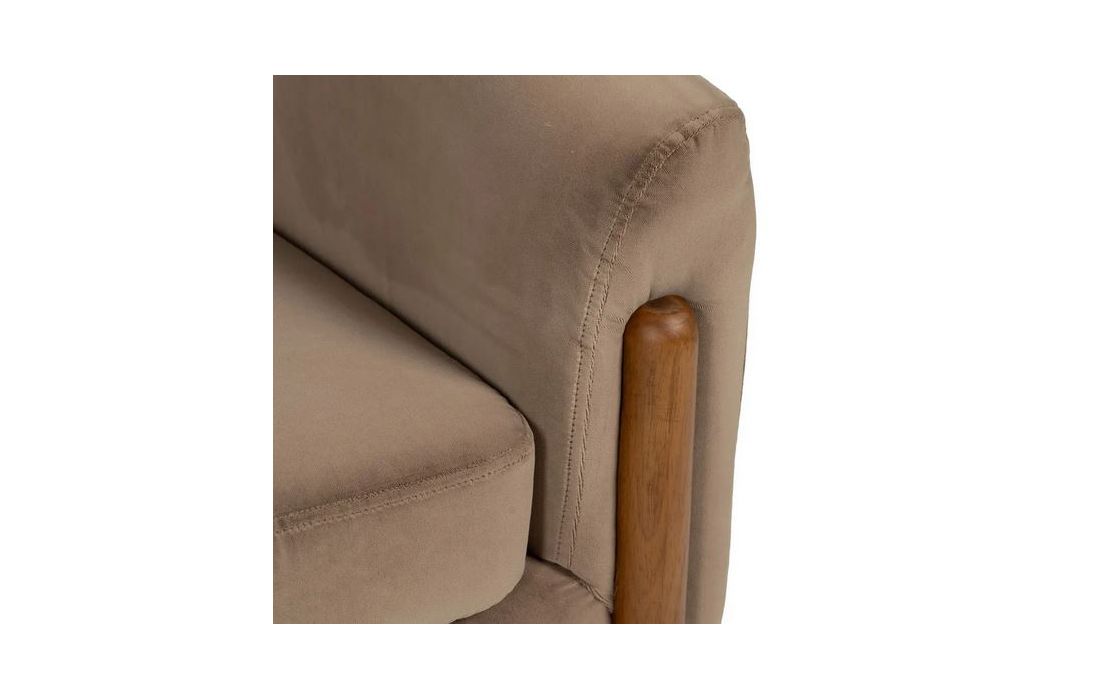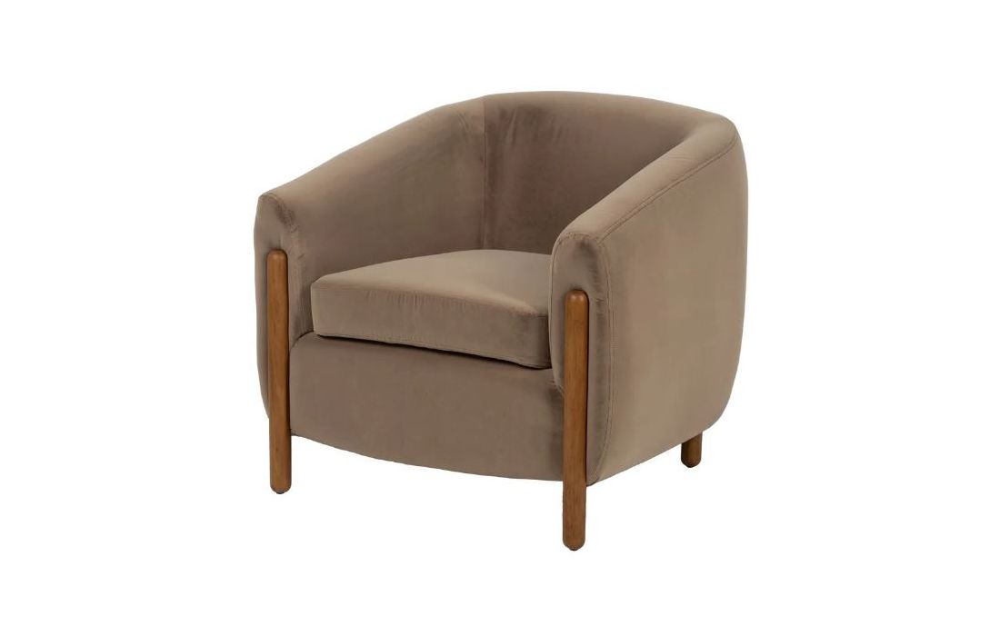 Poltrona com pés em madeira de caucho cor natural e estofo em tecido cor taupe