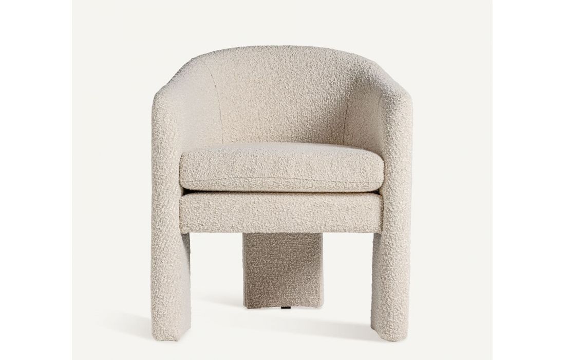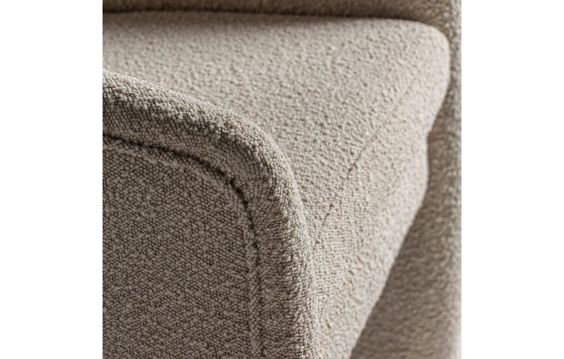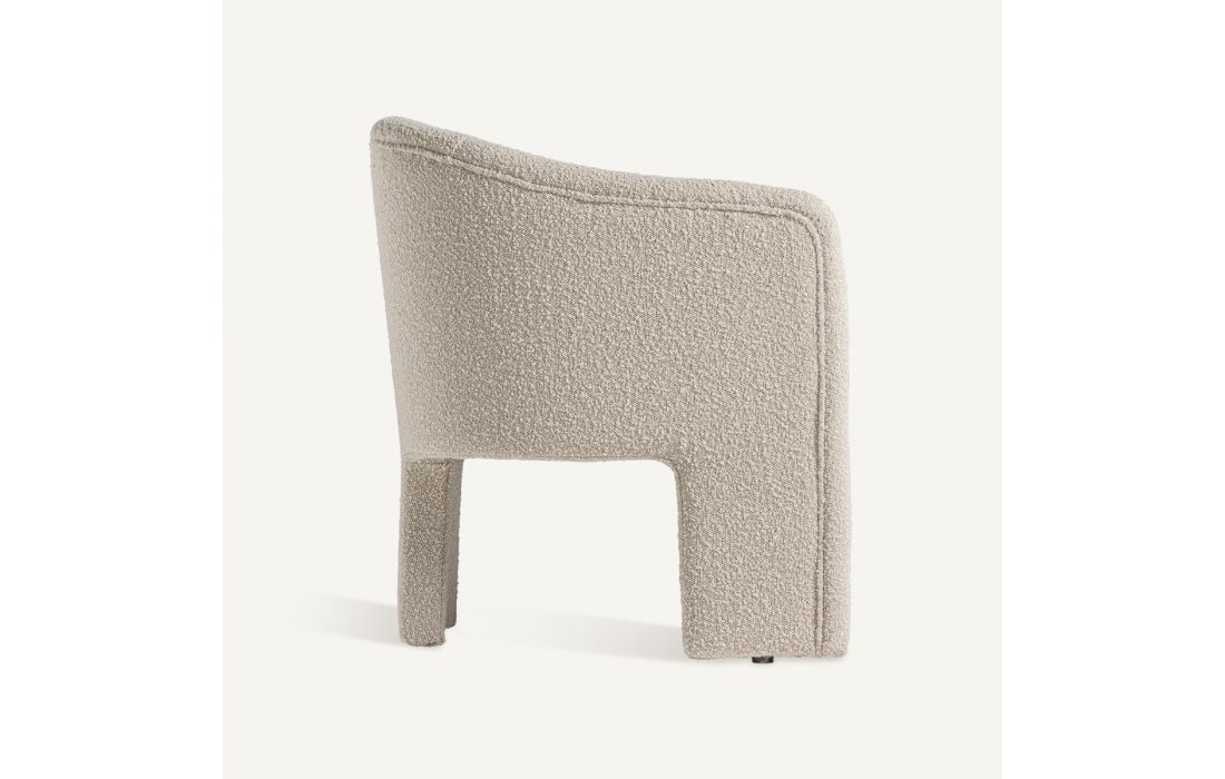 Poltrona com estrutura em madeira de pinho e estofo em tecido bouclé.