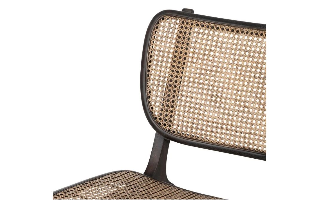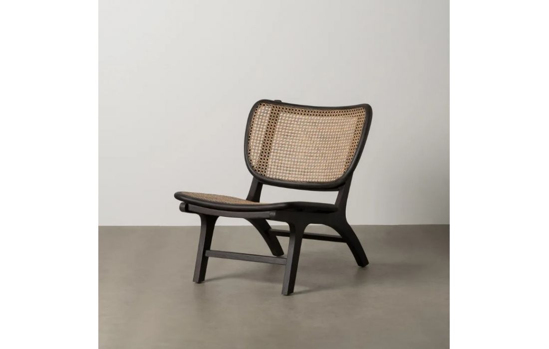 Cadeirão de design moderno com estrutura em madeira de caoba com pormenor do assento em rattan.