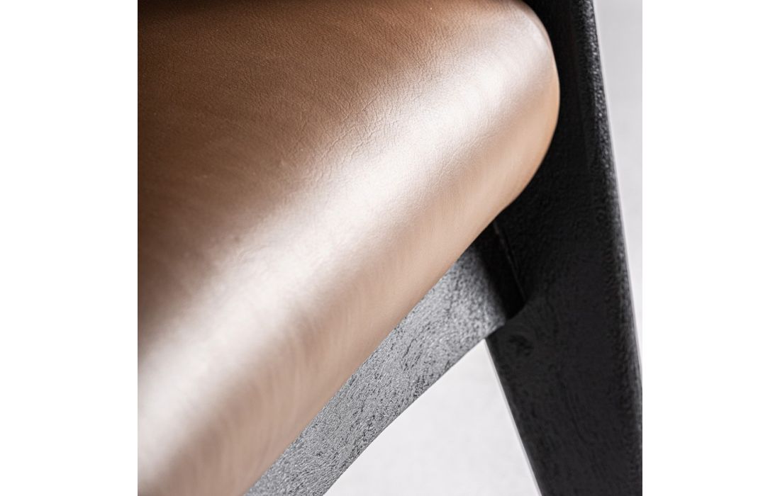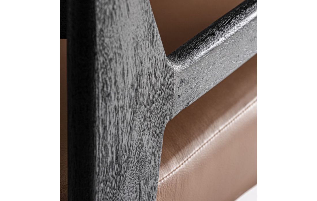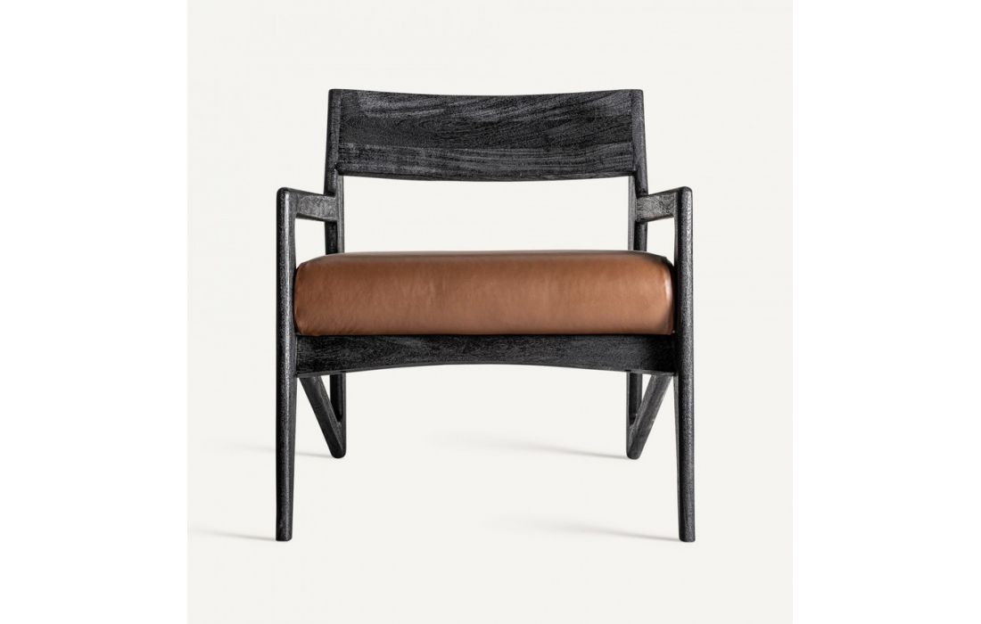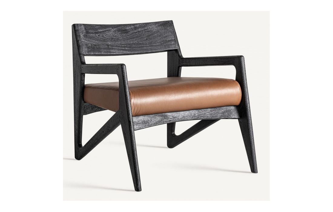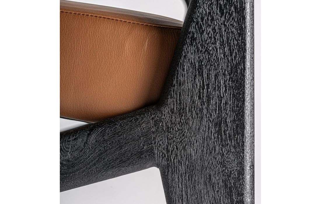 Cadeirão feito de madeira de acácia na cor preta, combinado com couro