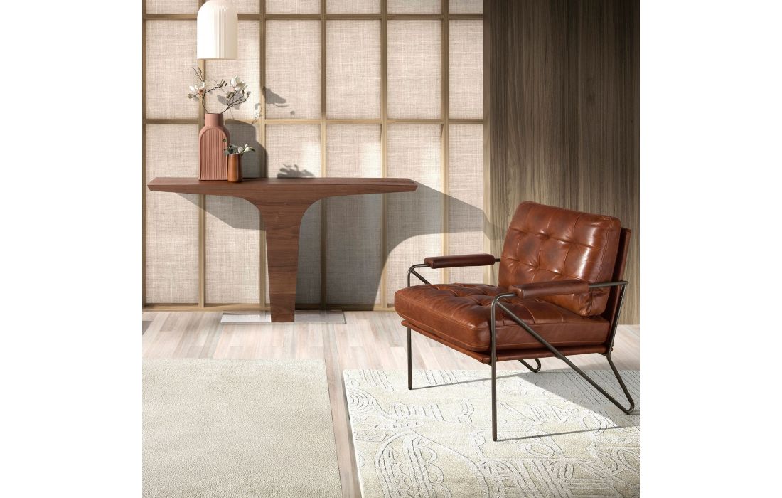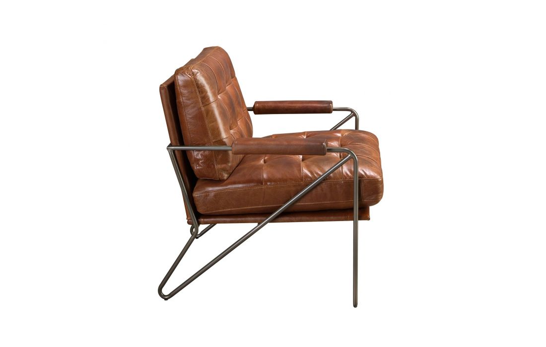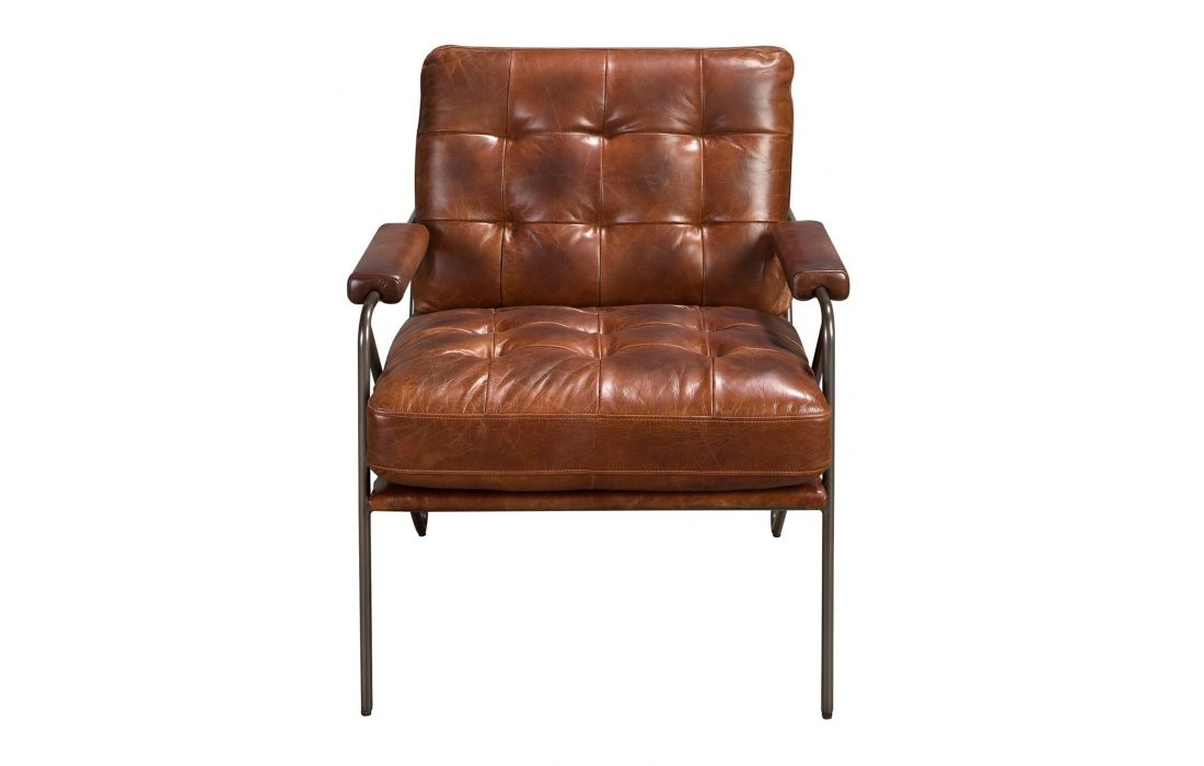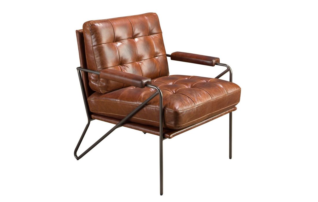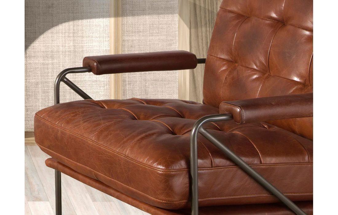 Poltrona com braços de design moderno, com assento e encosto estofados em pele e suas pernas em aço inoxidável escurecidoDestinatário :
