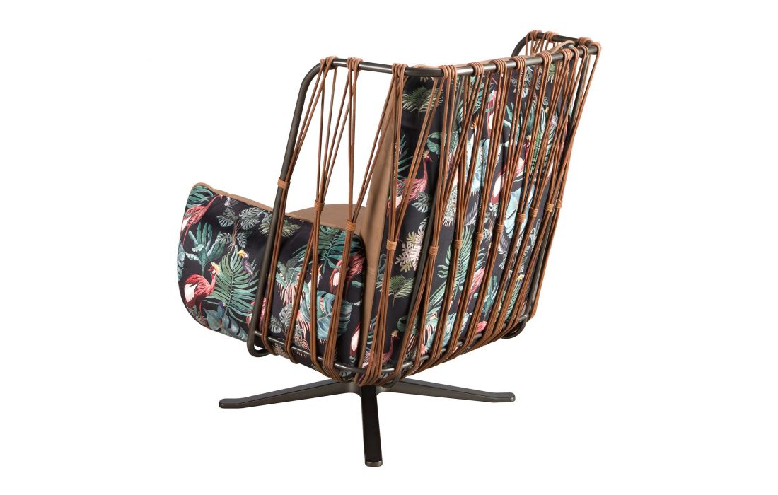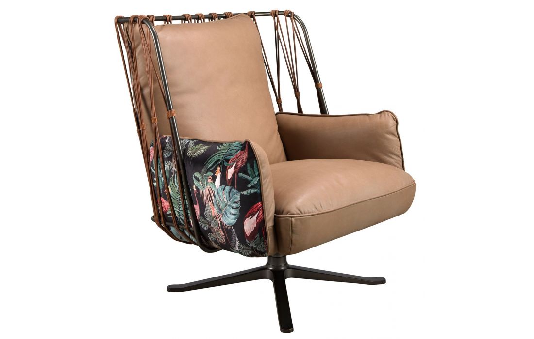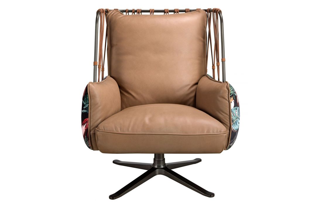 Poltrona giratória com braços de design moderno com assento estofado em pele e encosto estofado em tecido e suas pernas em aço inoxidávelDestinatário :