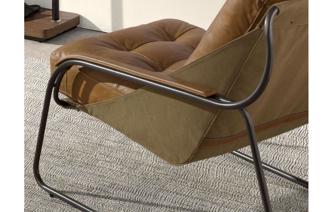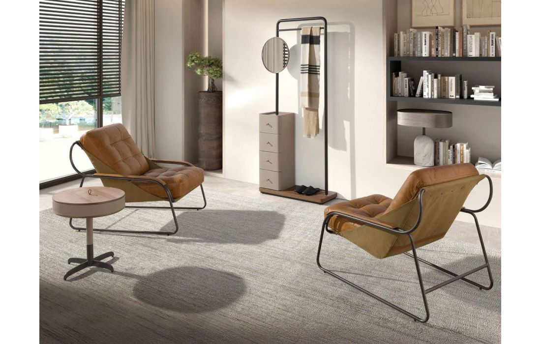 Poltrona moderna com braços, assento e encosto estofados em pele de bovino e pernas em aço inoxidável polido, esta poltrona é a combinação perfeita entre design e confortoDestinatário :