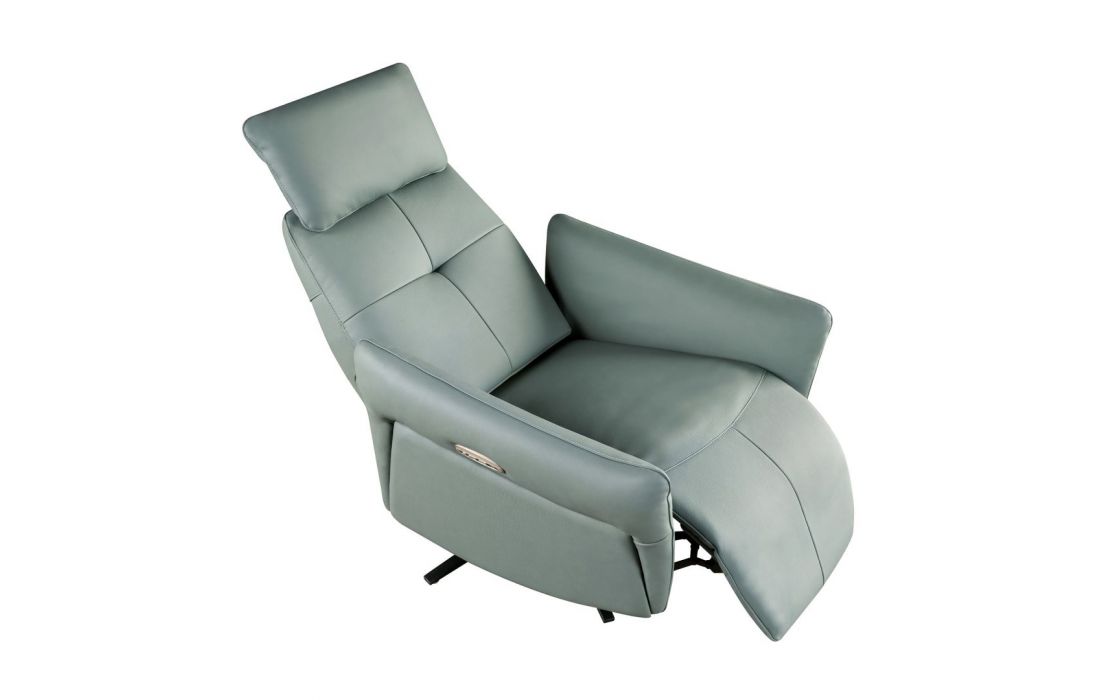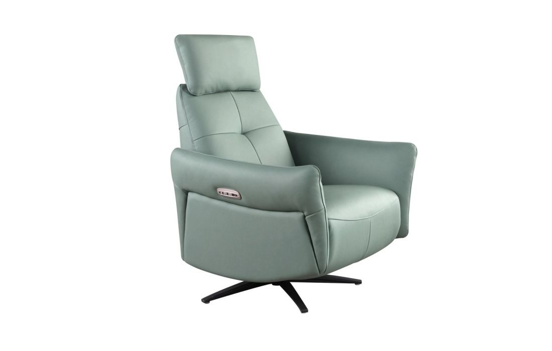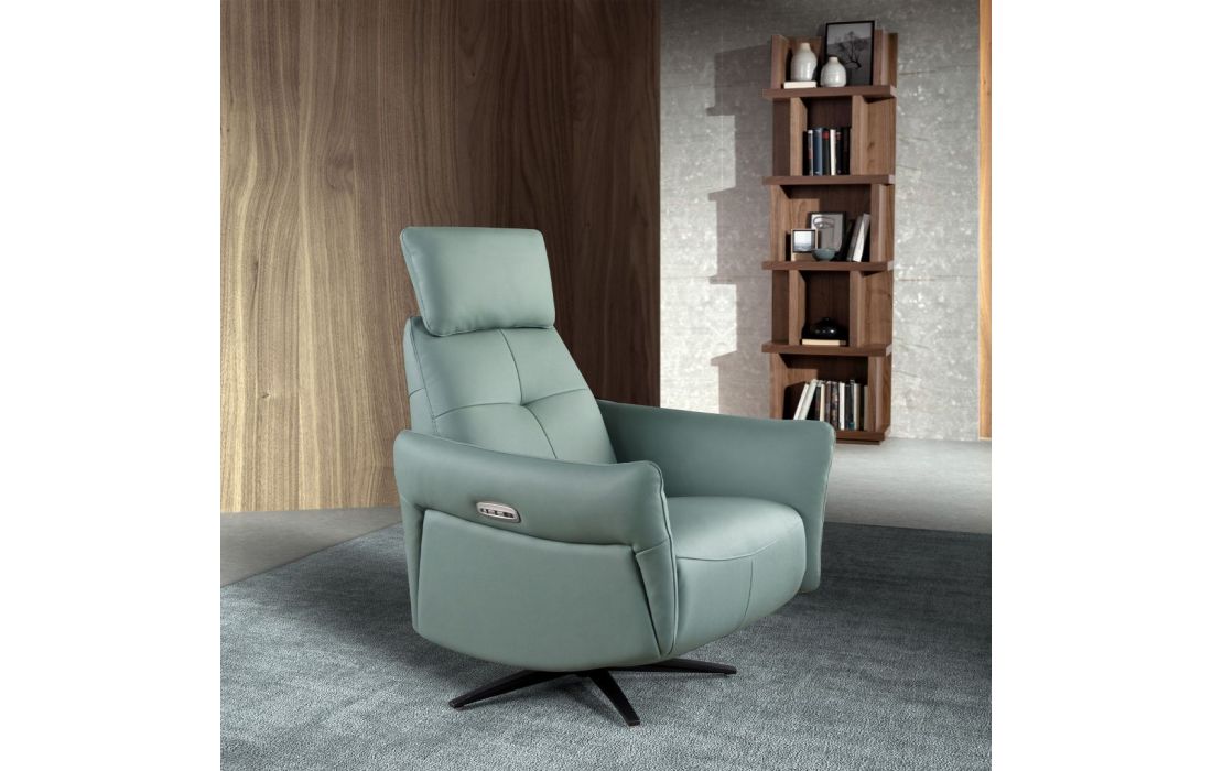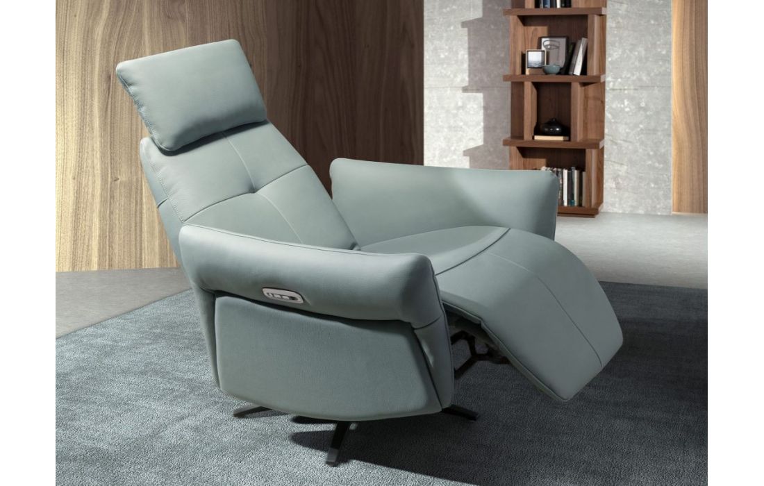 Poltrona giratória moderna com braços e assento e encosto estofados em pele de bovino e as suas pernas em aço inoxidável com revestimento epóxi preto fazem desta poltrona reclinável giratória com mecanismo elétrico o equilíbrio perfeito entre estilo e confortoDestinatário :