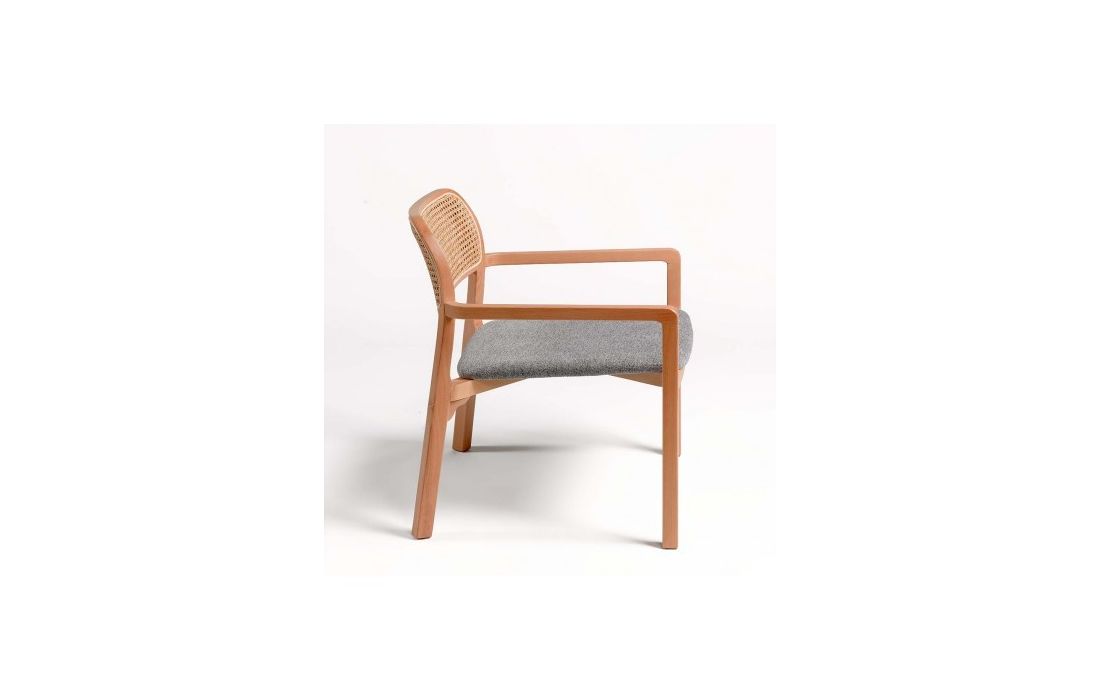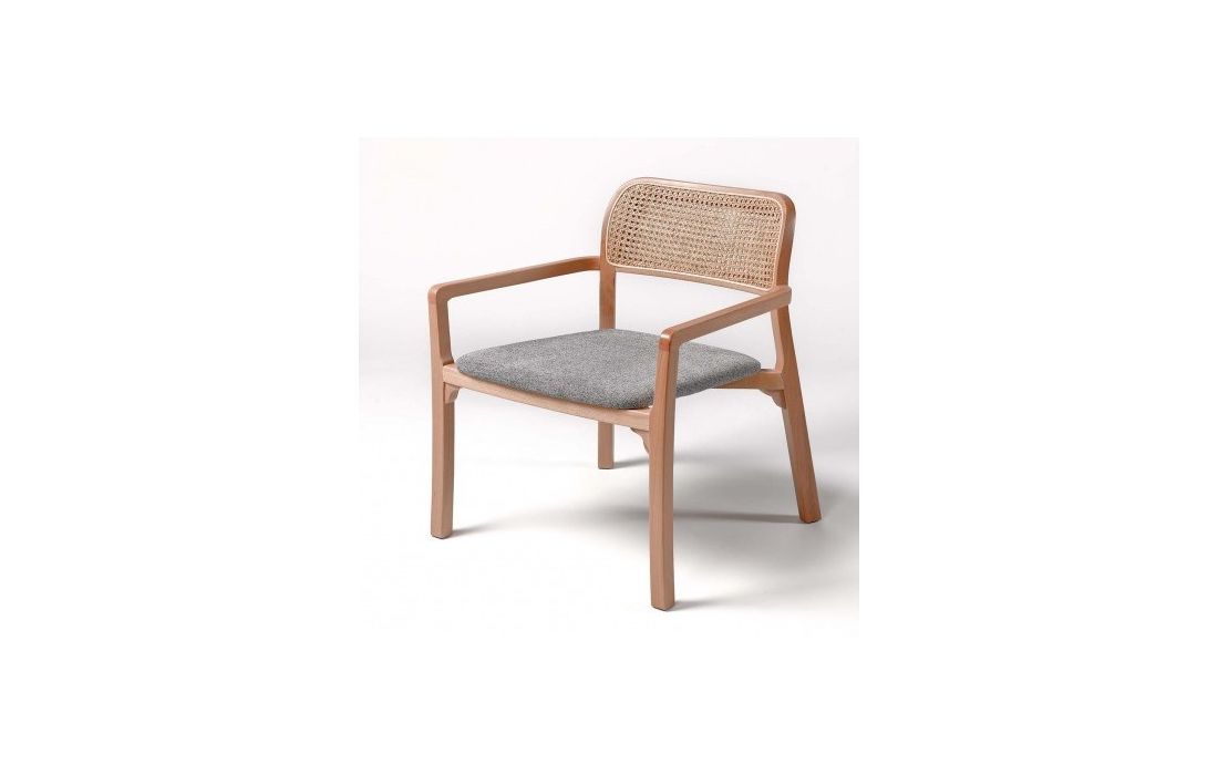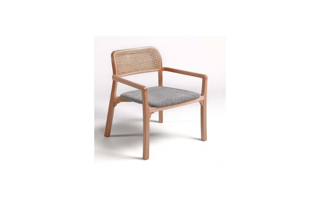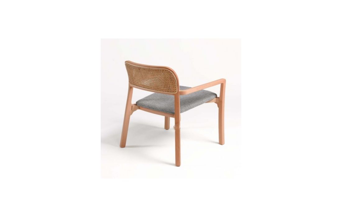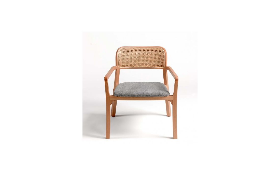 Poltrona de madeira em tom natural com assento estofado cinza e encosto em ripas de rattan natural. Este design de poltrona é espaçoso e esteticamente leve, graças às linhas retas dos braços e às cavidades nos braços e no encosto.Destinatário :