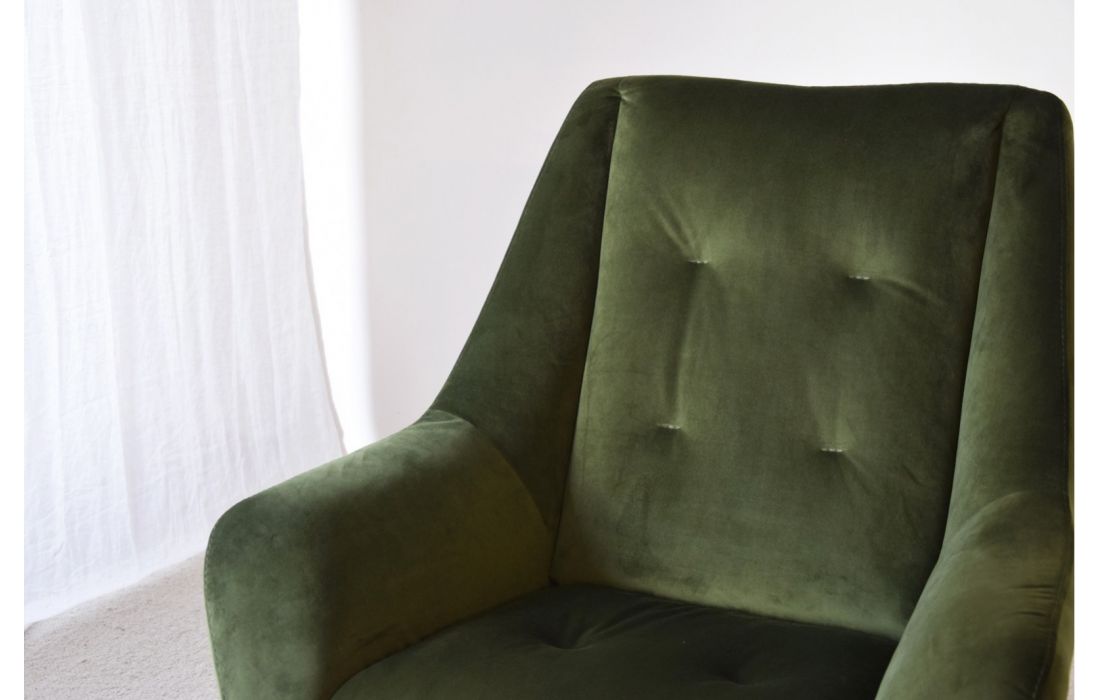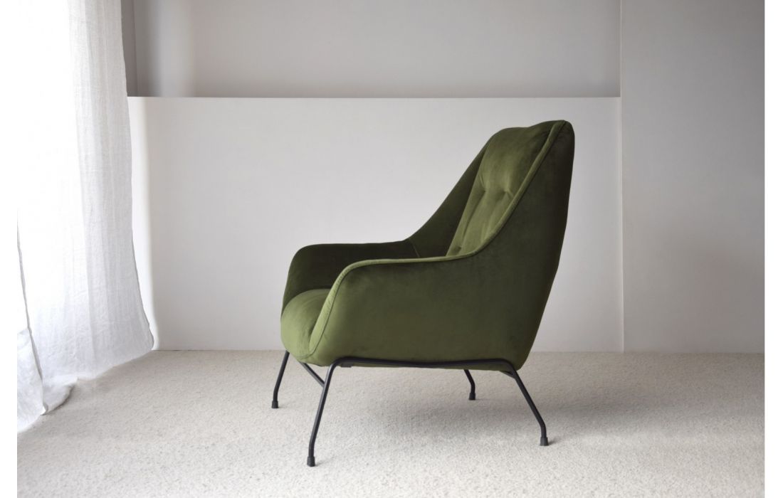 É uma poltrona elegante e confortável, com encosto alto e braços almofadados. Os pés metálicos conferem-lhe um toque moderno, tornando-a adequada para espaços interiores sofisticados e acolhedores, disponível em duas cores.