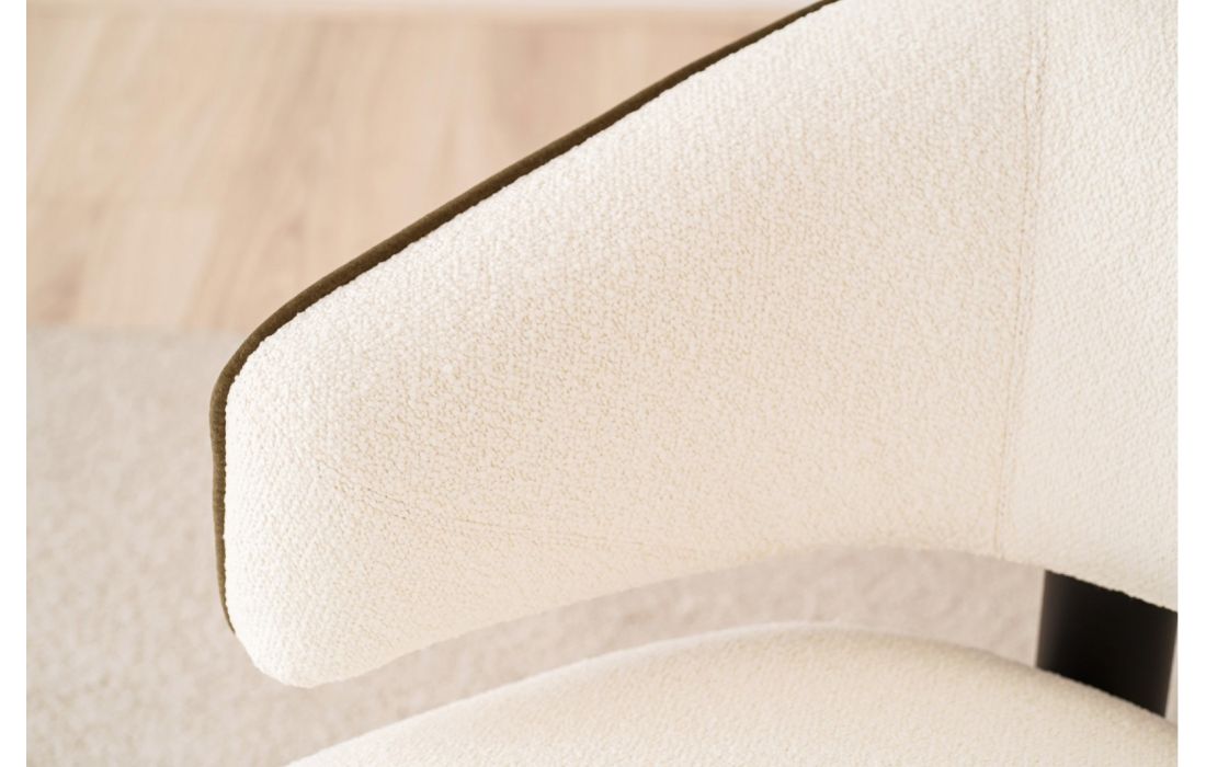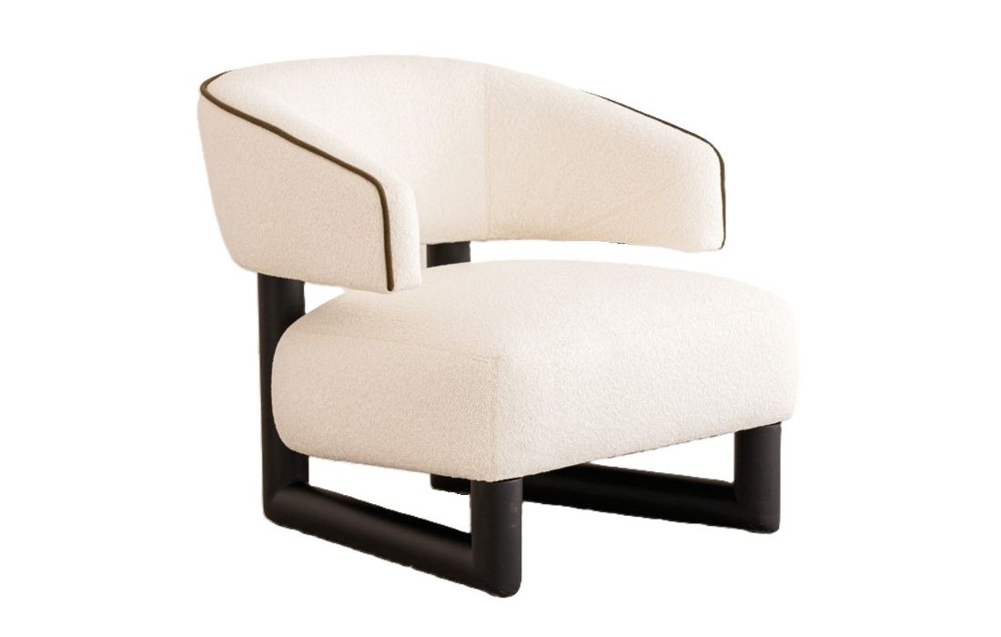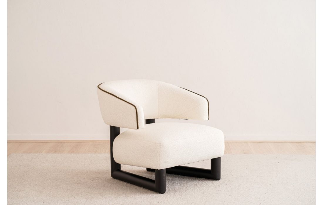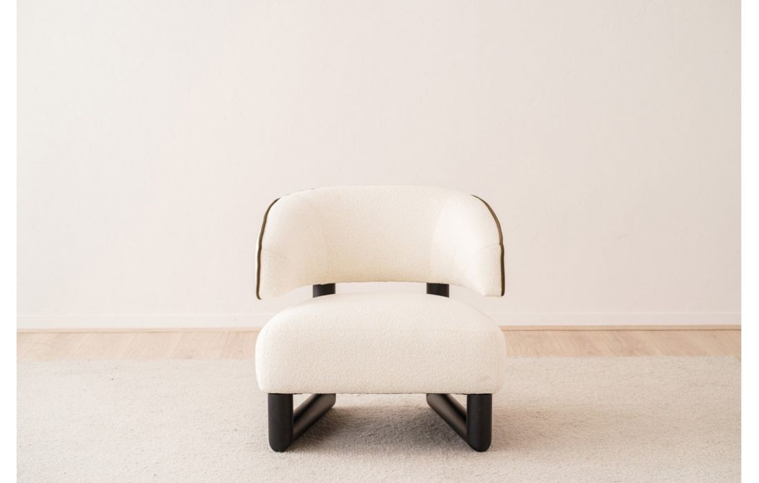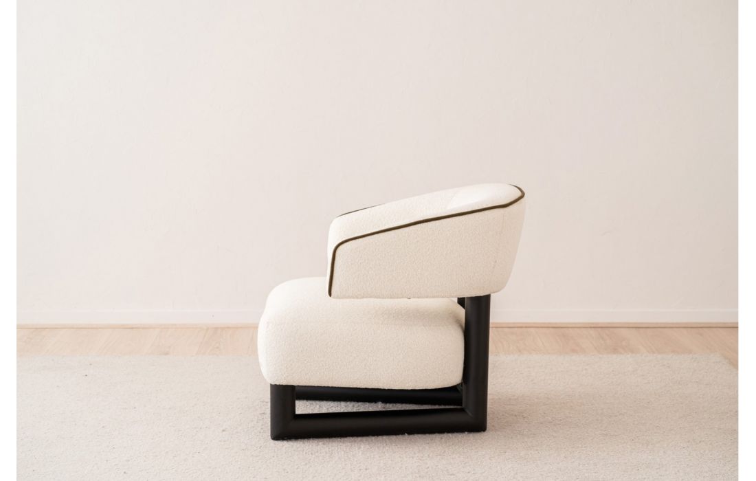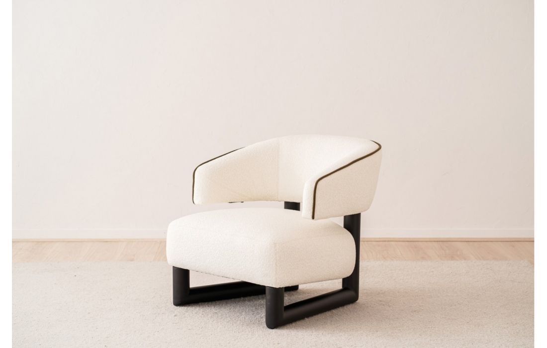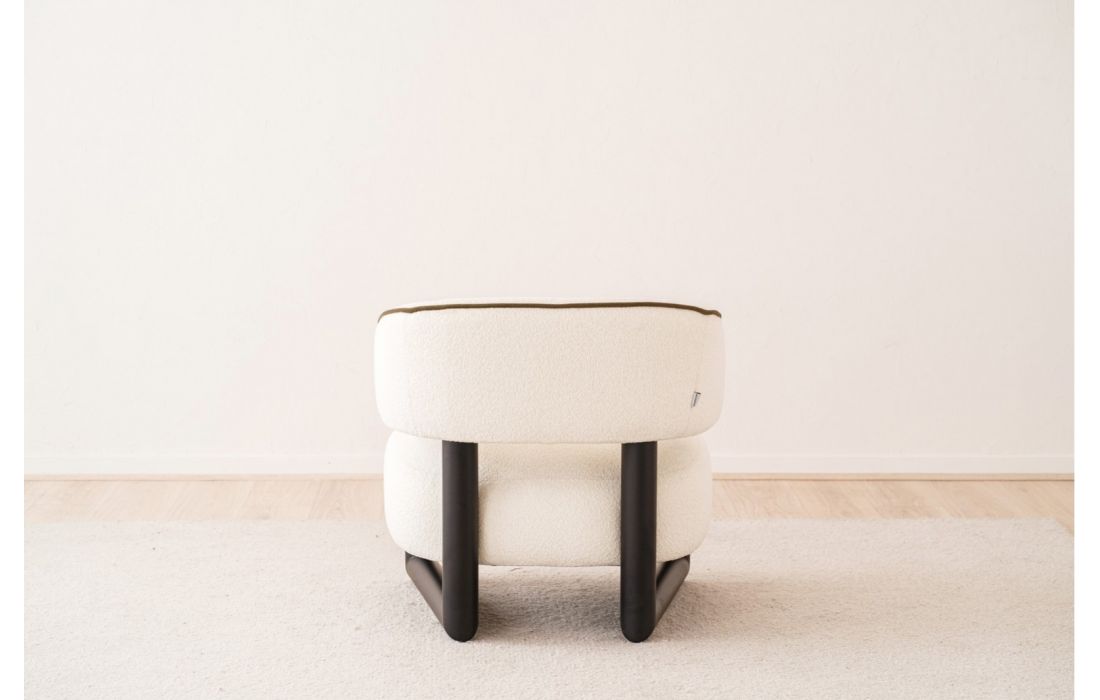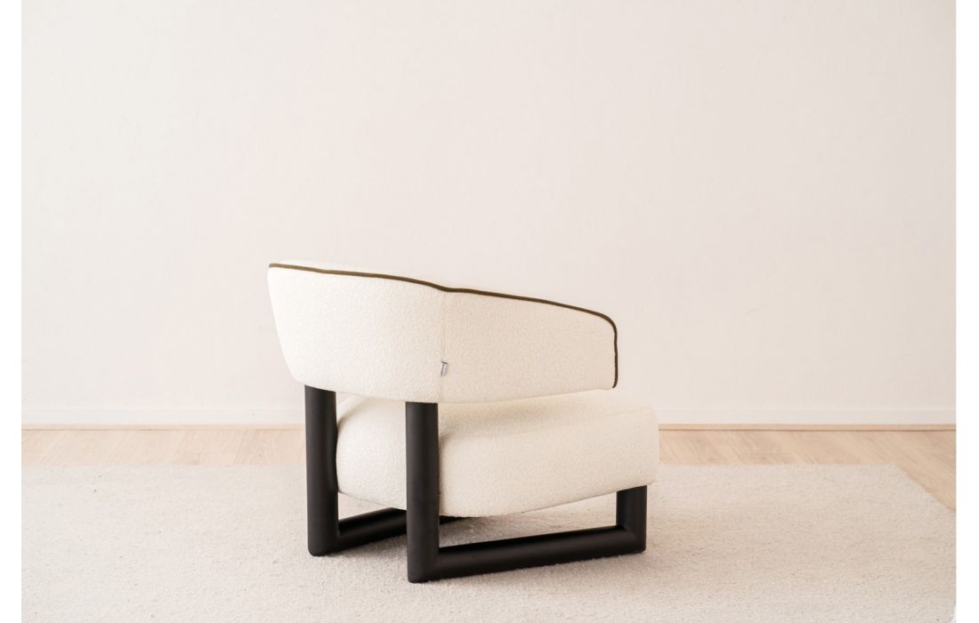 Poltrona de assento arredondado, com pernas em madeira maciça. A estrutura em madeira prolonga-se para ligar o assento e o encosto, peças independentes que criam um espaço entre si. O encosto curvo envolve o corpo, garantindo conforto e elegância.