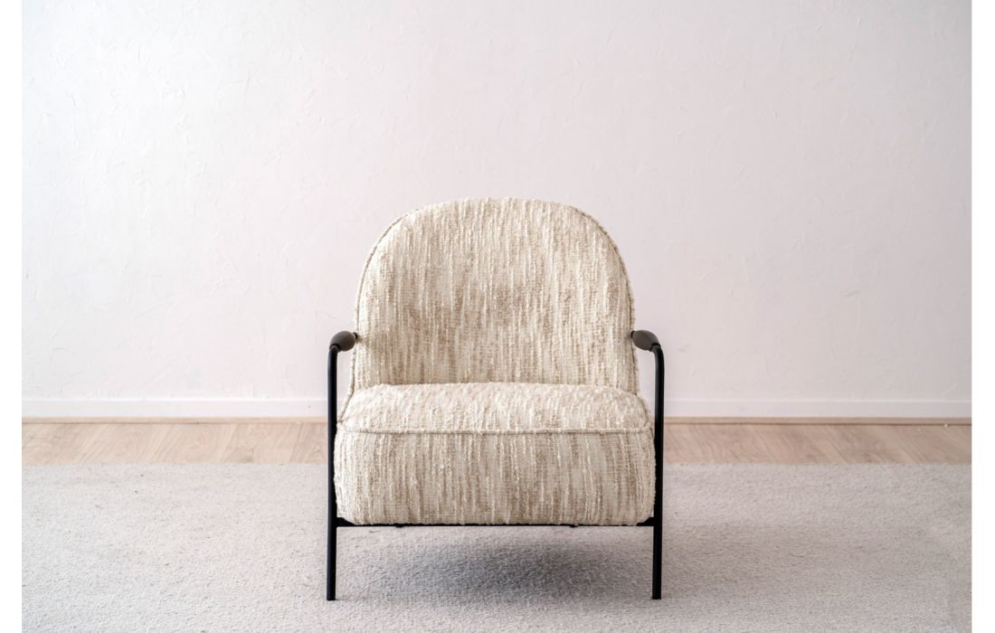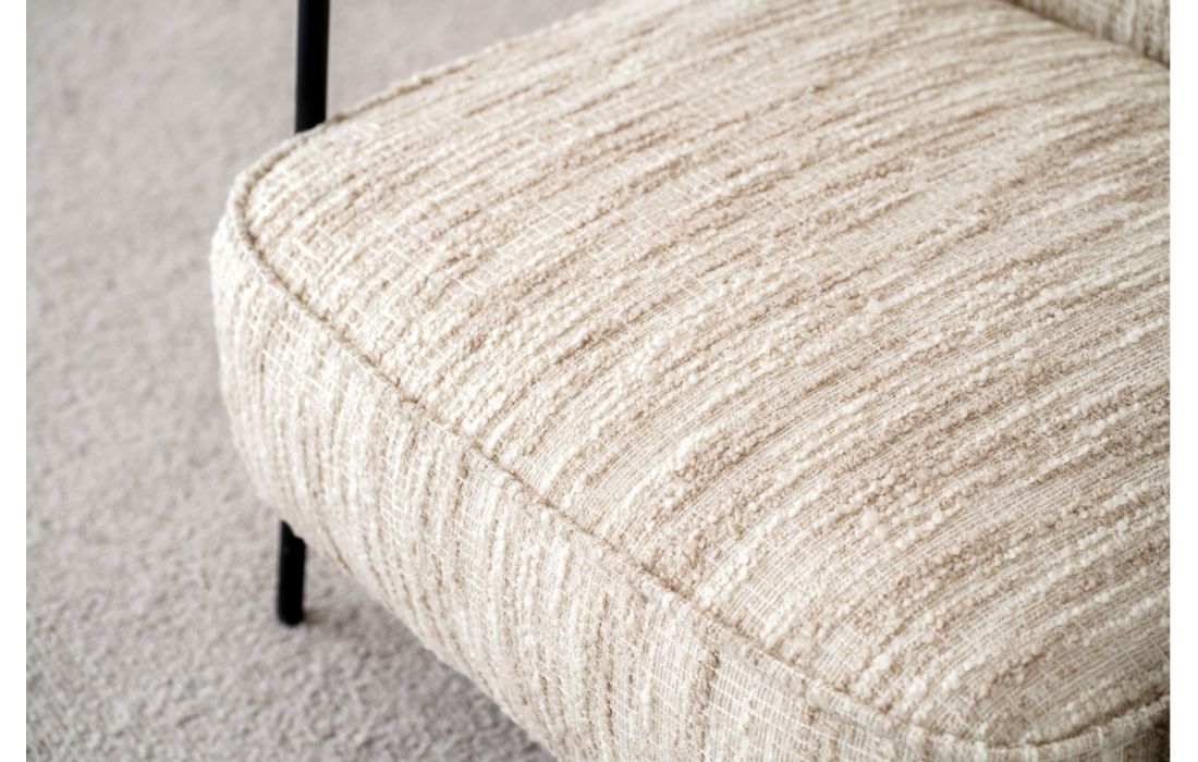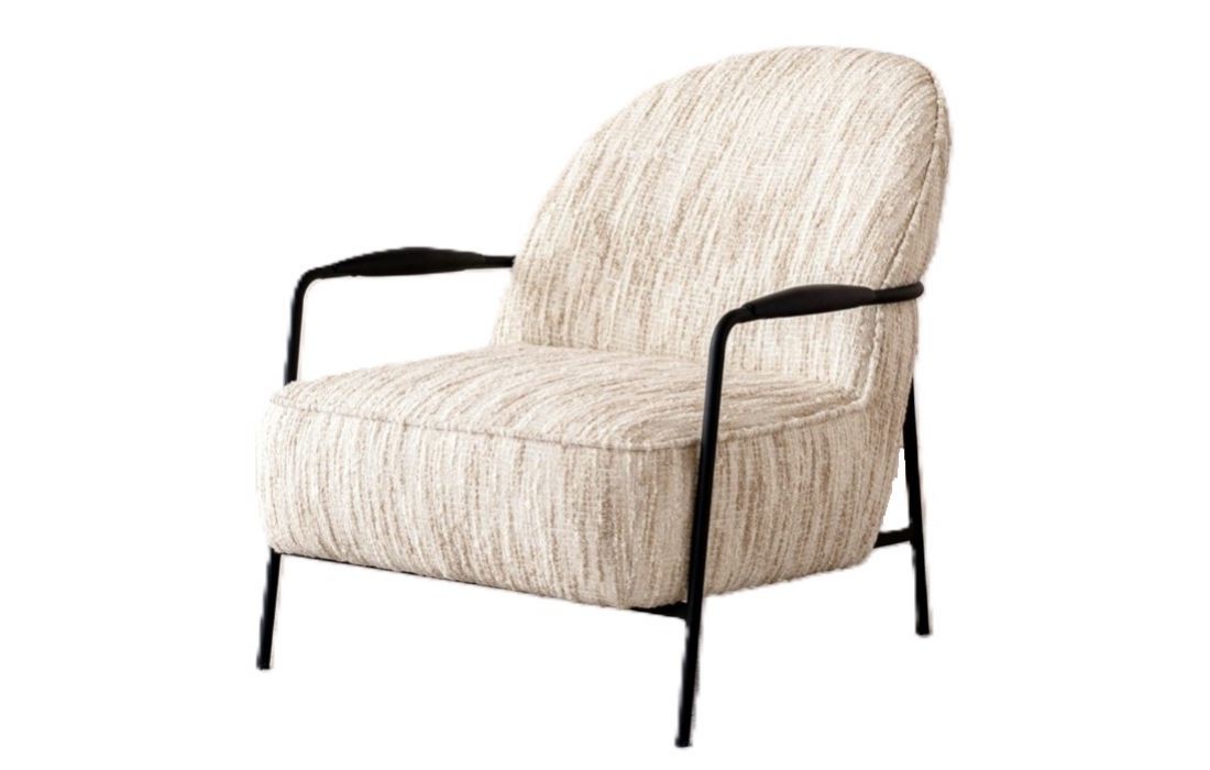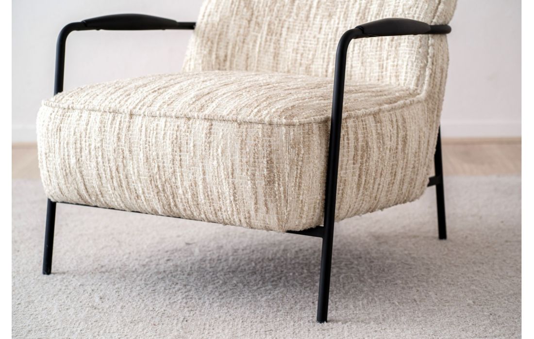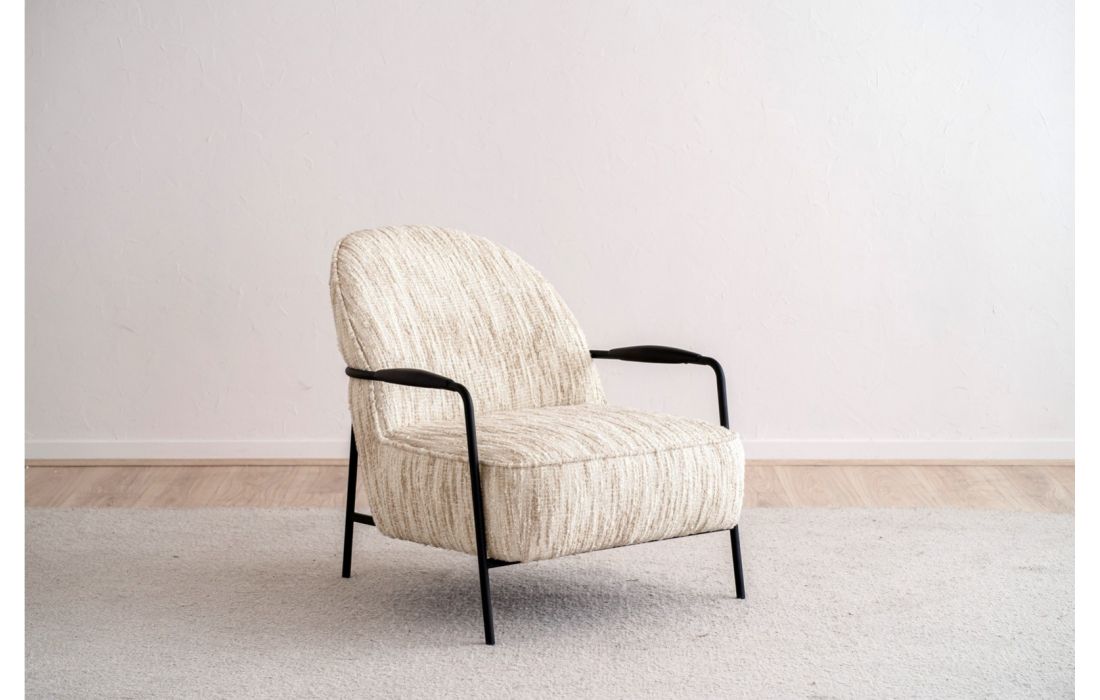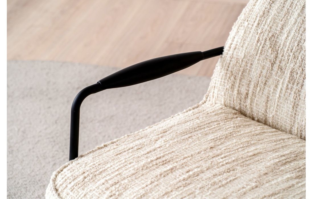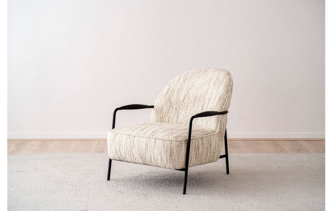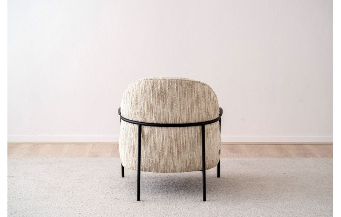 Poltrona de estilo contemporâneo, a estrutura em metal define pernas e braços, com detalhes em madeira preta de forma arredondada. O encosto e o assento formam um conjunto contínuo, realçado pelo mesmo tecido.