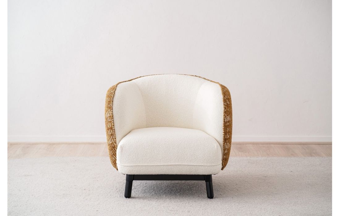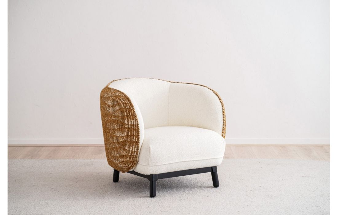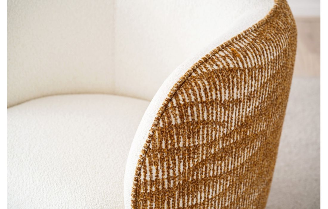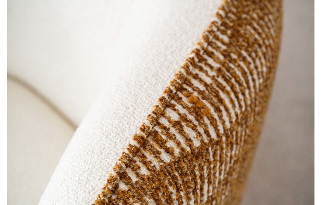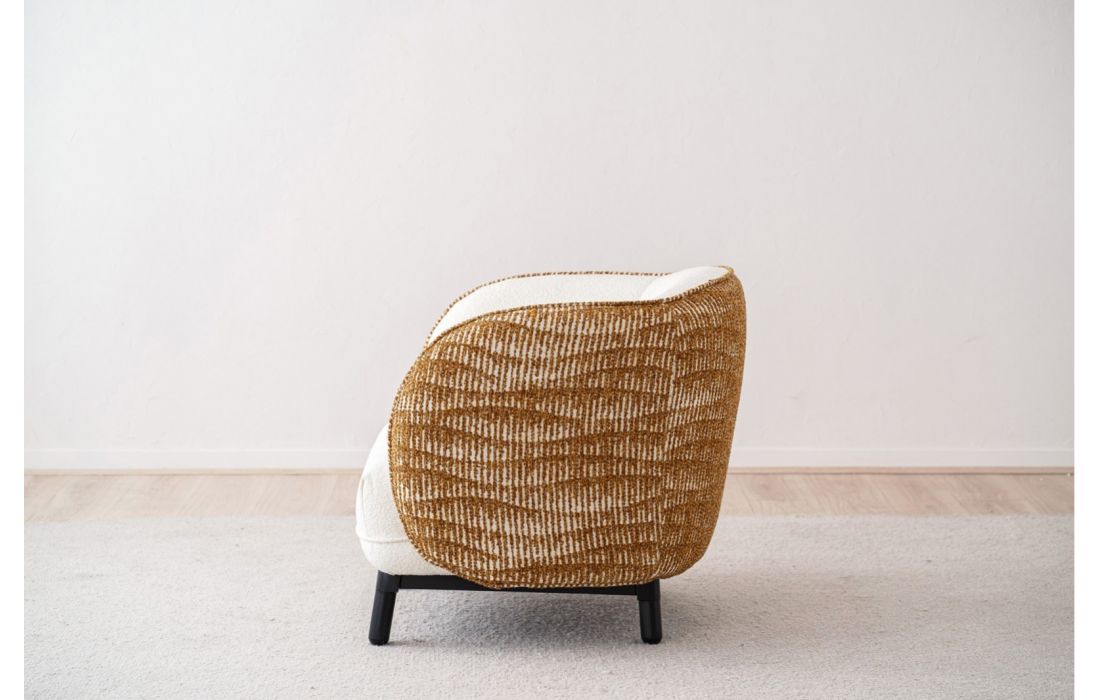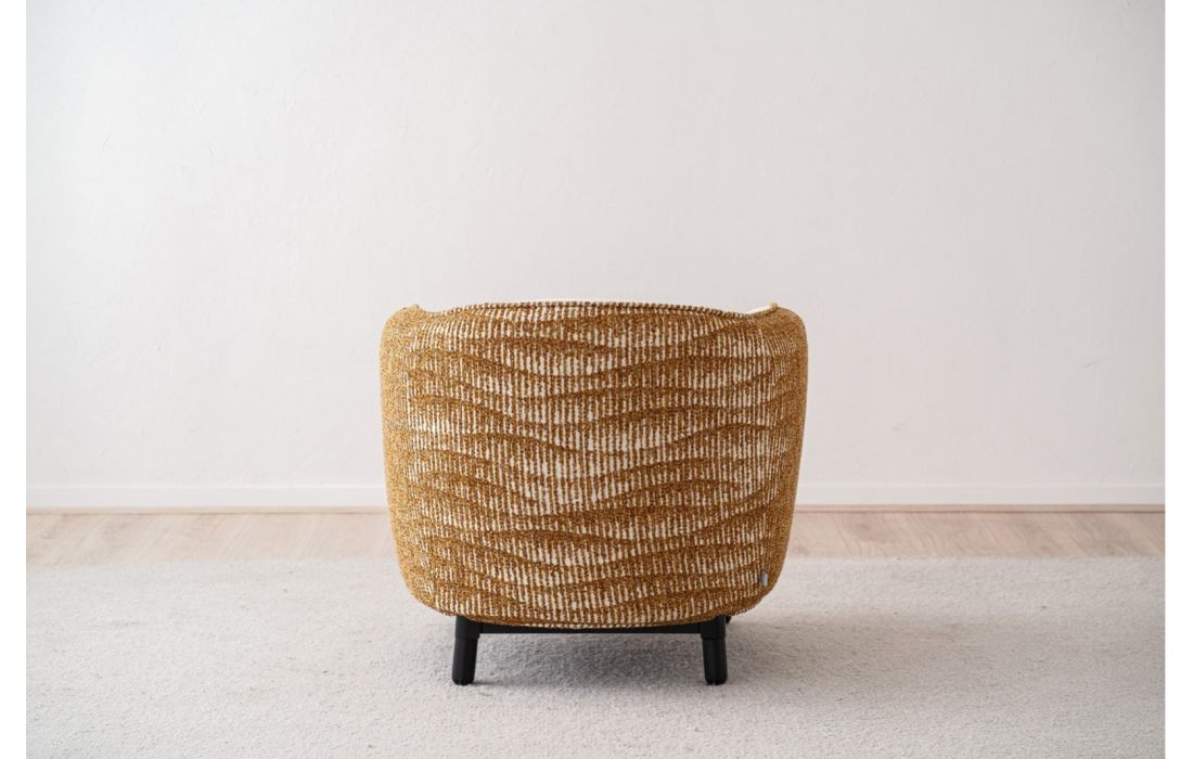 Poltrona de linhas curvas e estilo contemporâneo, o interior em tecido contrasta com o exterior estampado em tons de mostarda ocre. As pernas arredondadas em madeira de carvalho, acabadas em preto, reforçam o caráter da peça.