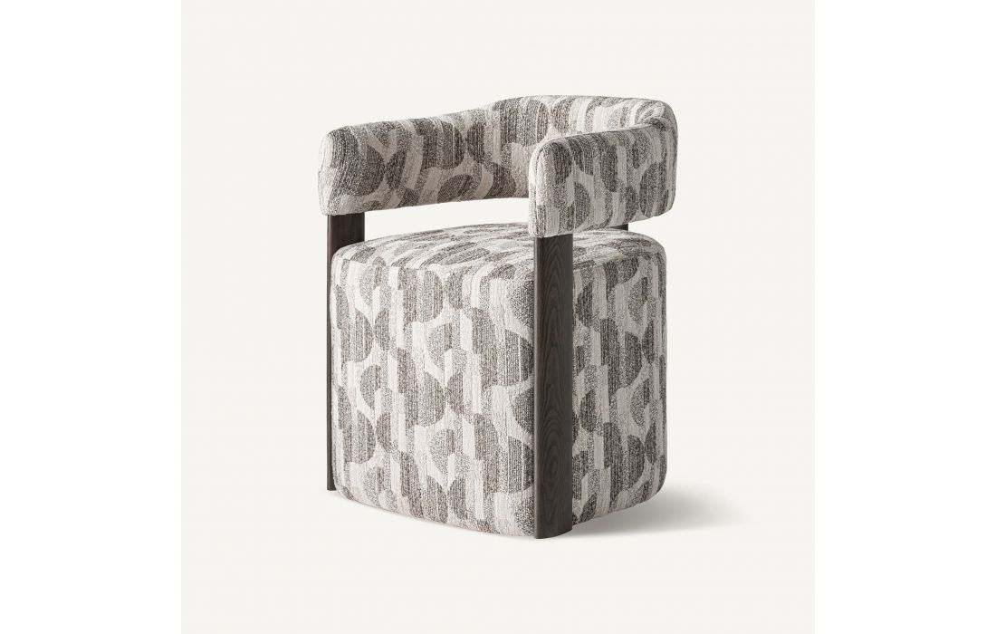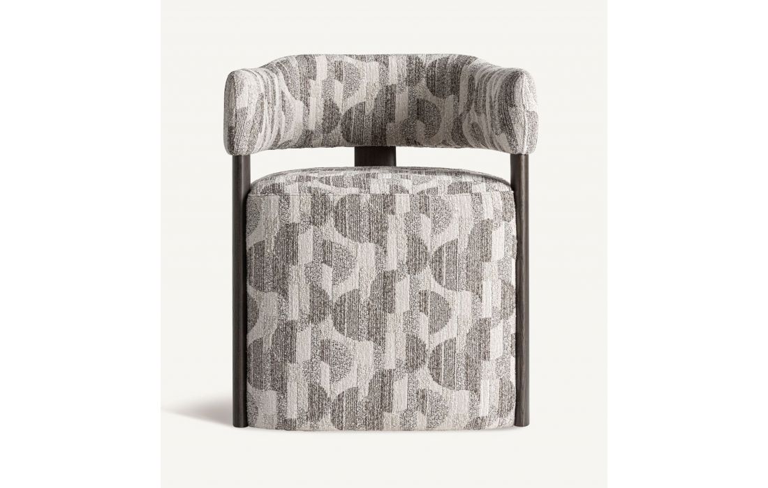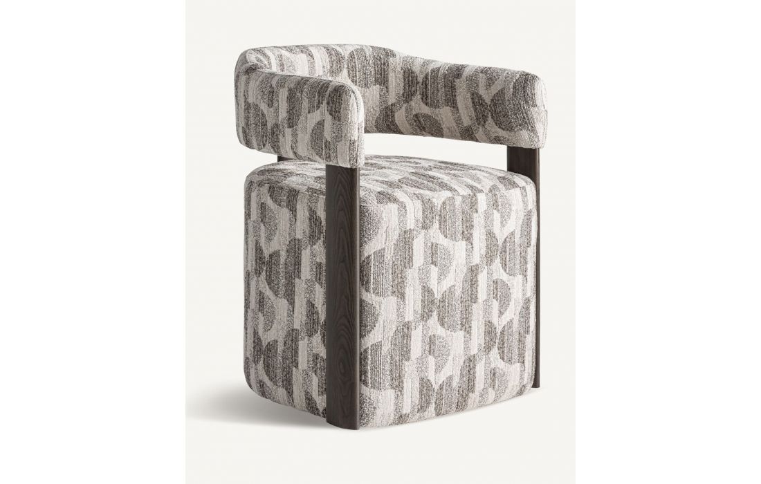 Revestida em tecido com padrão impresso em tons neutros, destaca-se pela sua textura rica e visual moderno.