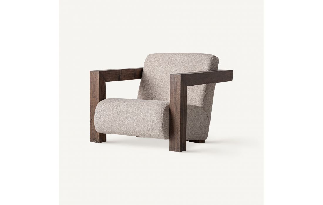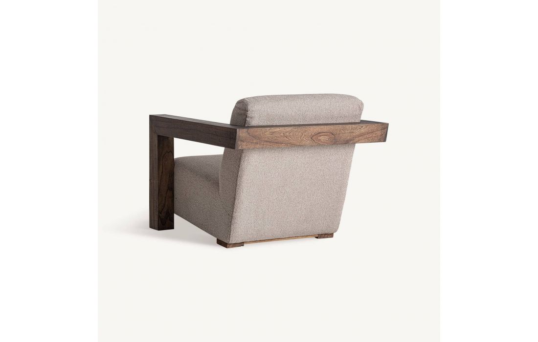 Poltrona em madeira de mindi com estrutura robusta e linhas geométricas marcantes. Estofada em tecido de toque suave, oferece conforto e elegância. Ideal para ambientes contemporâneos, combinando design sofisticado e funcionalidade.