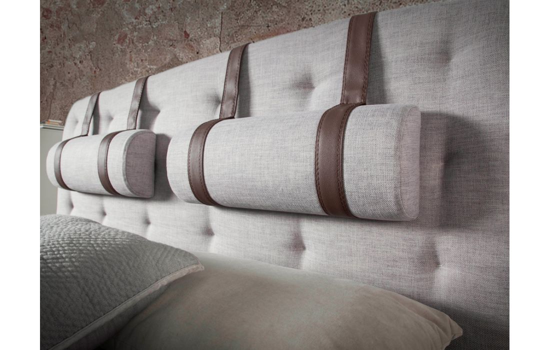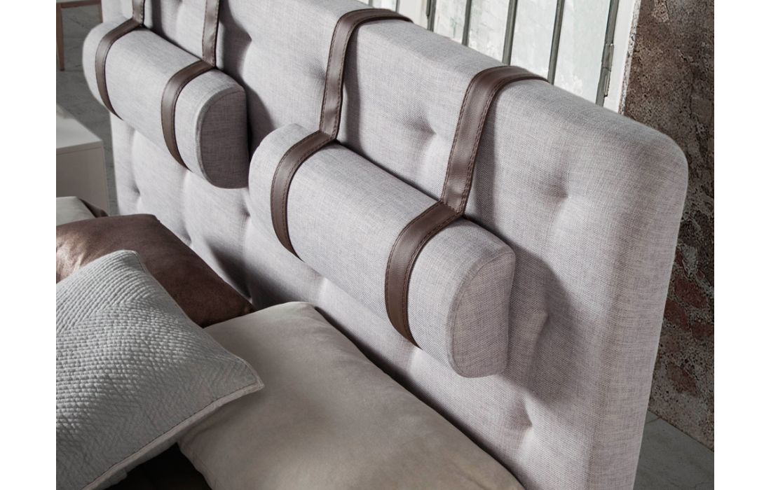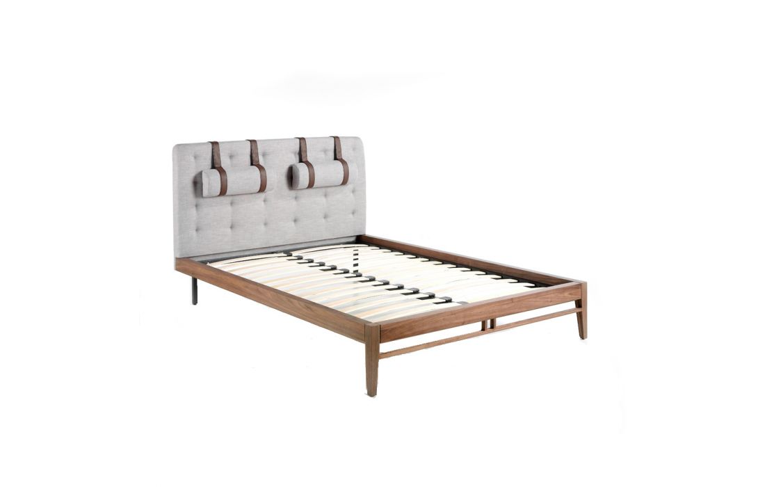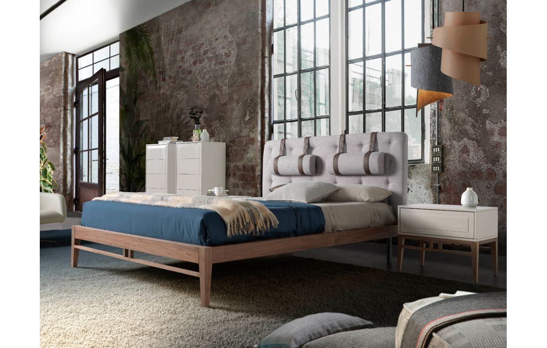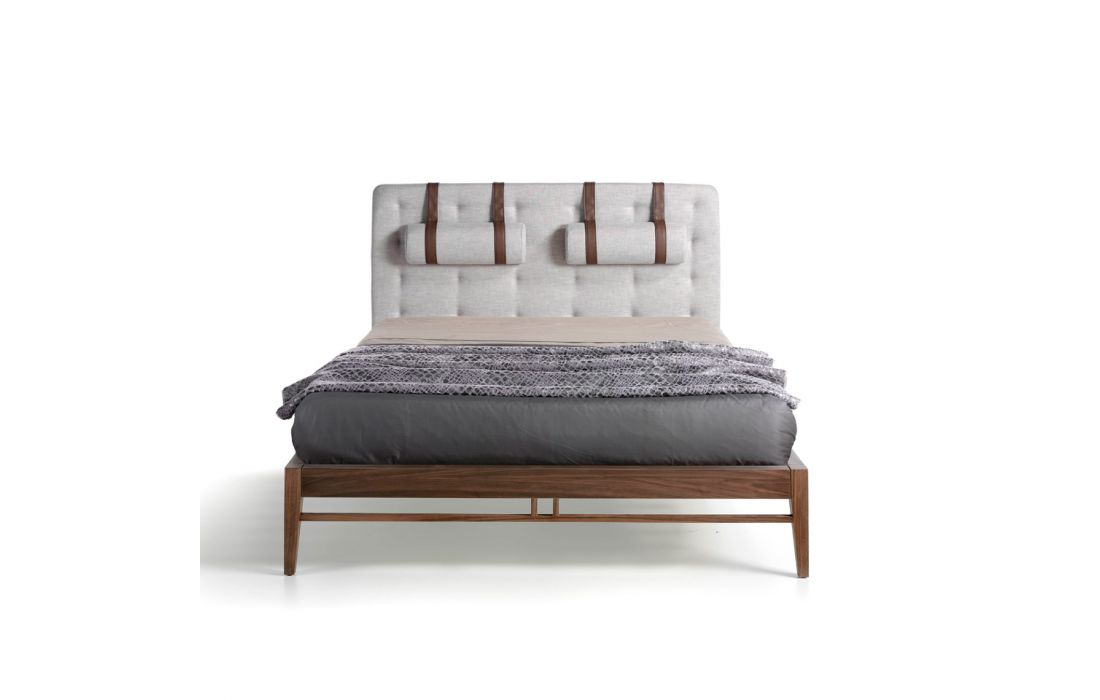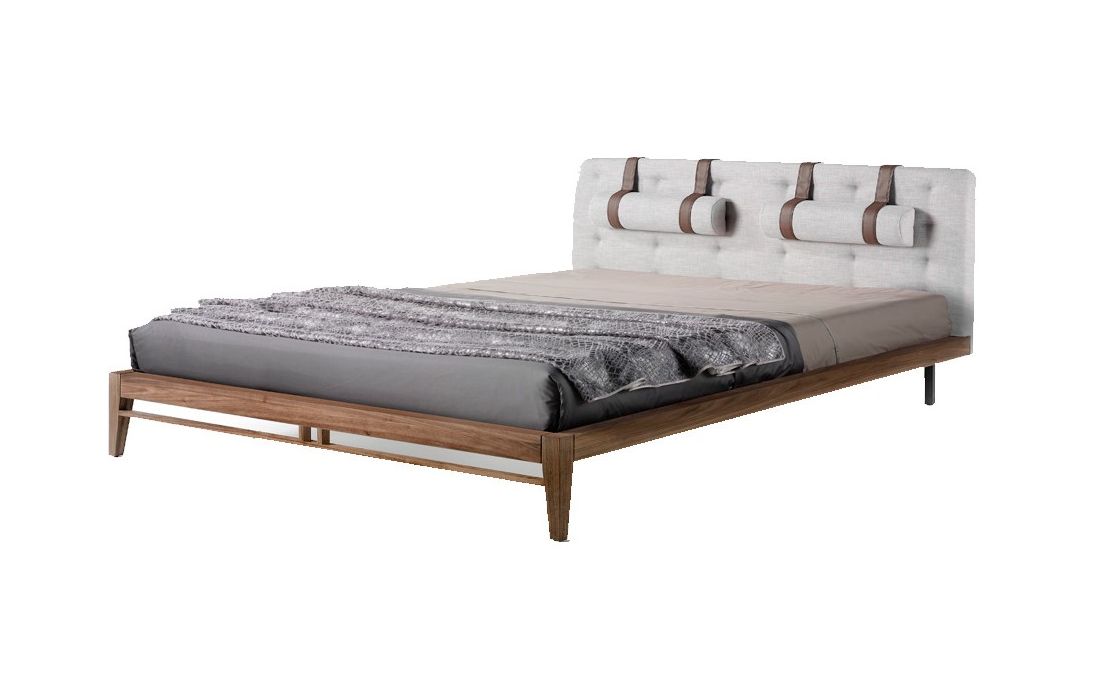Cama estofada nos vários revetimentos possíveis e de madeira folheada em nogueira.