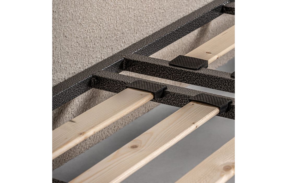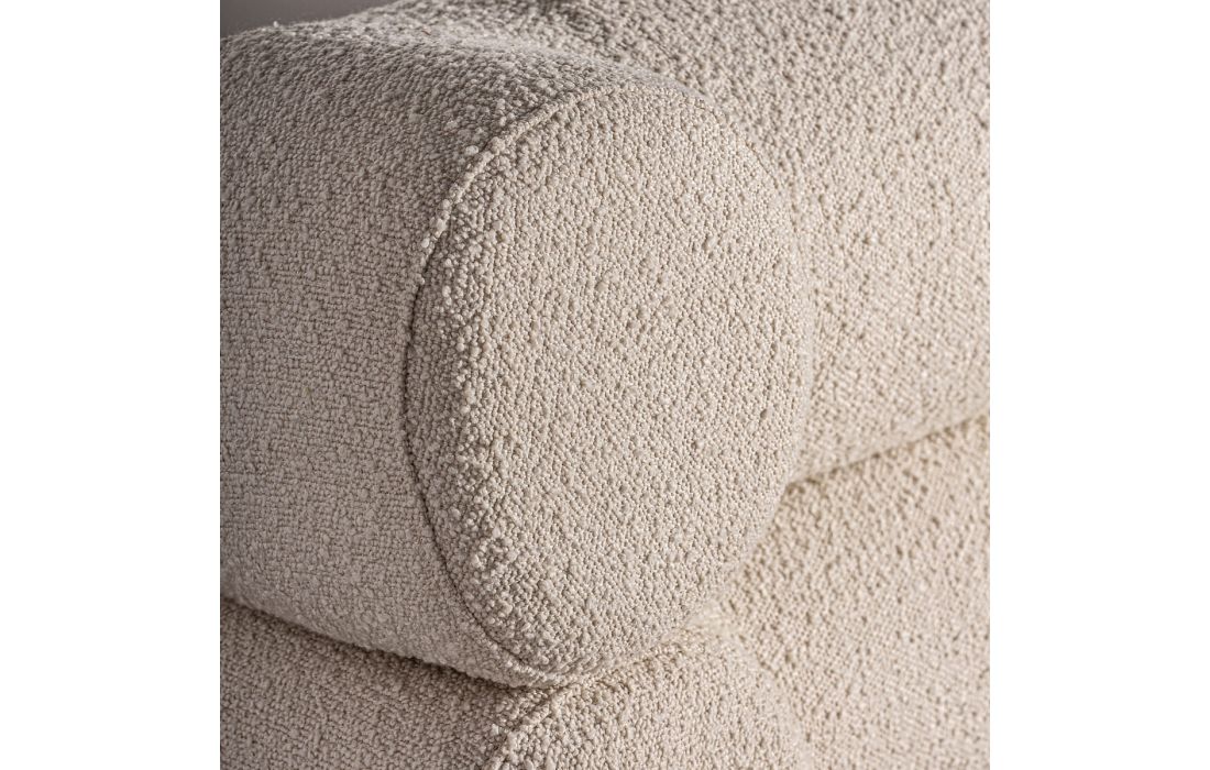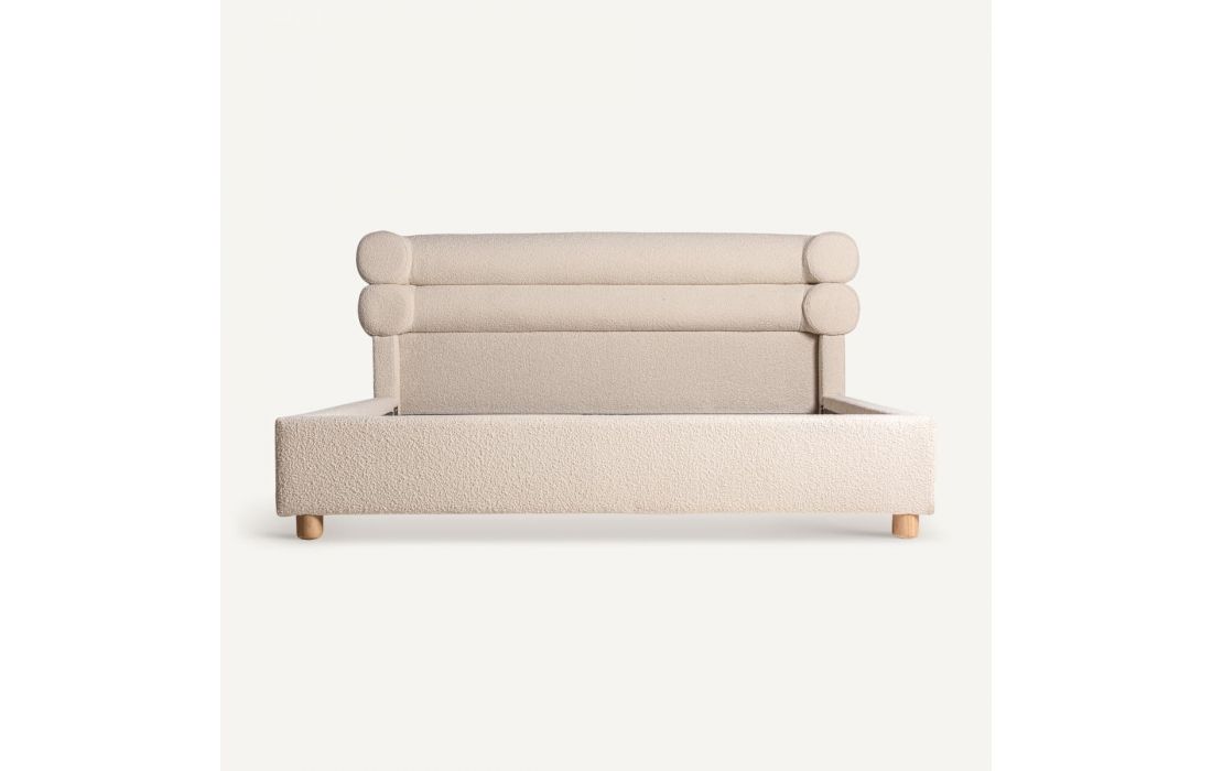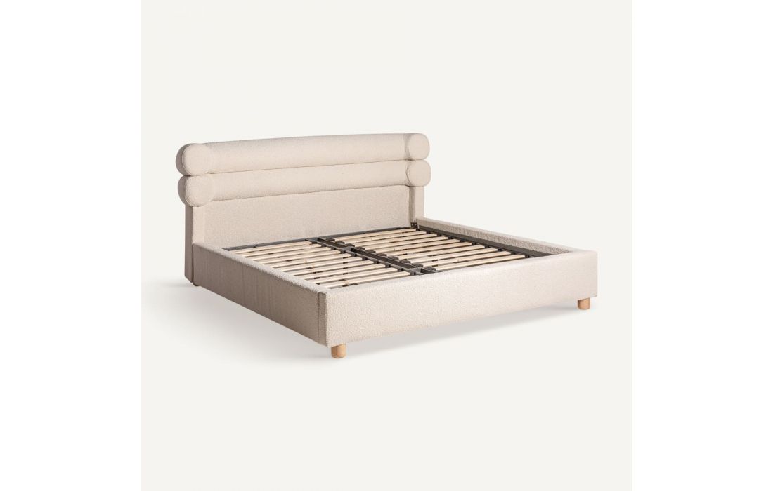 Cama no estilo contemporâneo feita em madeira de pinho e tecido bouclé na cor brancaDestinatário :