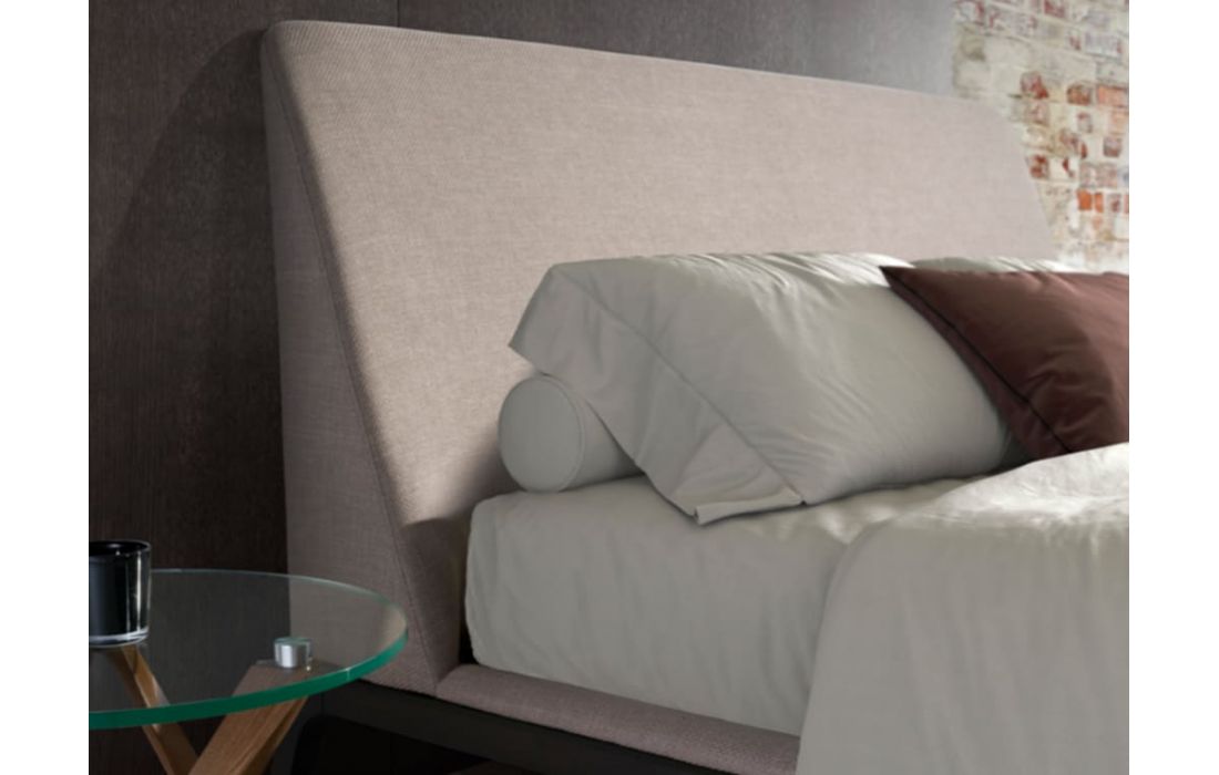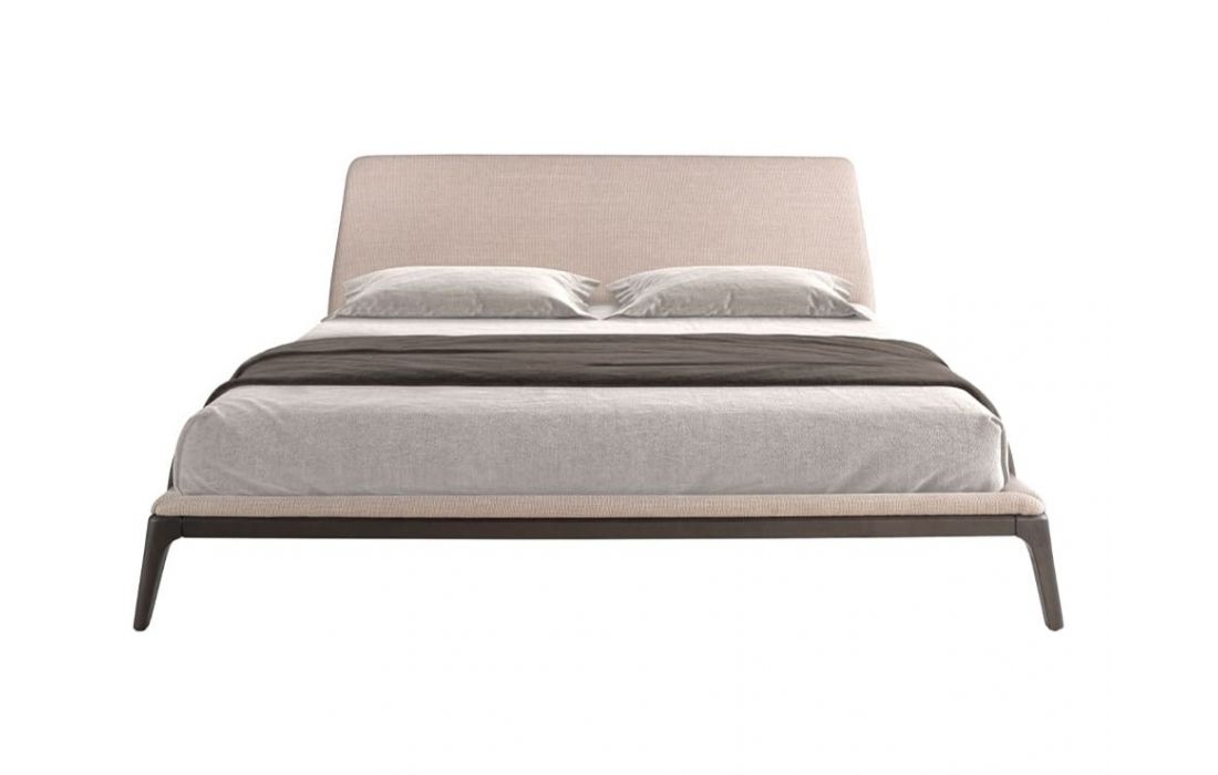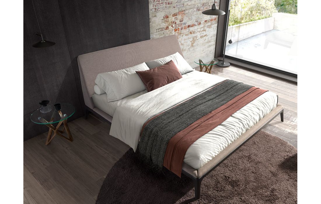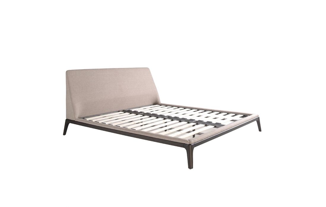Cama de casal de design moderno com cabeceira e estrutura em tecido cinza e pés em madeira. Inclui um estrado de várias ripas feito de madeira de pinho.