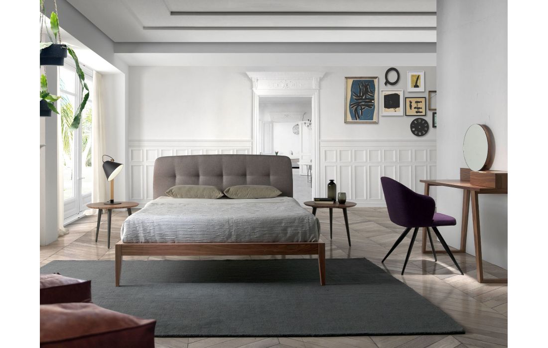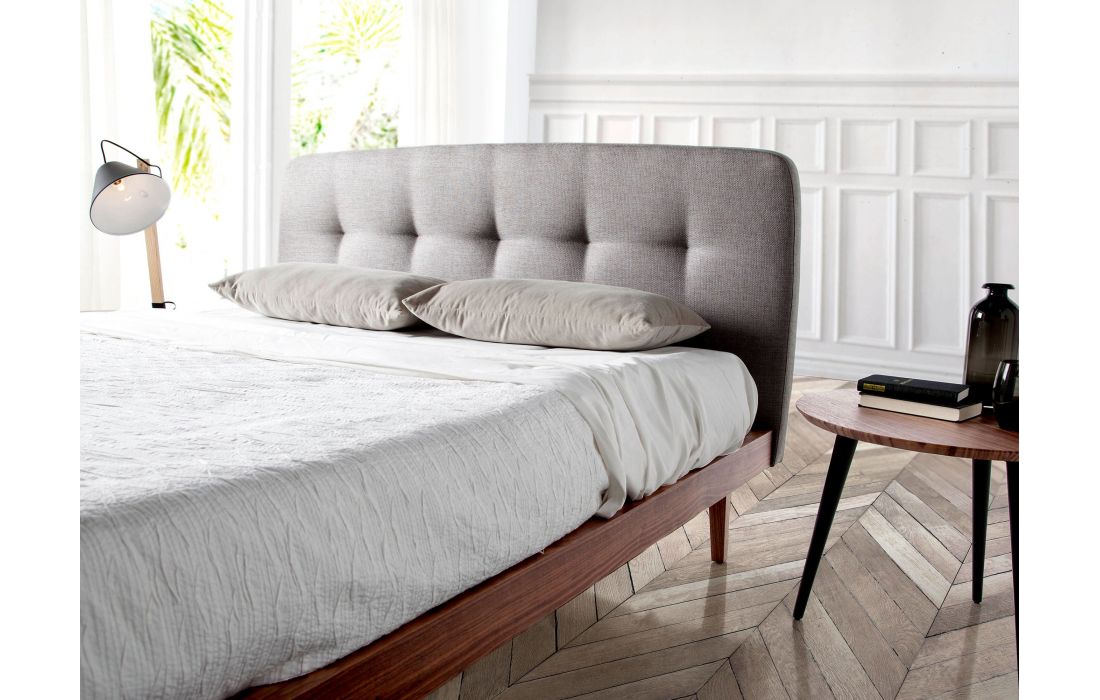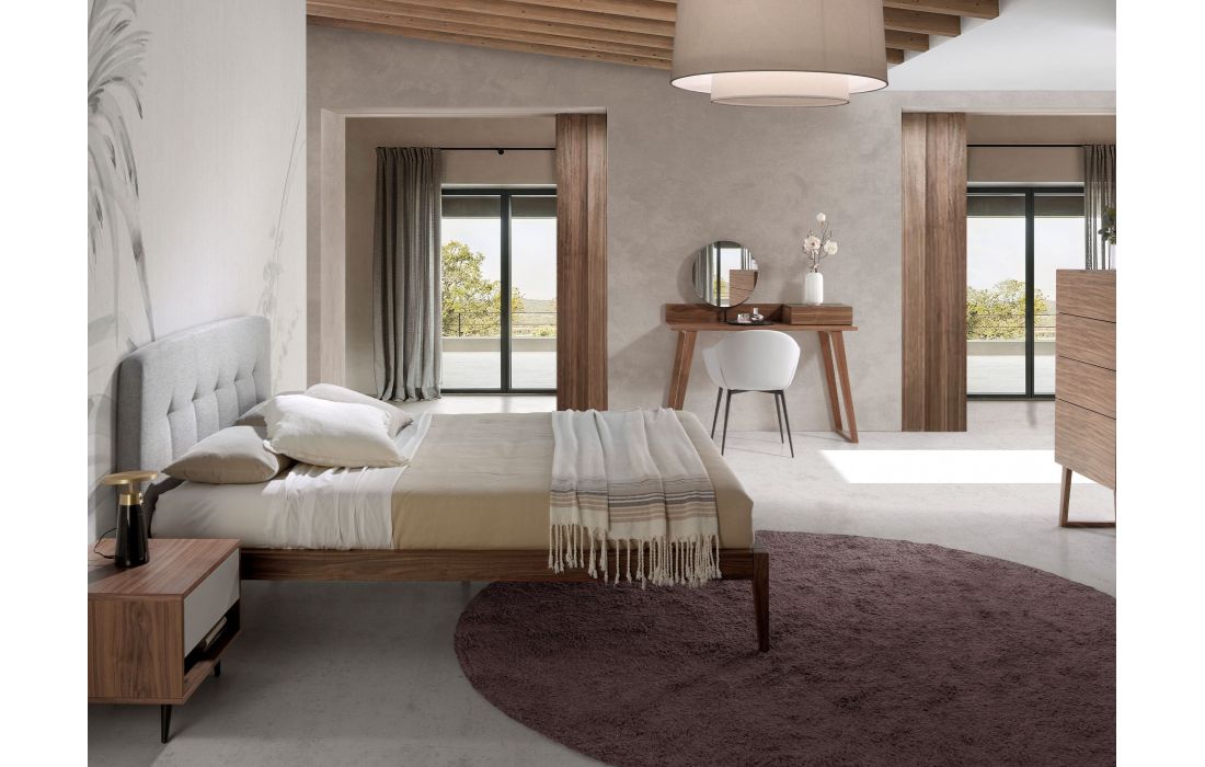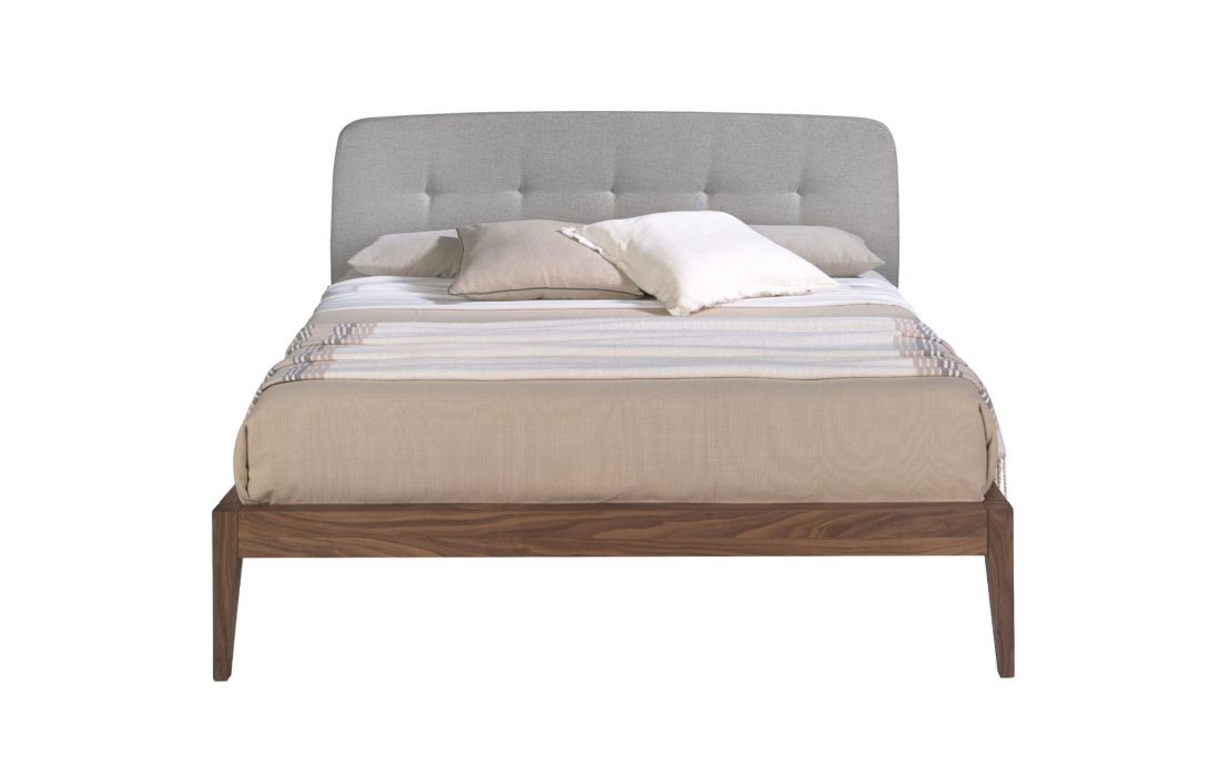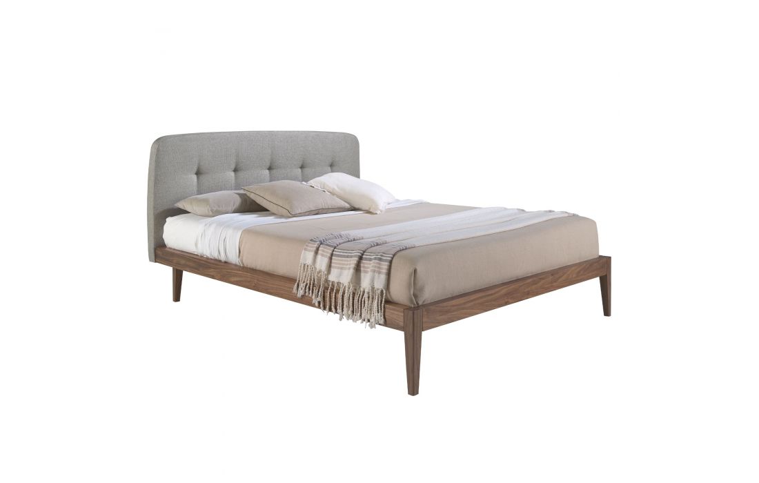 Cama de casal de design moderno com cabeceira em tecido cinza e estrutura em madeira folheada a nogueira natural. Inclui um estrado de várias ripas feito de madeira de pinho.