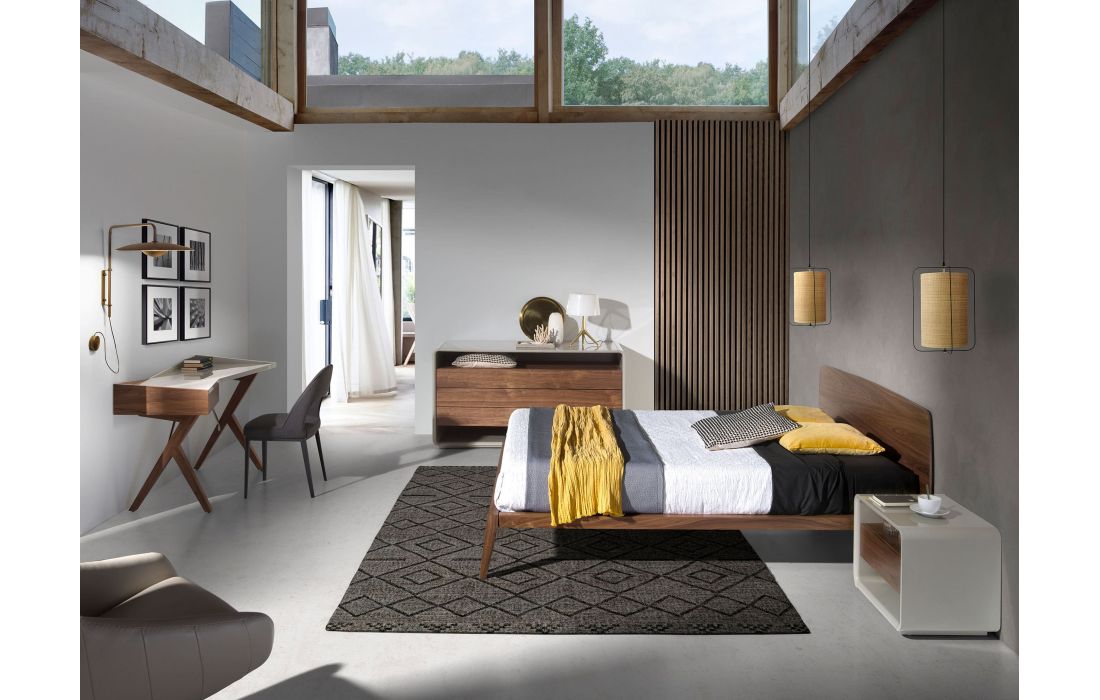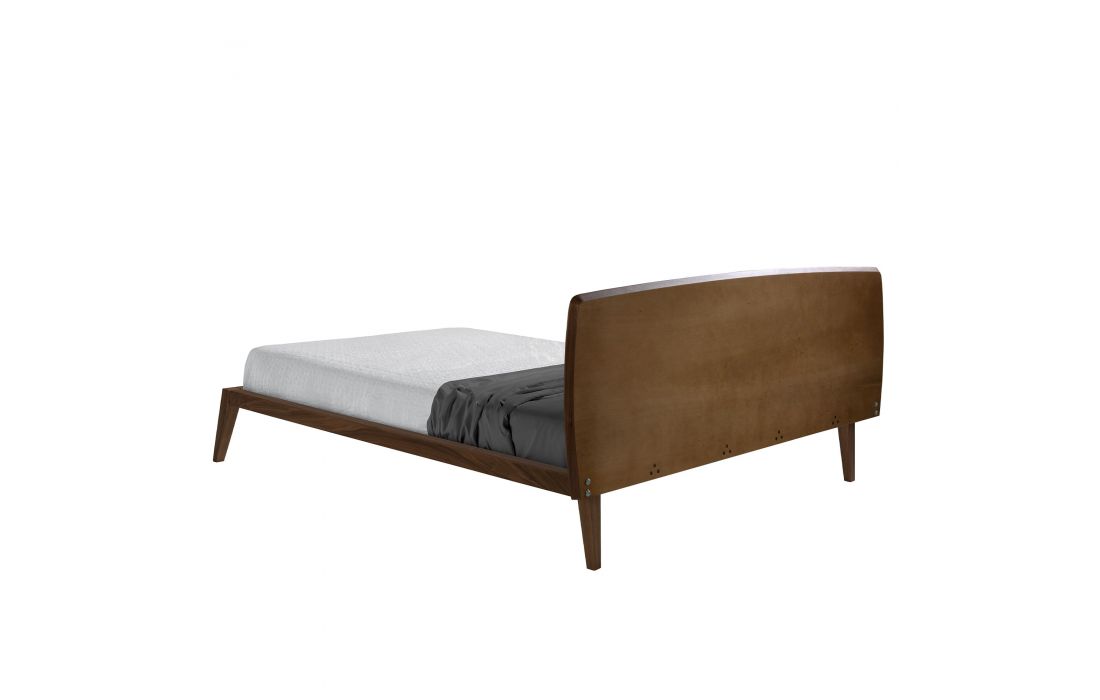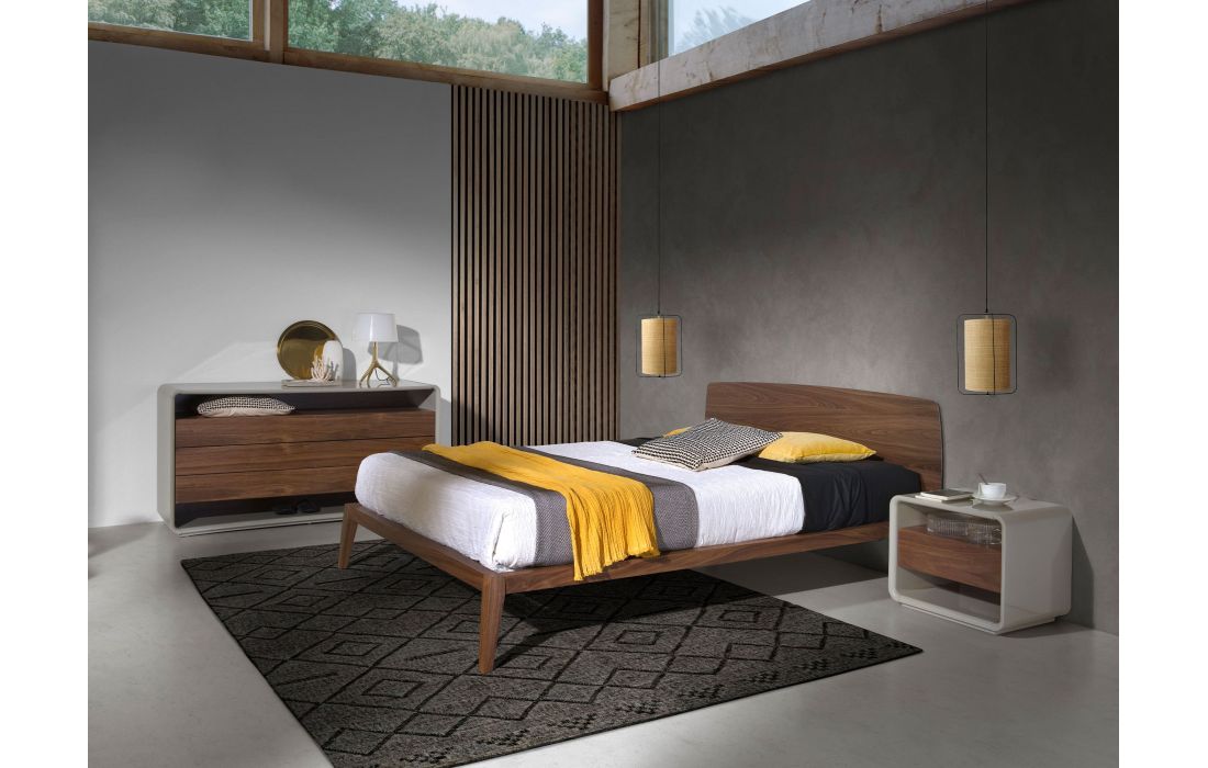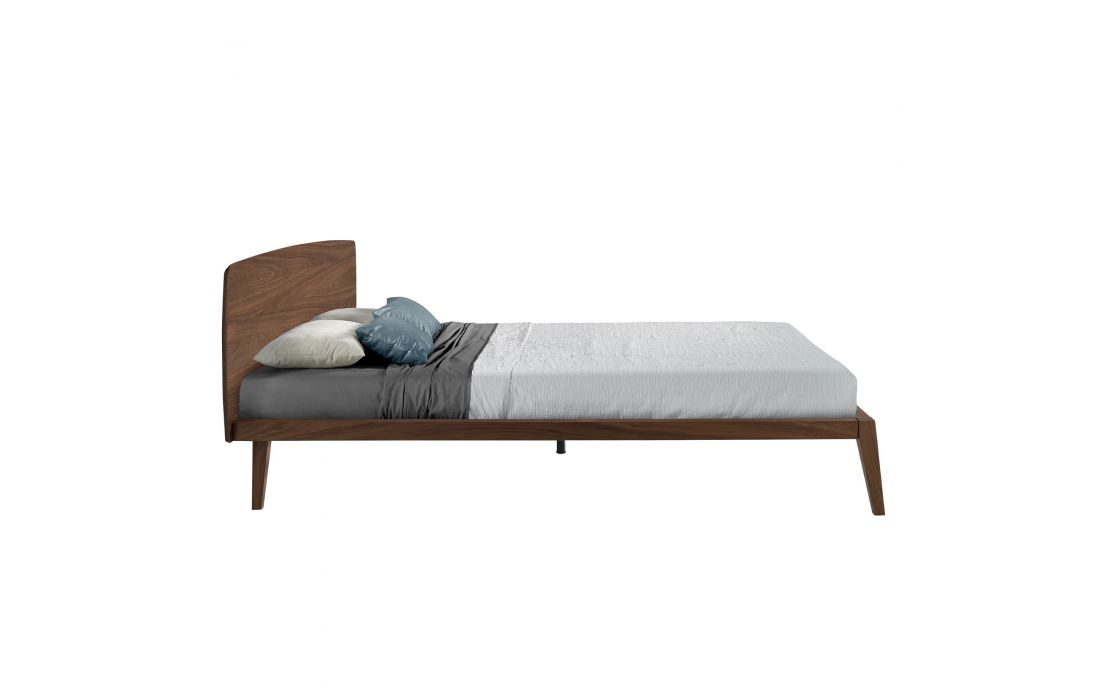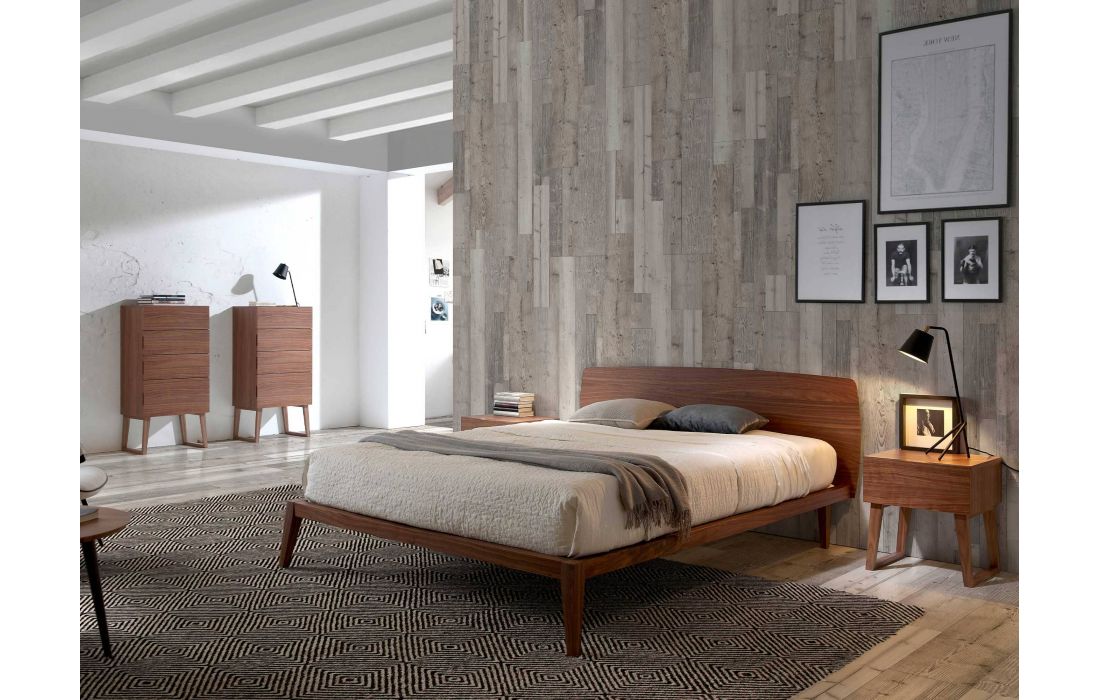Cama de casal de design moderno com cabeceira e estrutura em madeira folheada a nogueira natural.Inclui um estrado de várias ripas feito de madeira de pinho.