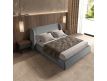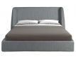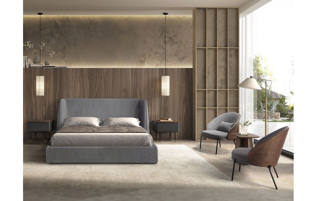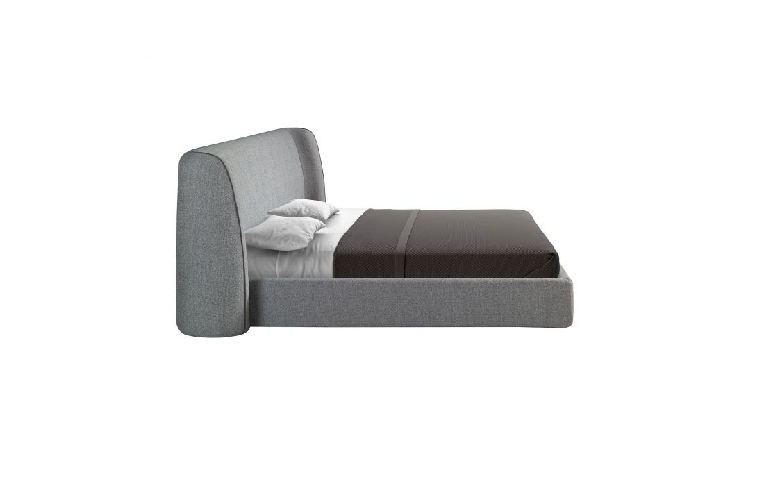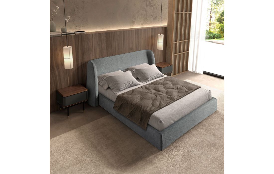 Cama de casal de design moderno com uma cabeceira original e estrutura em tecido e pernas em aço inoxidávelDestinatário :