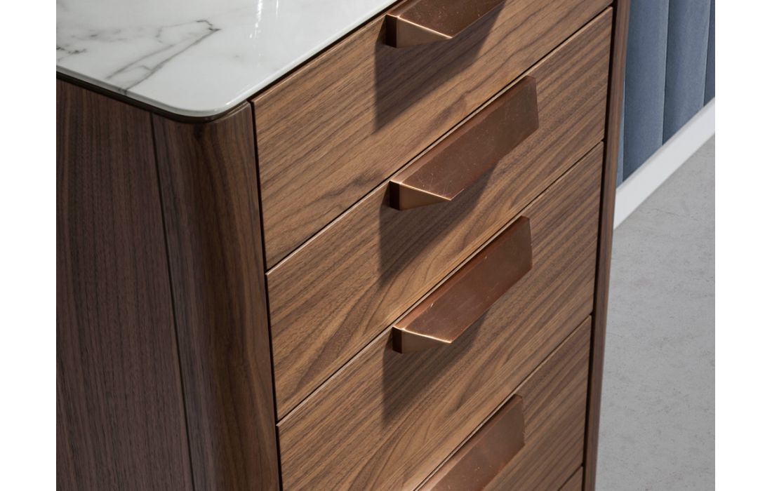 Camiseiro alto de 5 gavetas em madeira folheada com vidro imitação de mármore