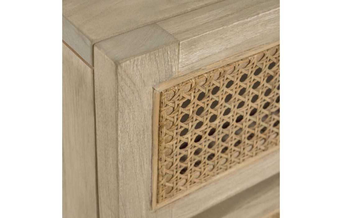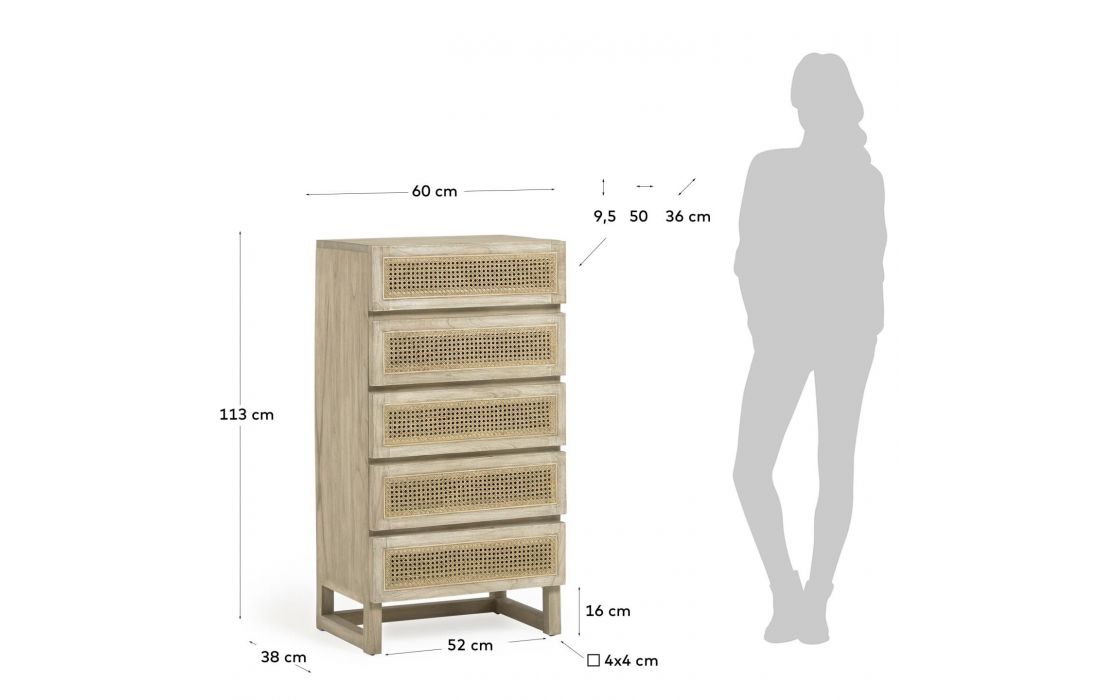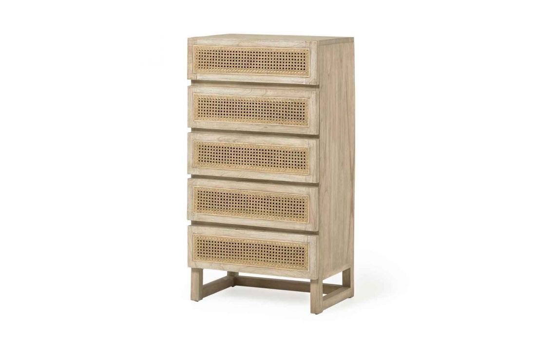 Camiseiro alto feito em madeira maciça de Mindi e palhinha com 5 gavetas.