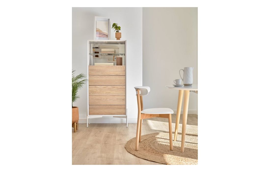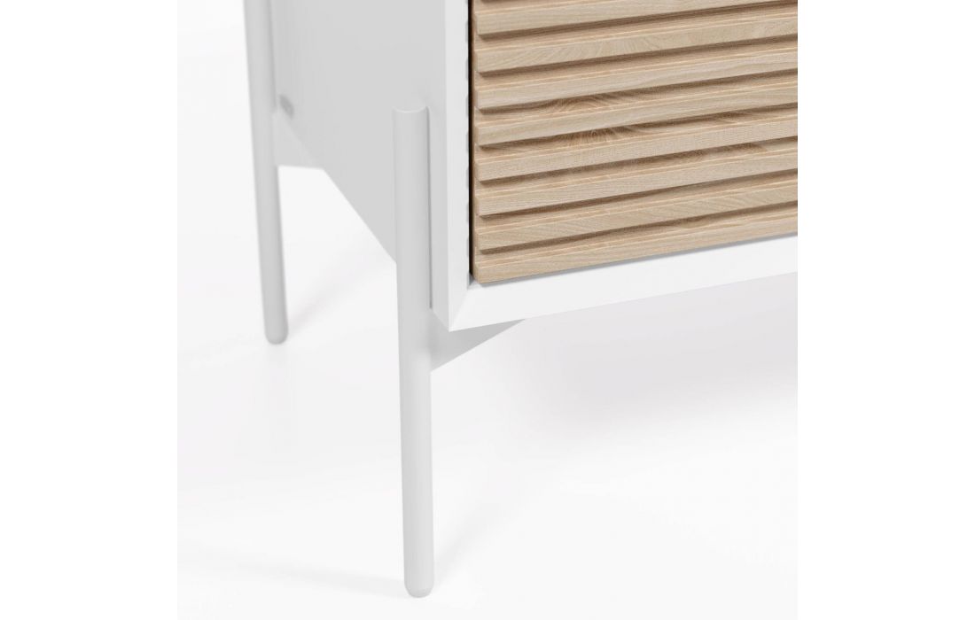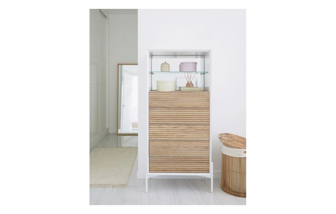 Camiseiro alto com 5 gavetas feito em mdf folheado a madeira de freixo e lacado branco com estrutura metalica pintada a branco