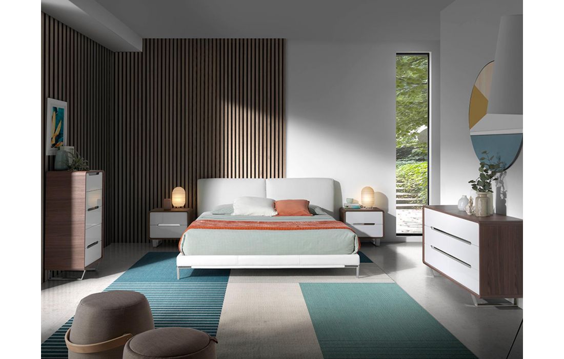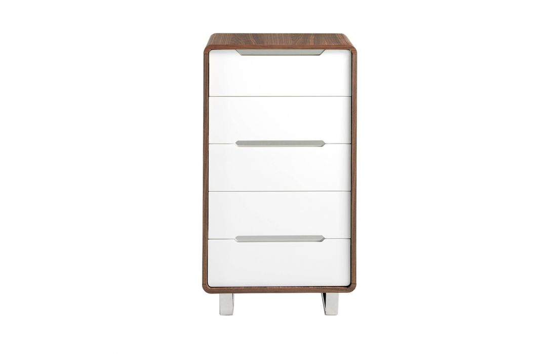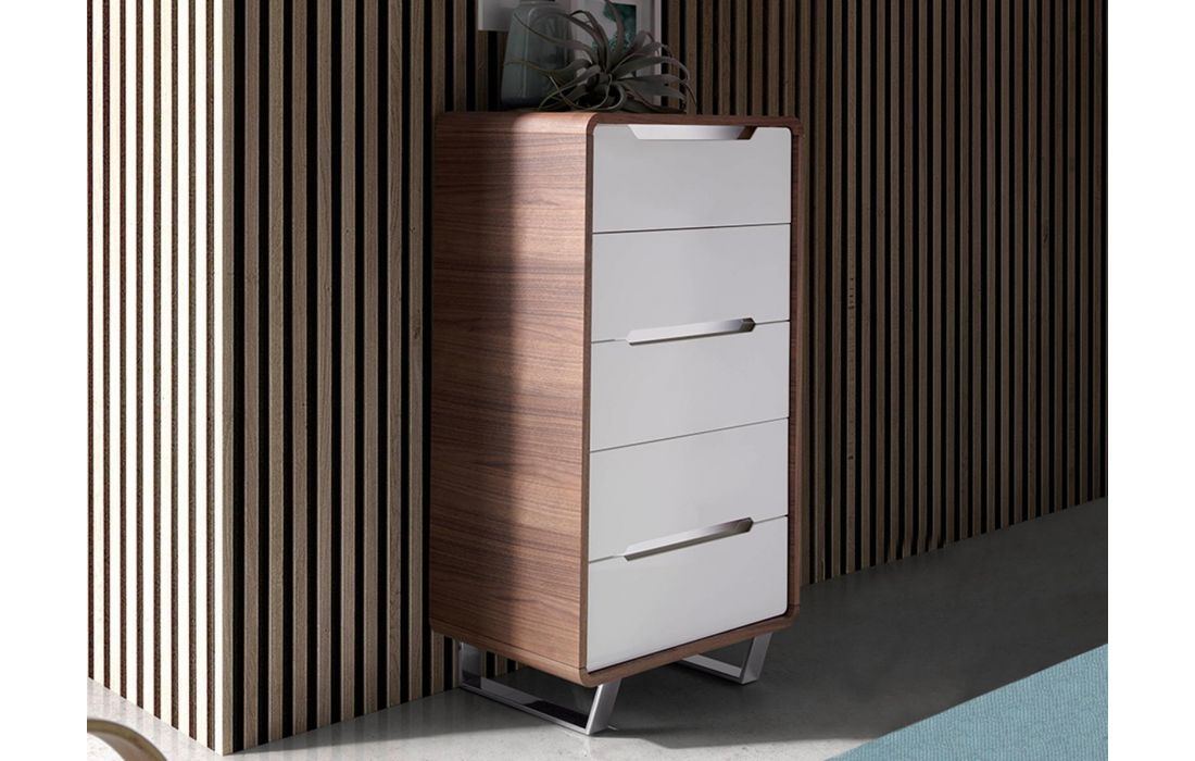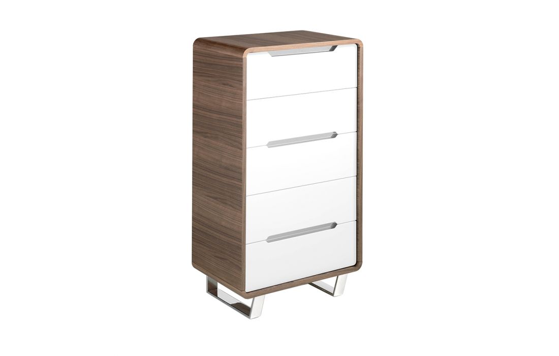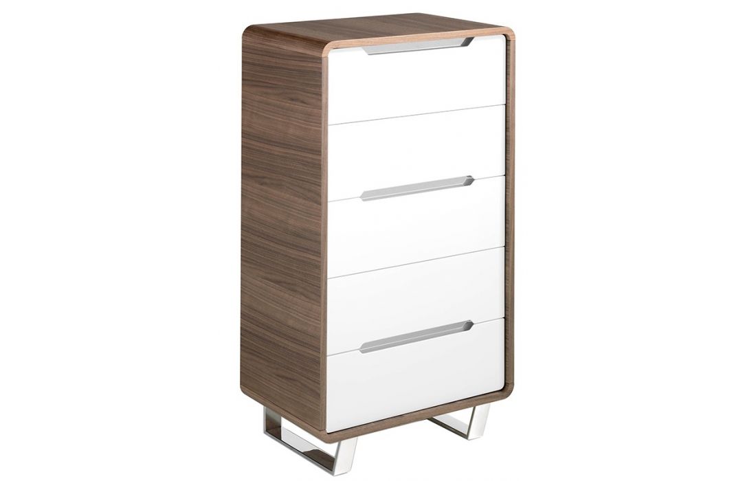 Camiseiro alto em madeira folheada a nogueira com cinco gavetas em MDF lacado branco brilhante. Pés e alças de aço inoxidável cromado.