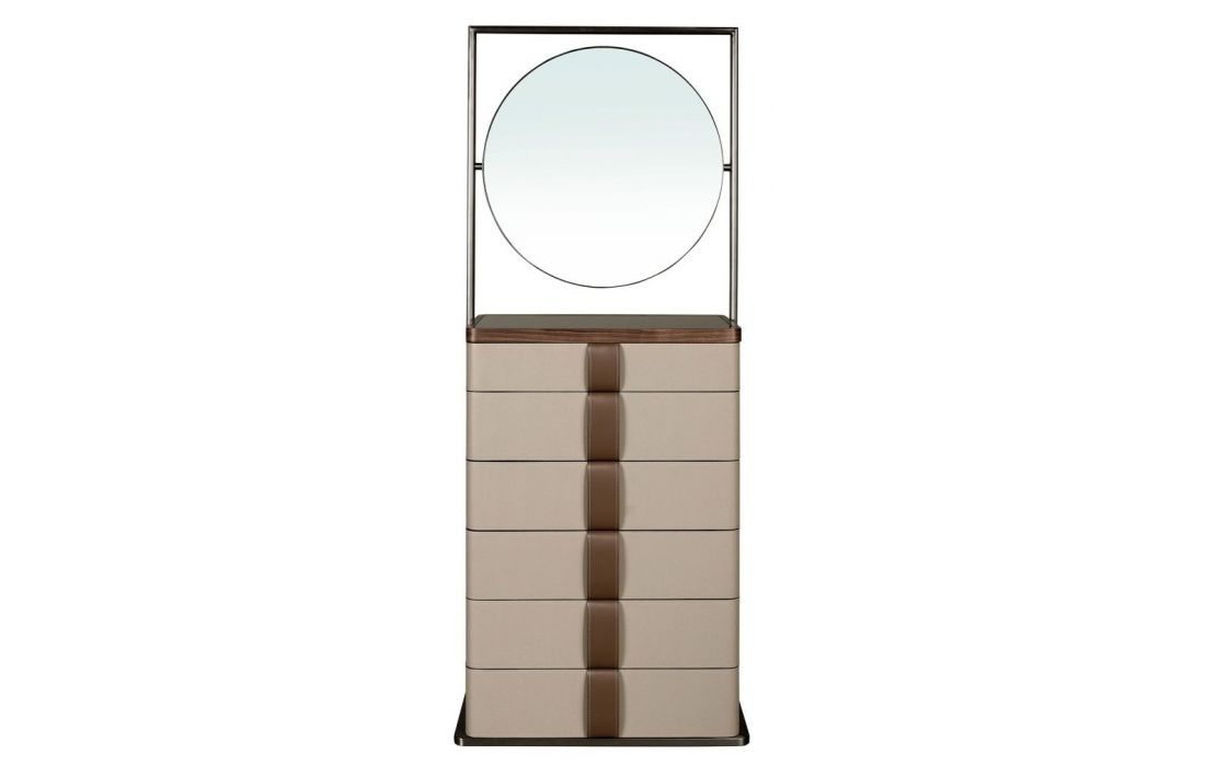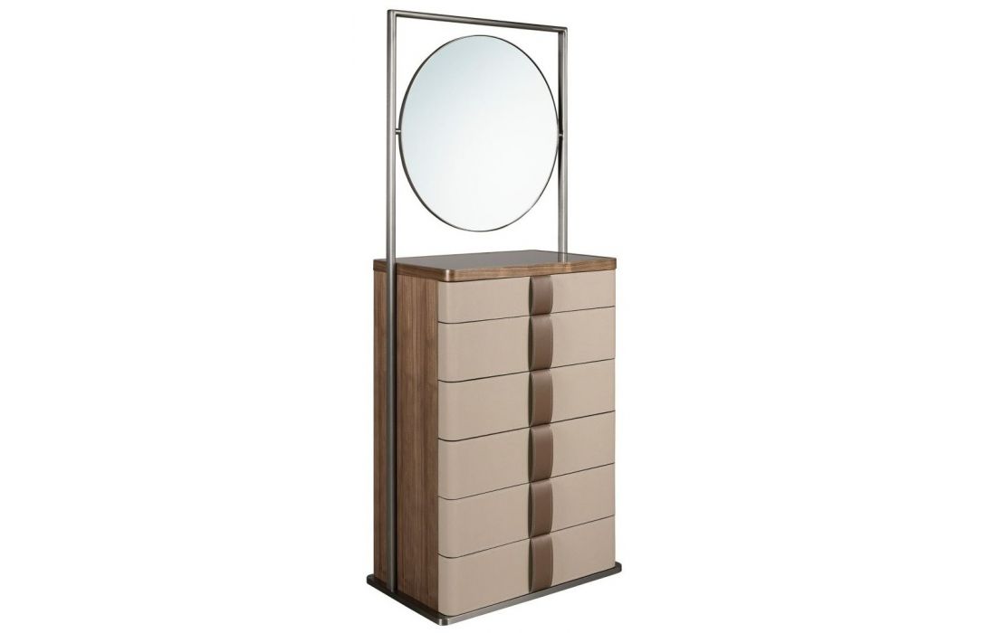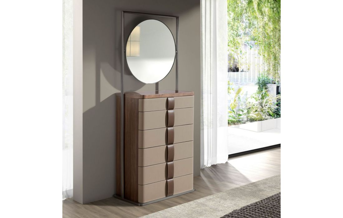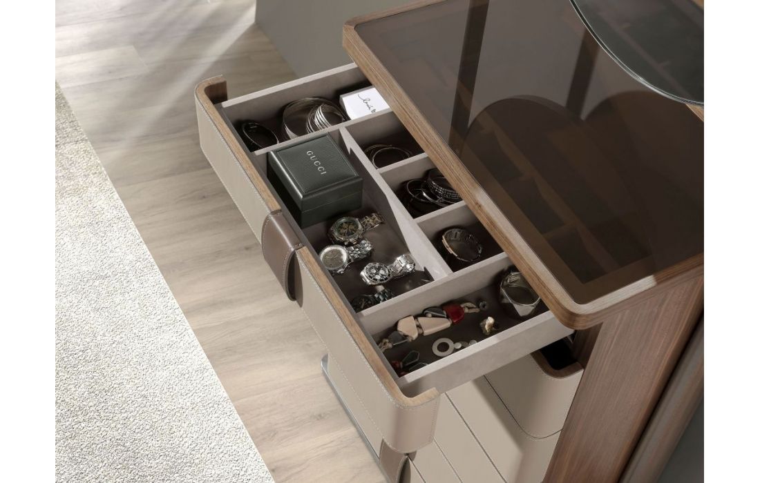 Camiseiro alto de design moderno com estrutura em folheado de nogueira natural, estofado em pele de bovino e base em aço inoxidável lacado a cinzento, um elegante tampo em vidro fumado castanho, conseguirá o aspeto sofisticado que procura nos seus ambientesDestinatário :
