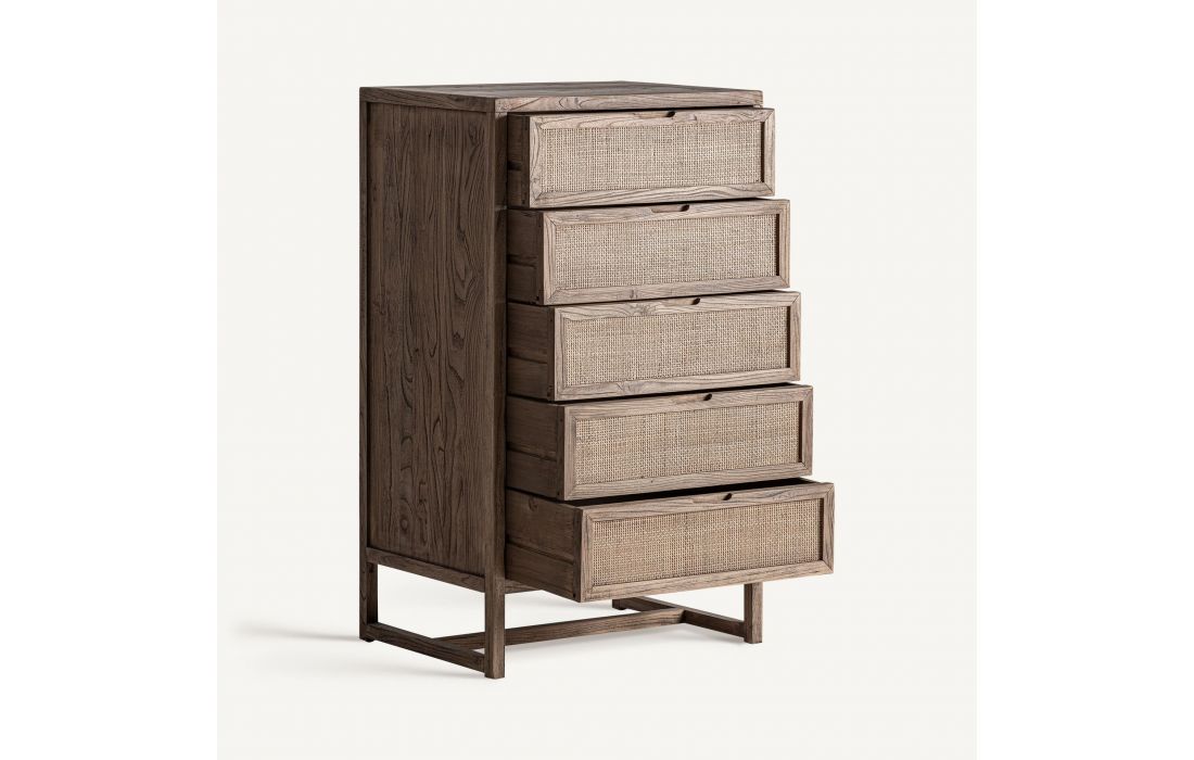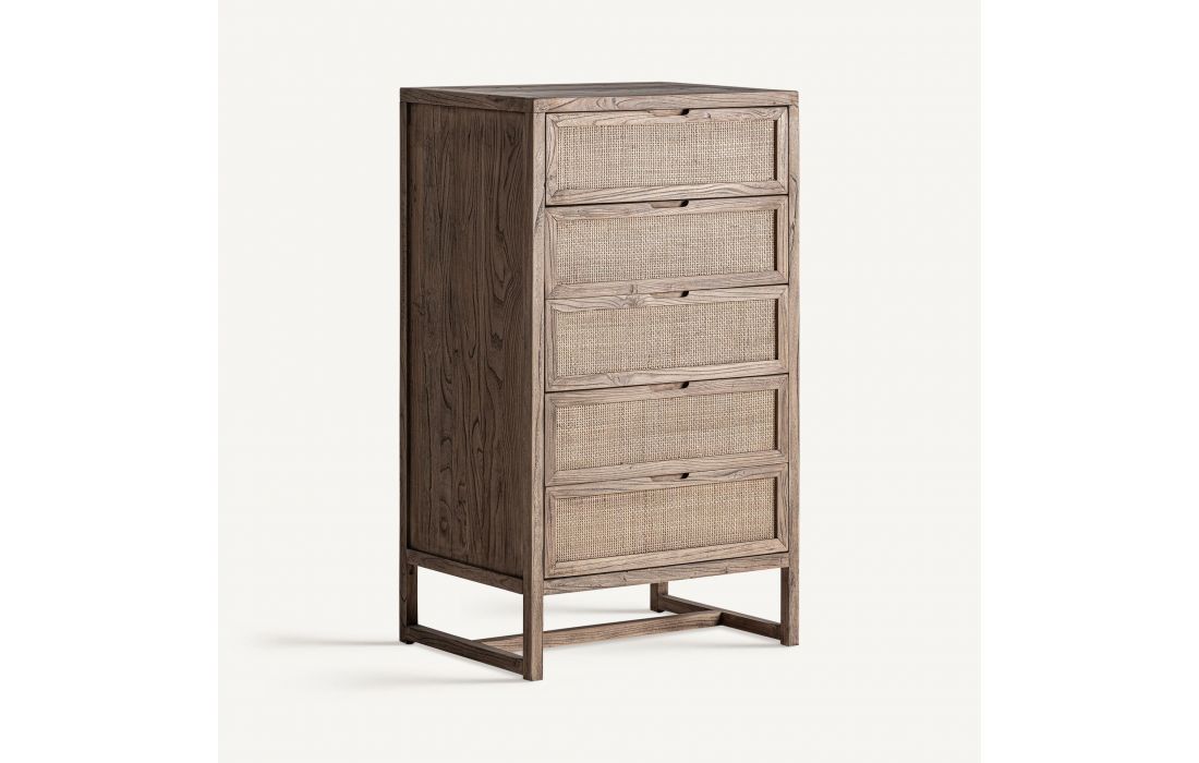 Camiseiro alto em madeira de olmo com detalhes em palhinha, de design elegante e leve. Com 5 gavetas, oferece ampla arrumação. Ideal para quartos, combina funcionalidade com um toque natural e contemporâneo.